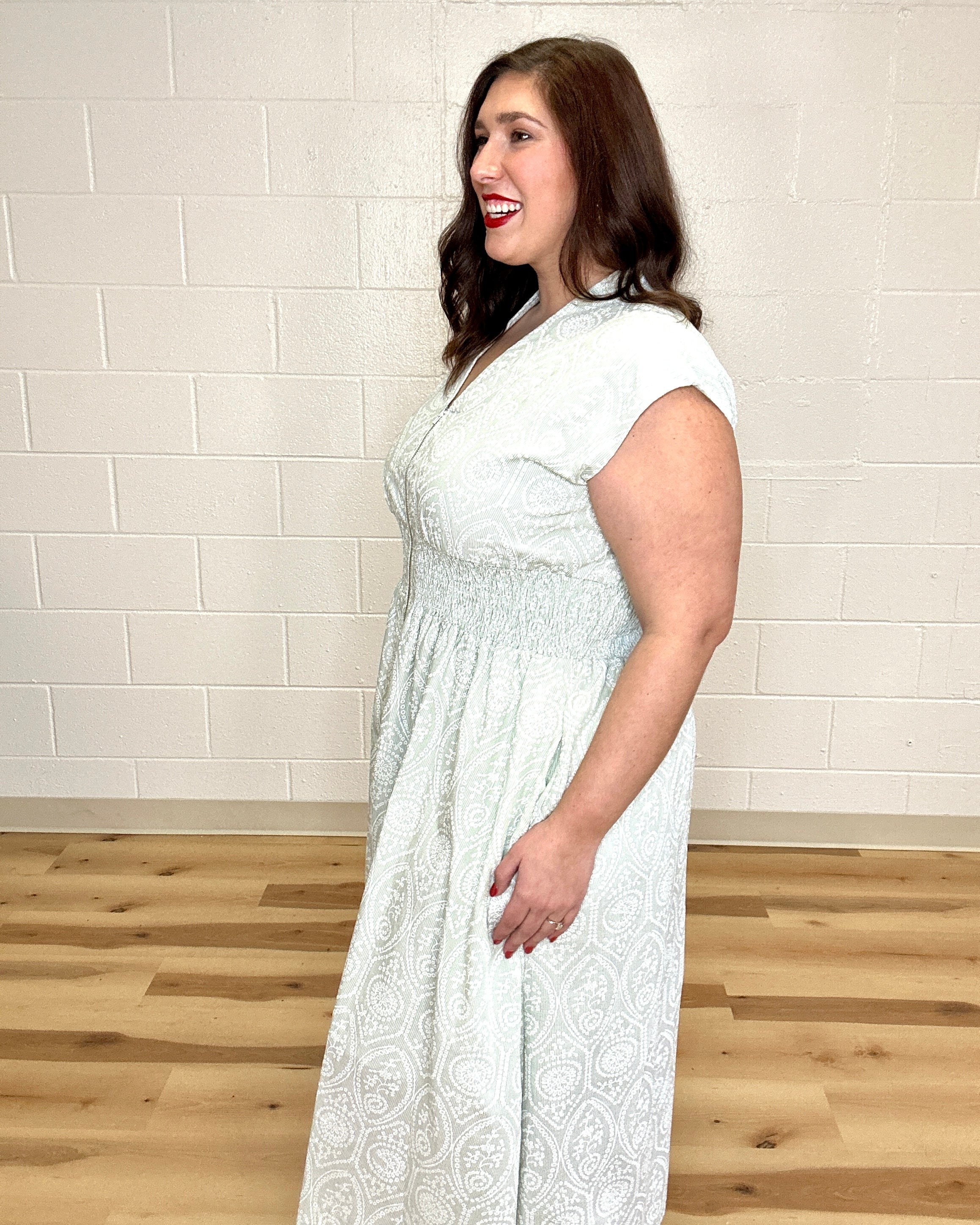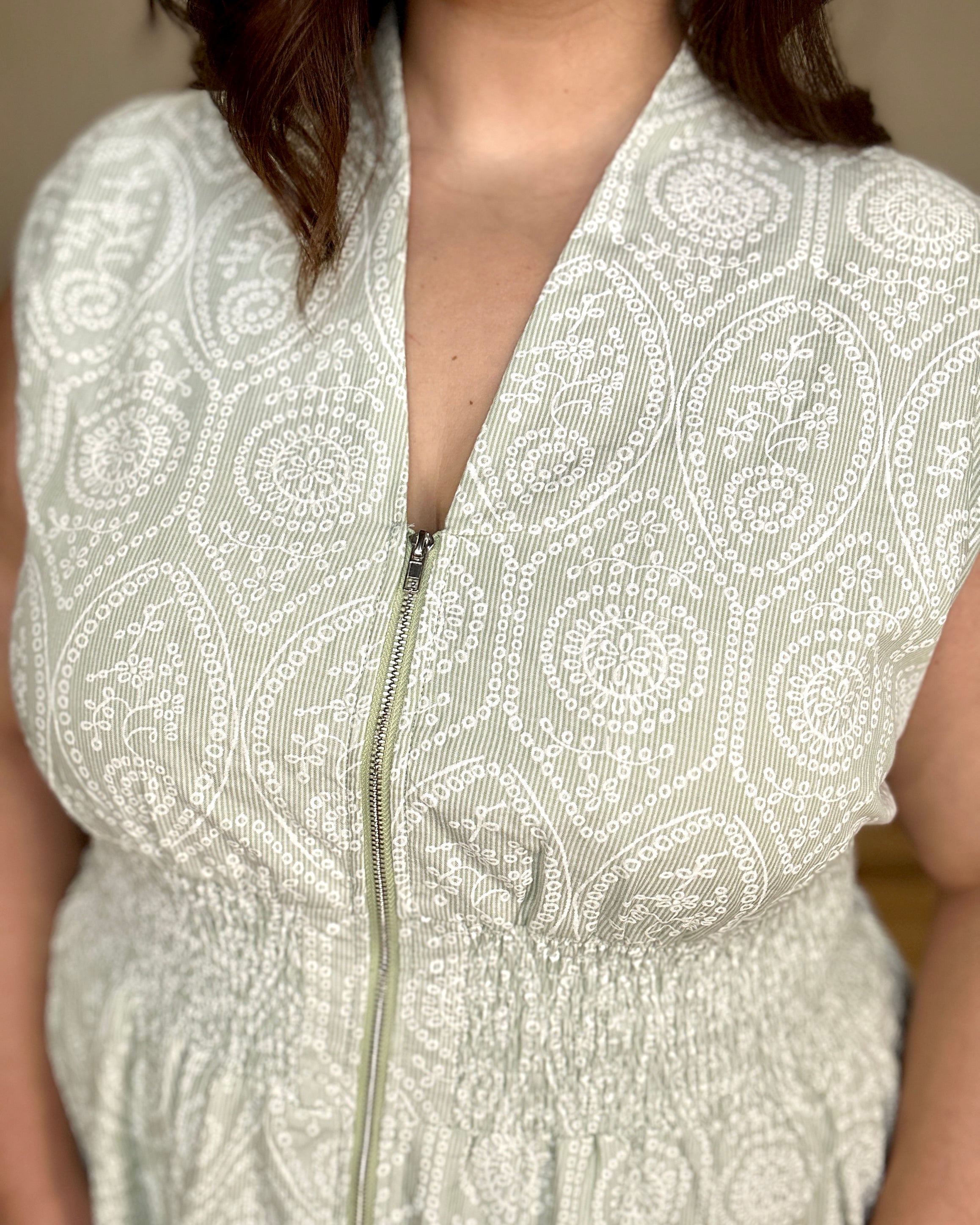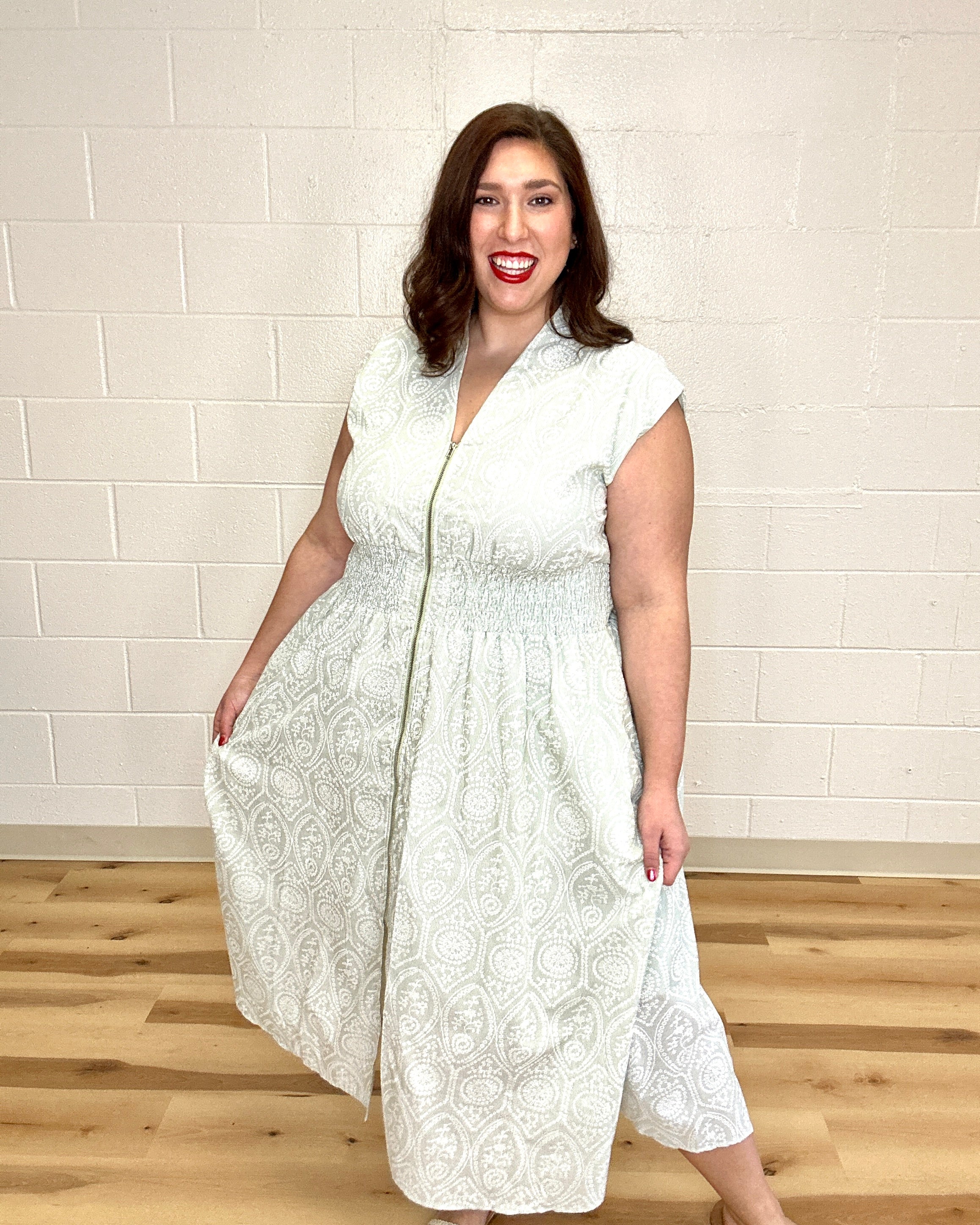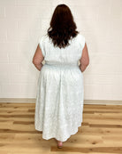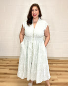 Effortless elegance meets practical style in this drop-shoulder midi dress. The smocked waist creates a flattering silhouette while the front zip closure offers easy layering versatility. Delicate eyelet print detailing adds refined texture, and functional pockets provide everyday convenience. Perfect for transitional seasons, this She+Sky dress balances feminine design with understated sophistication.