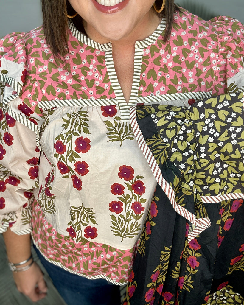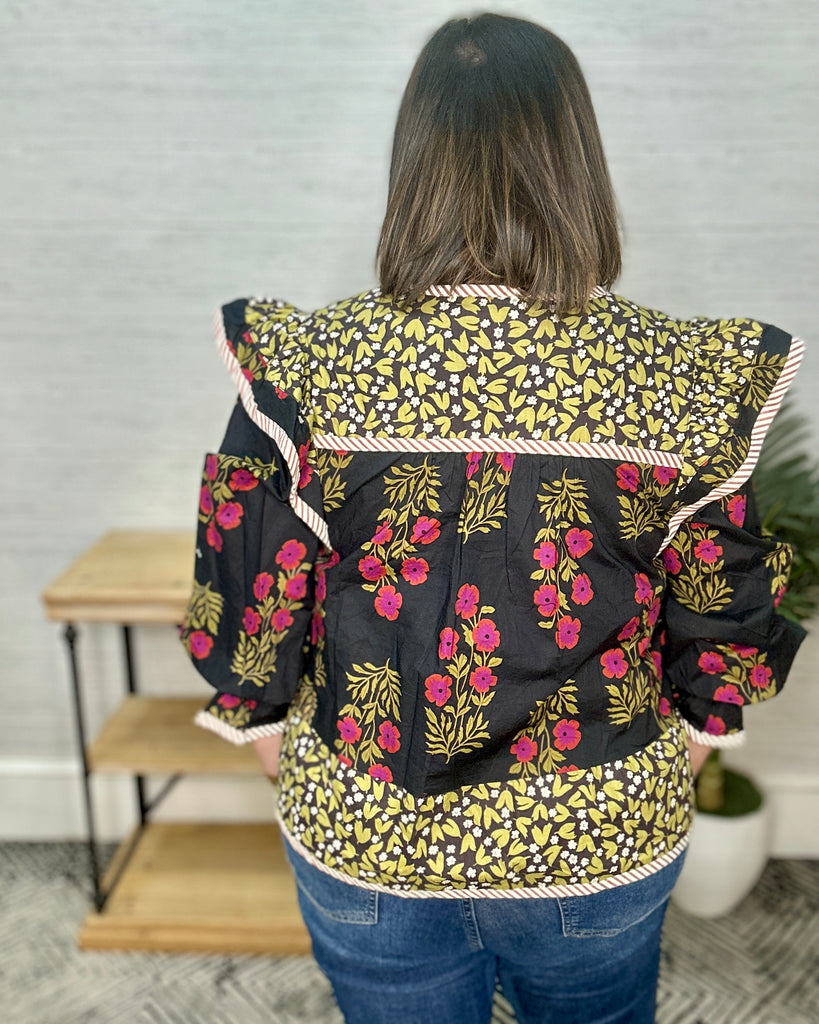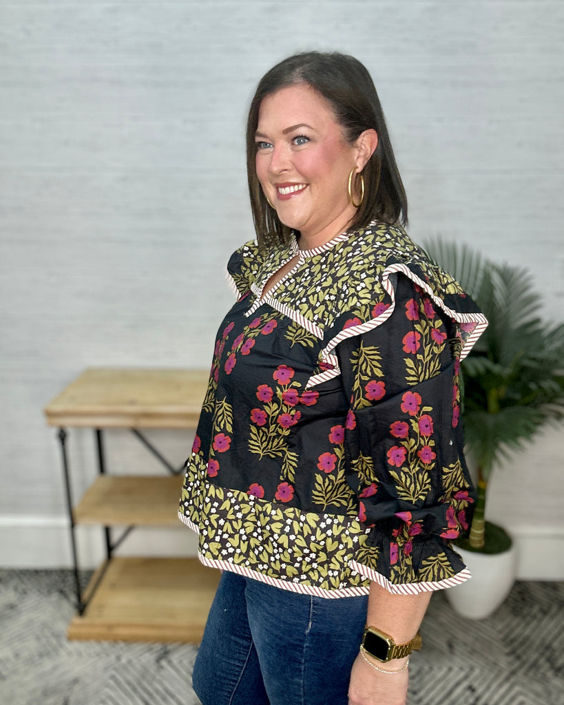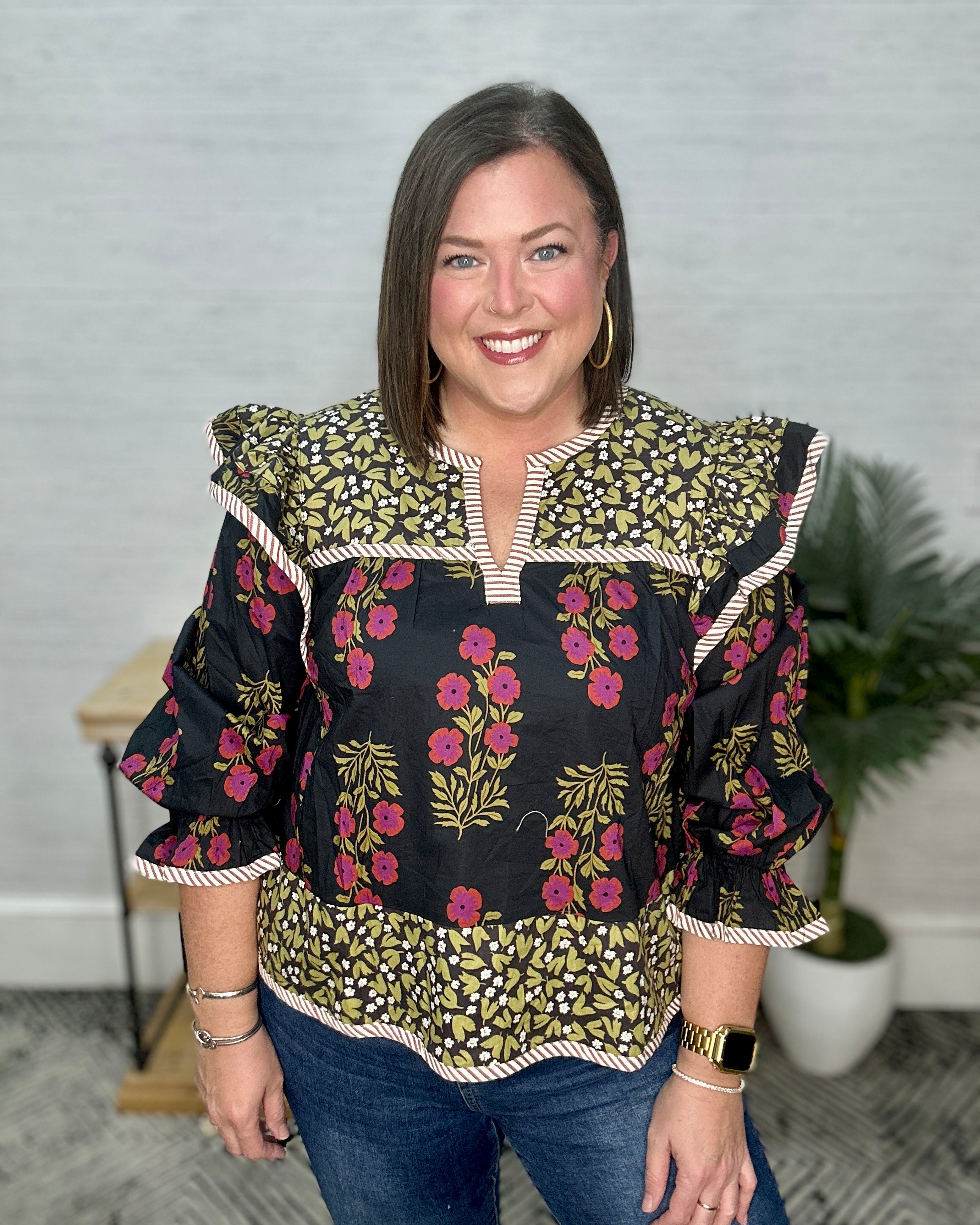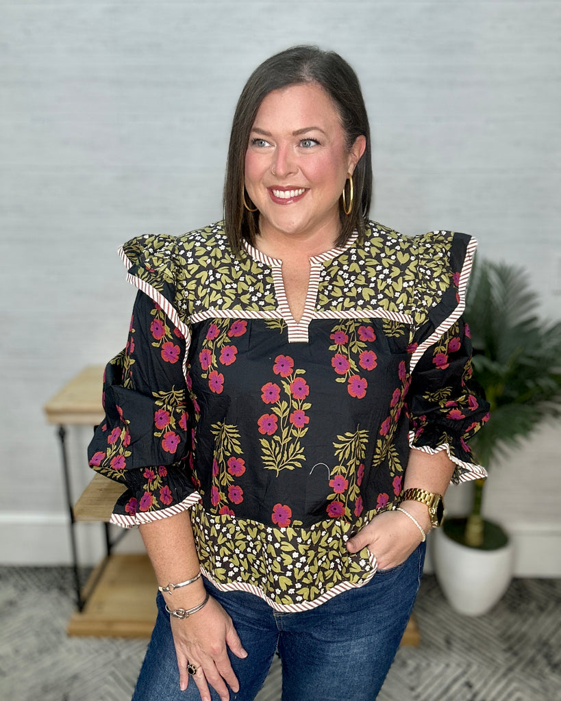Elevate your wardrobe with this long puff sleeve top by Entro, featuring a delicate multi-print ruffle accent on the shoulders and a striking striped contrast V-neck band. Crafted from lightweight woven fabric, this unlined, non-sheer piece offers both comfort and refined style, perfect for sophisticated everyday wear.