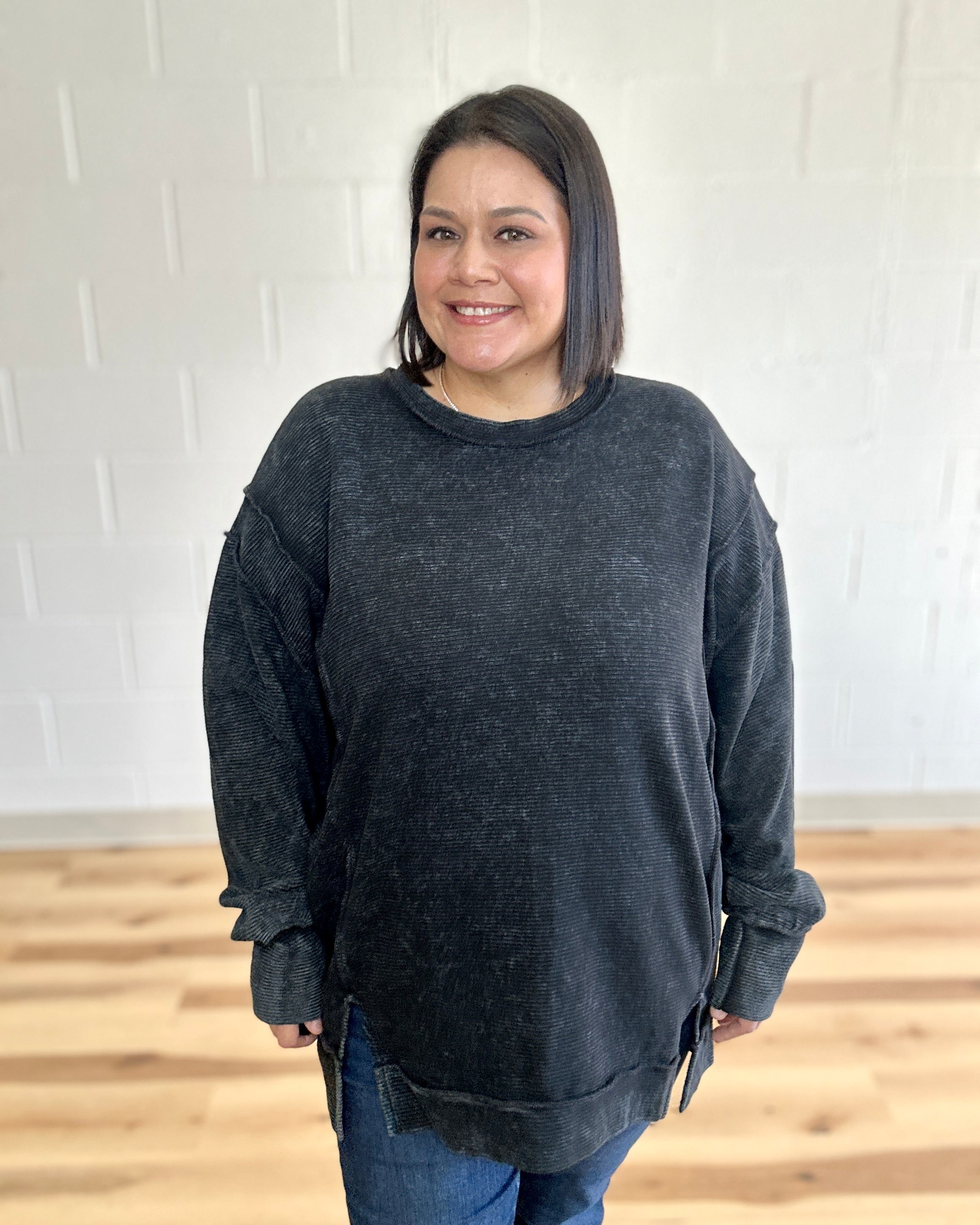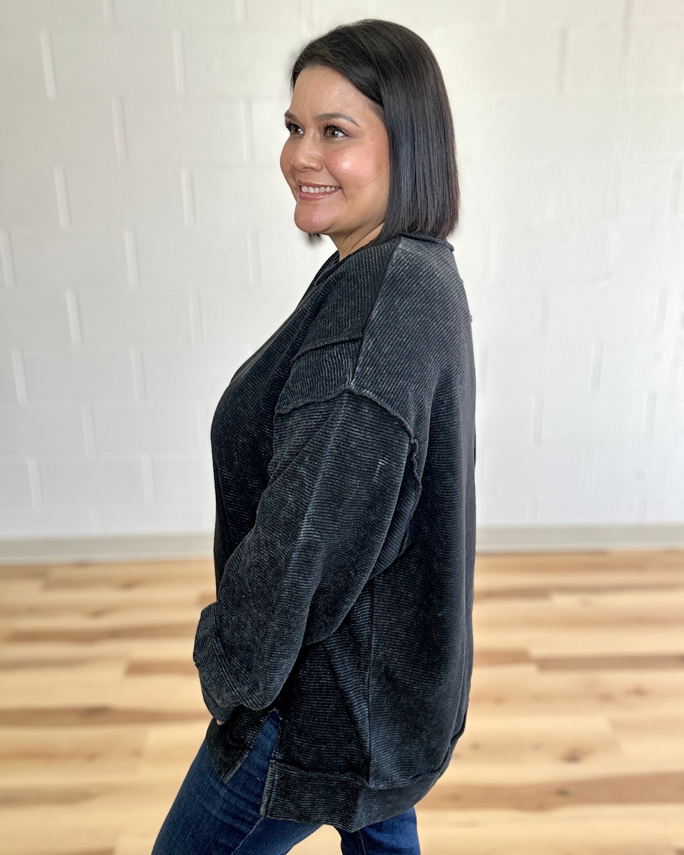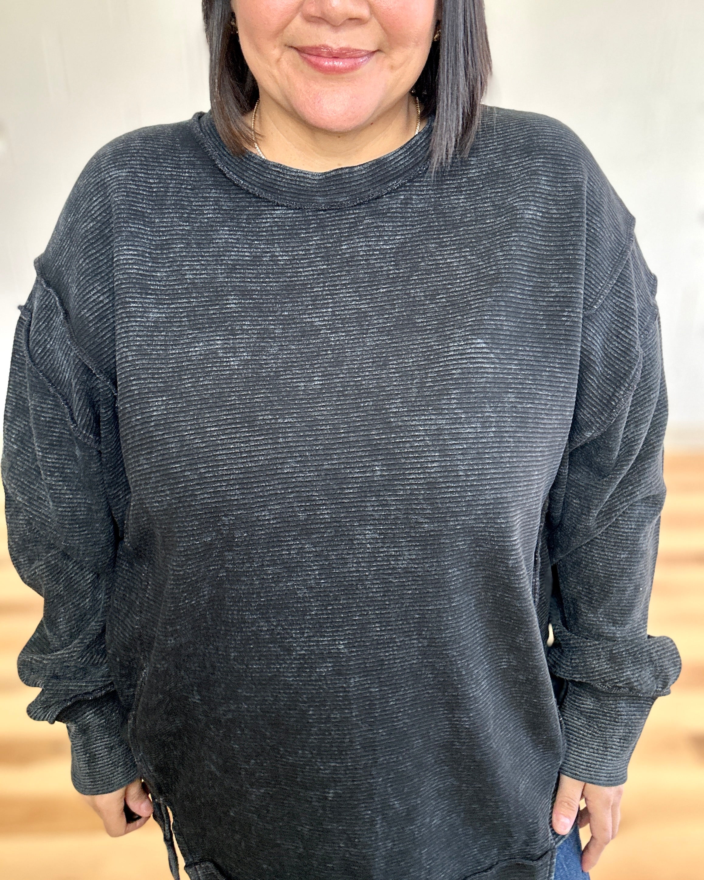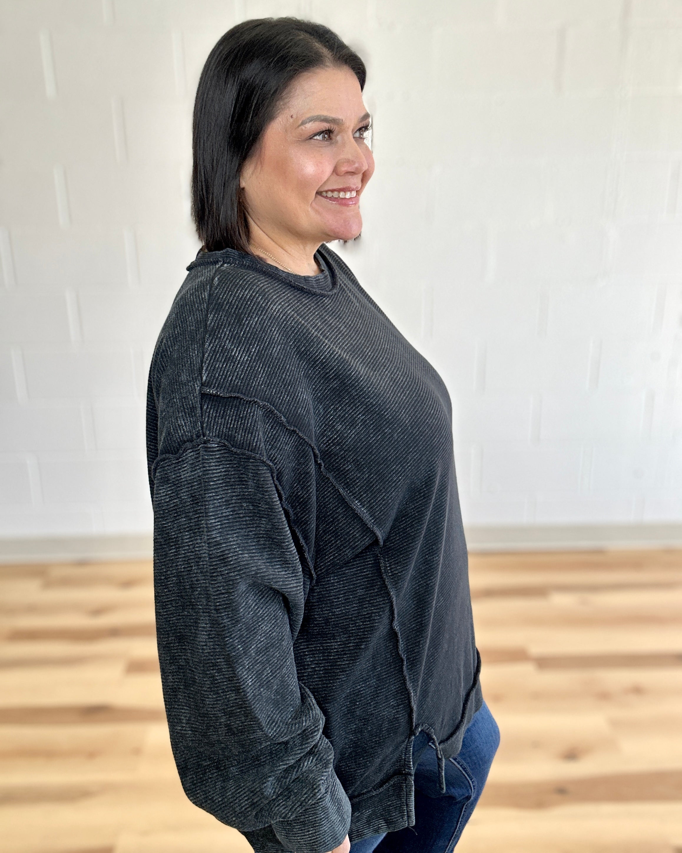 Meet your new go-to pullover—a playful twist on classic comfort. This black beauty features bold exposed-seam details and a cheeky back patch that prove quality fabric deserves to be seen. The acid-washed finish gives it that effortlessly cool vibe, while the hi-low hem keeps things interesting. Crafted from 100% cotton ottoman double knit, it's soft enough to live in but structured enough to actually look put-together. Layer it, style it solo, or throw it on when you can't decide—this piece does it all with personality to spare.