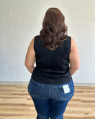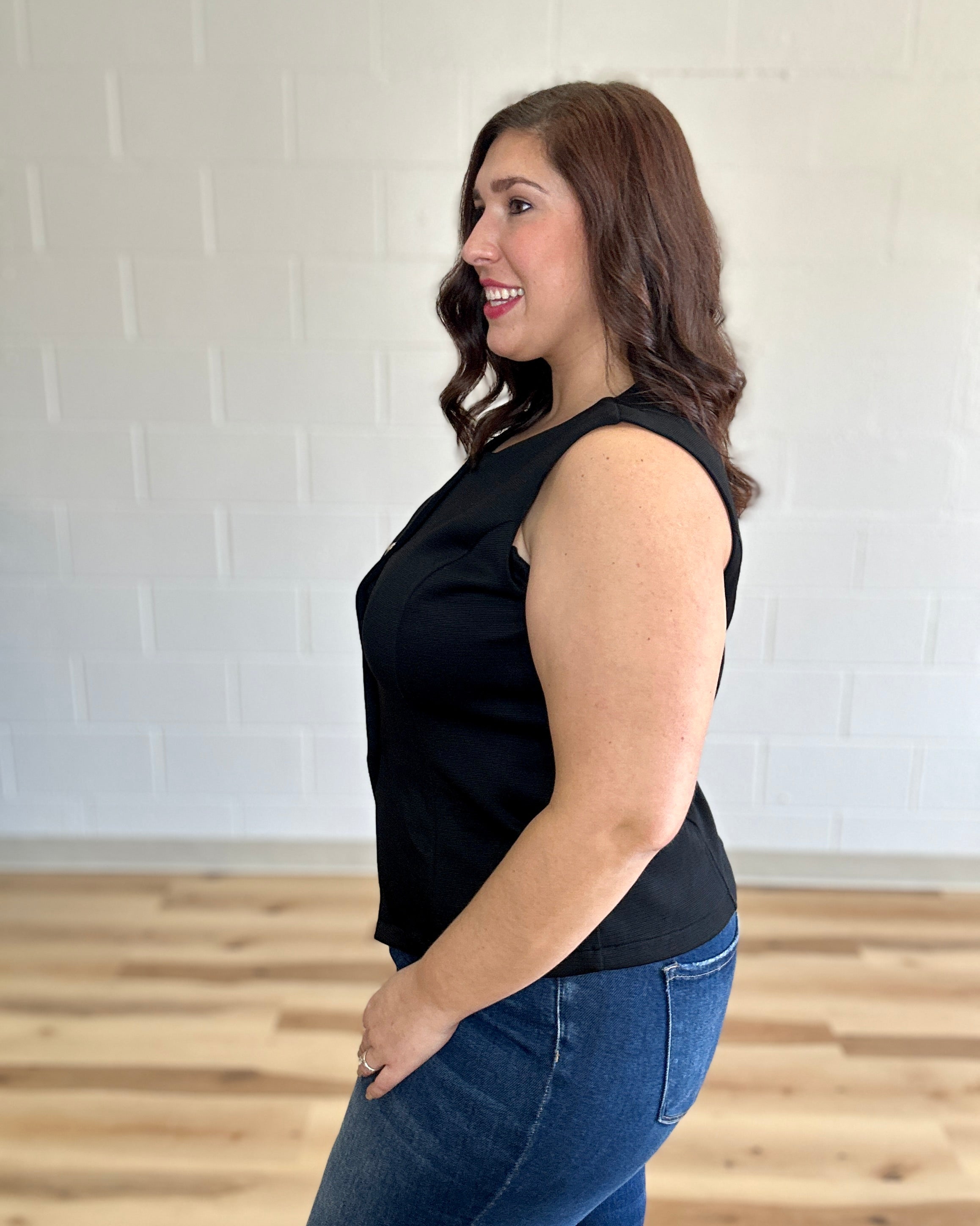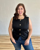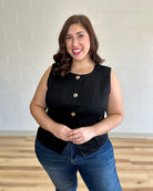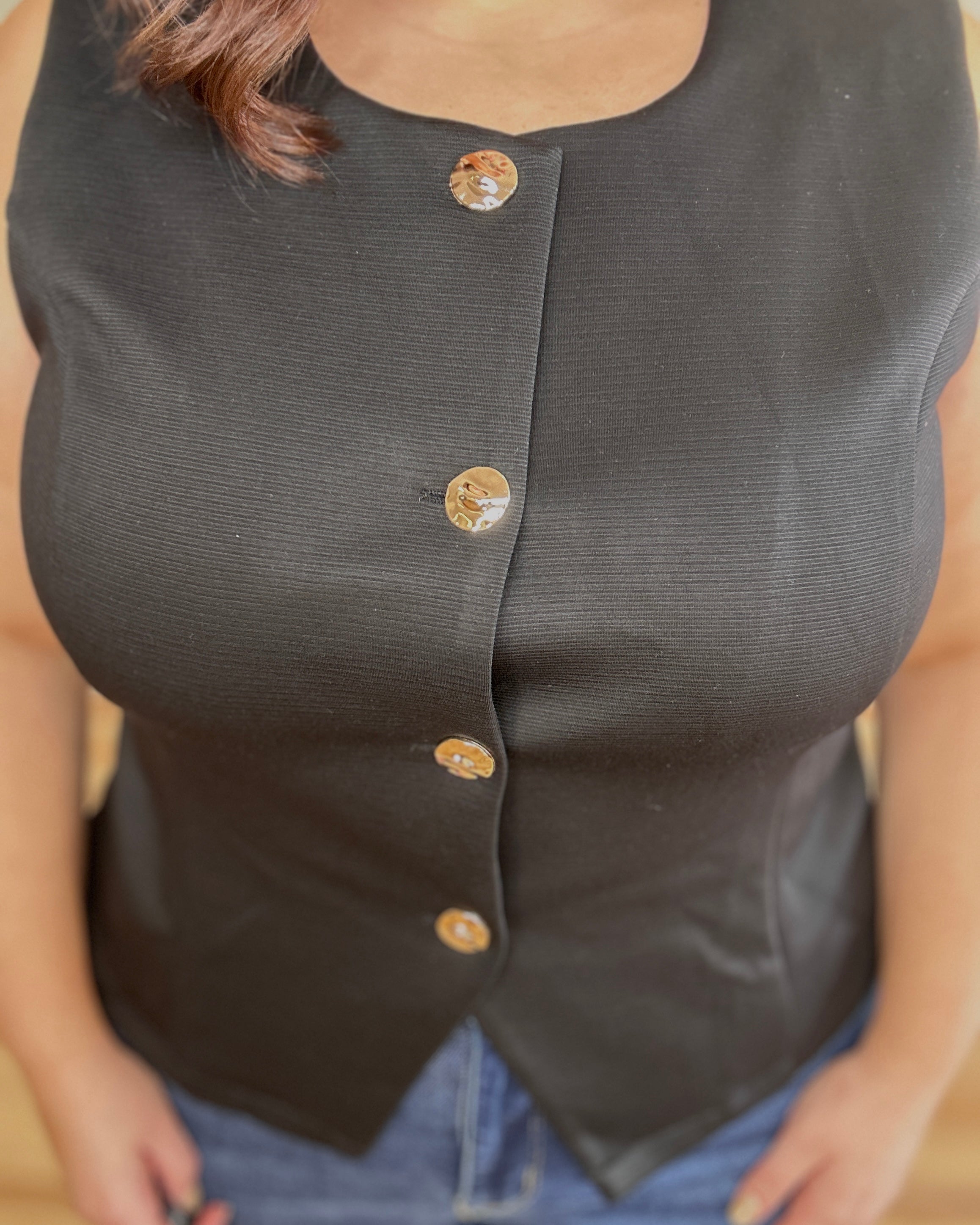 Indulge in luxury with our black sleeveless knit vest, featuring hammered gold buttons for a touch of refinement. Elegant and versatile, this vest adds a layer of sophistication to any outfit. Crafted with the finest materials, it's a must-have for the fashion-forward individual.