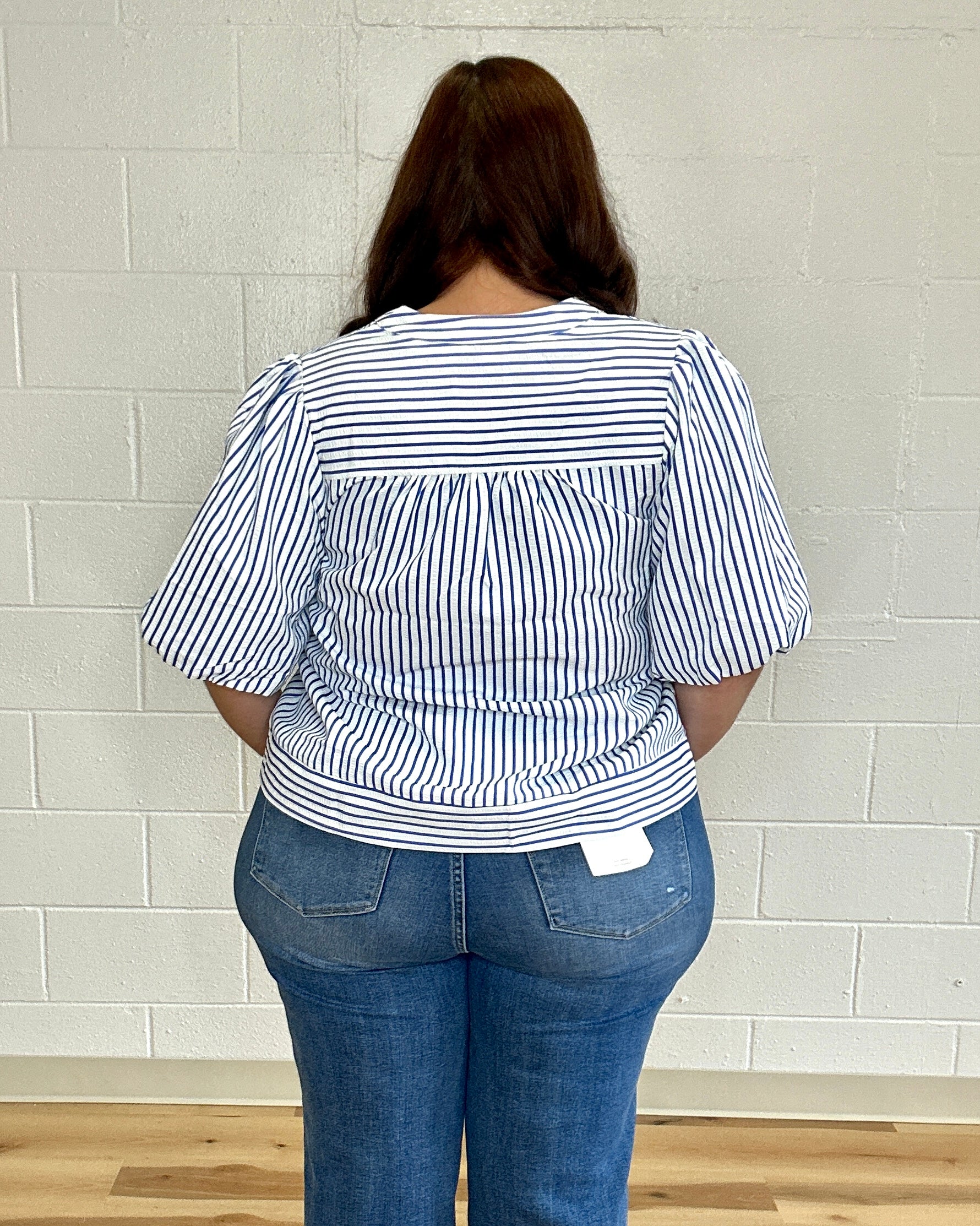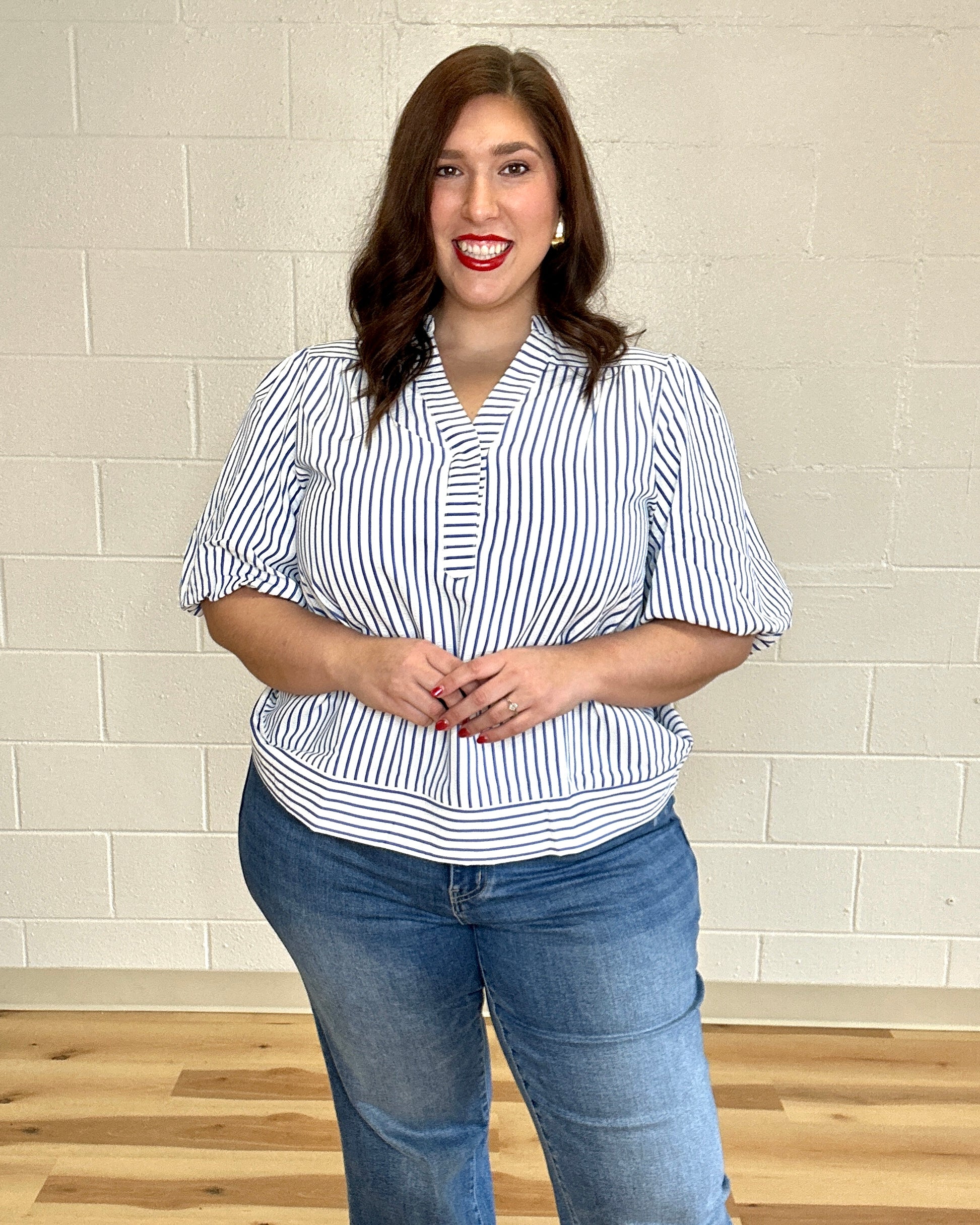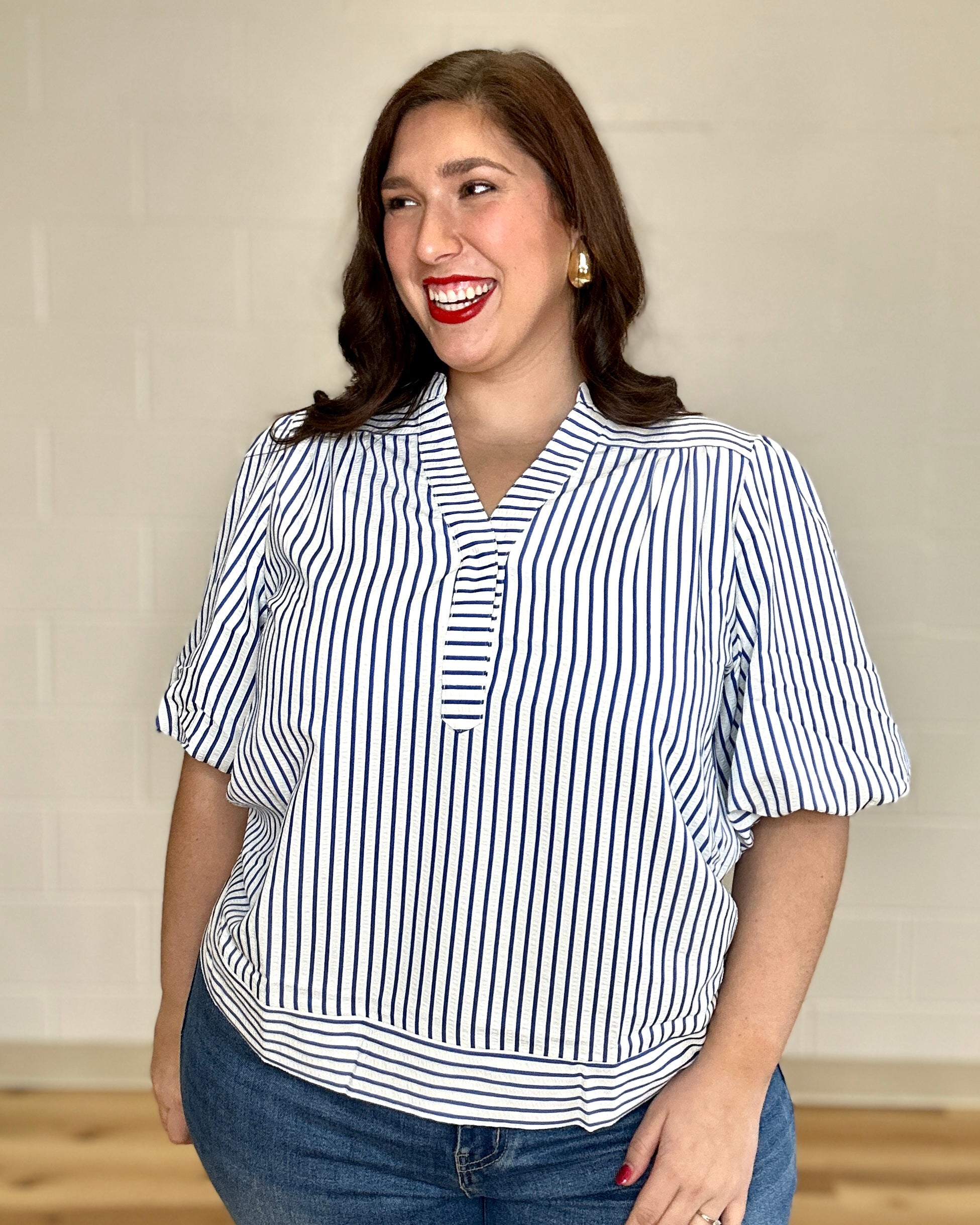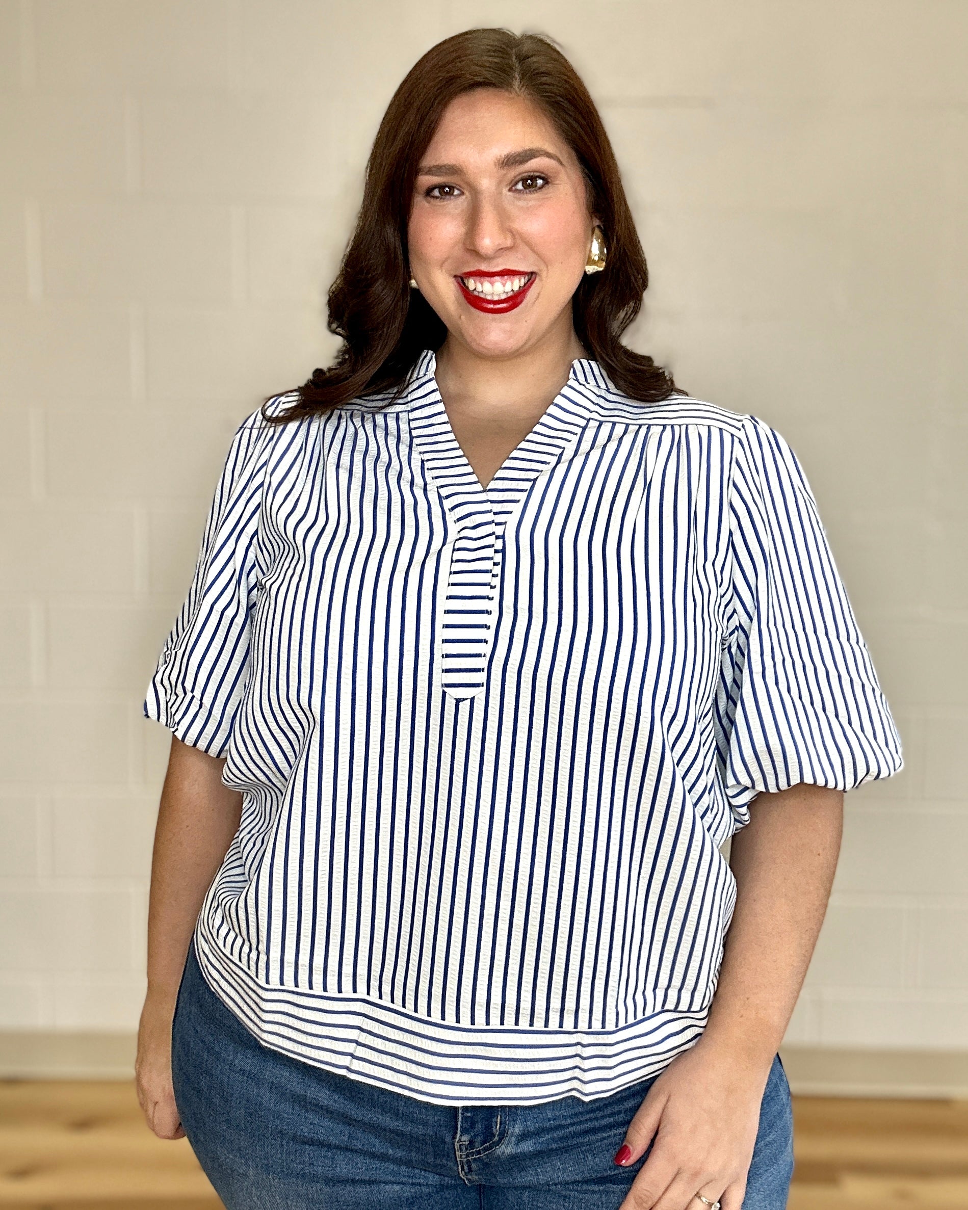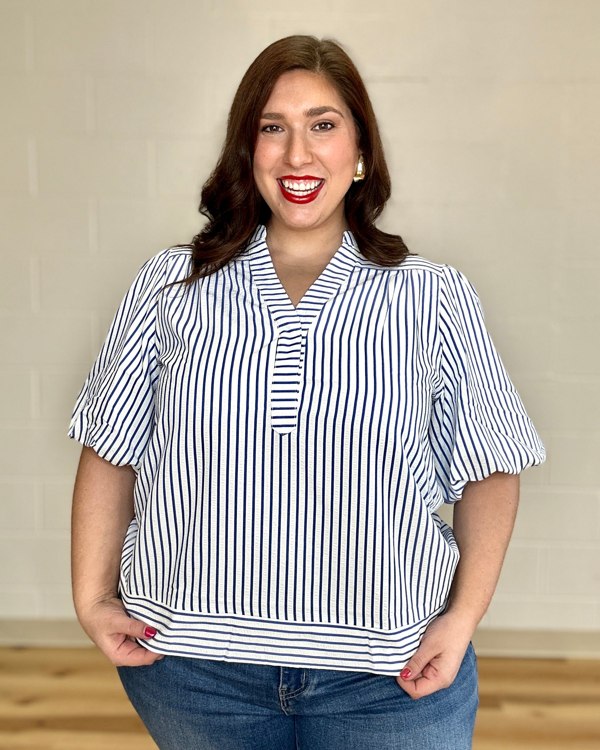 Elevate your wardrobe with this She+Sky bubble sleeve top, featuring a sophisticated v-neck and refined striped pattern. The textured fabric adds visual depth and tactile interest, creating dimension that works beautifully layered or worn solo. The voluminous bubble sleeves deliver contemporary style while maintaining everyday wearability. A versatile piece that transitions seamlessly from casual to polished occasions.