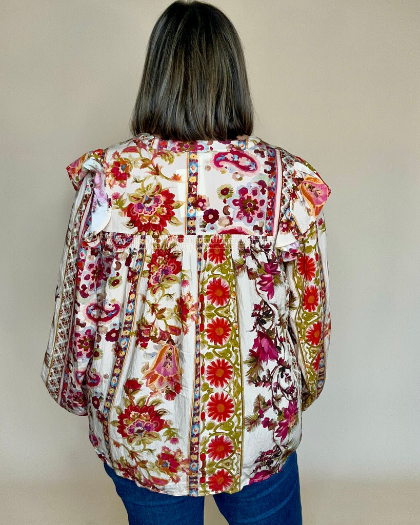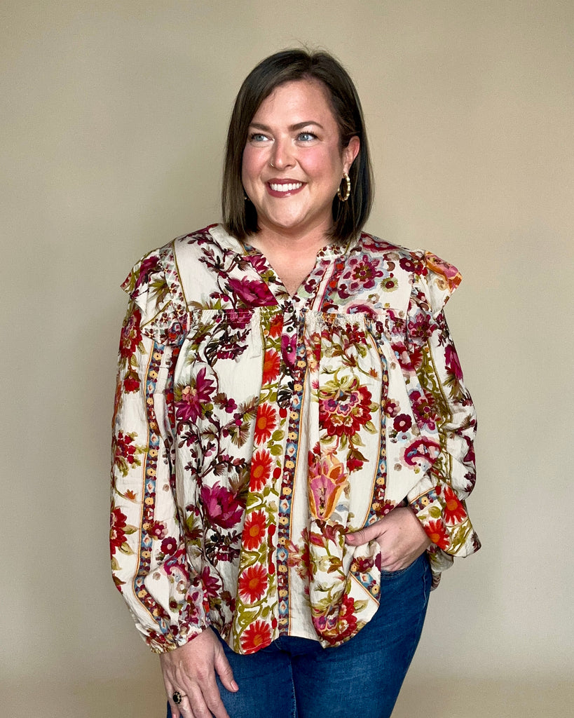 Embrace timeless elegance with this floral printed peasant blouse from Oddi. Featuring a delicate ruffled yoke and gracefully pleated balloon sleeves, it offers a refined silhouette that blends romantic charm with subtle sophistication. Perfect for elevating both casual and formal ensembles with a touch of effortless style.
