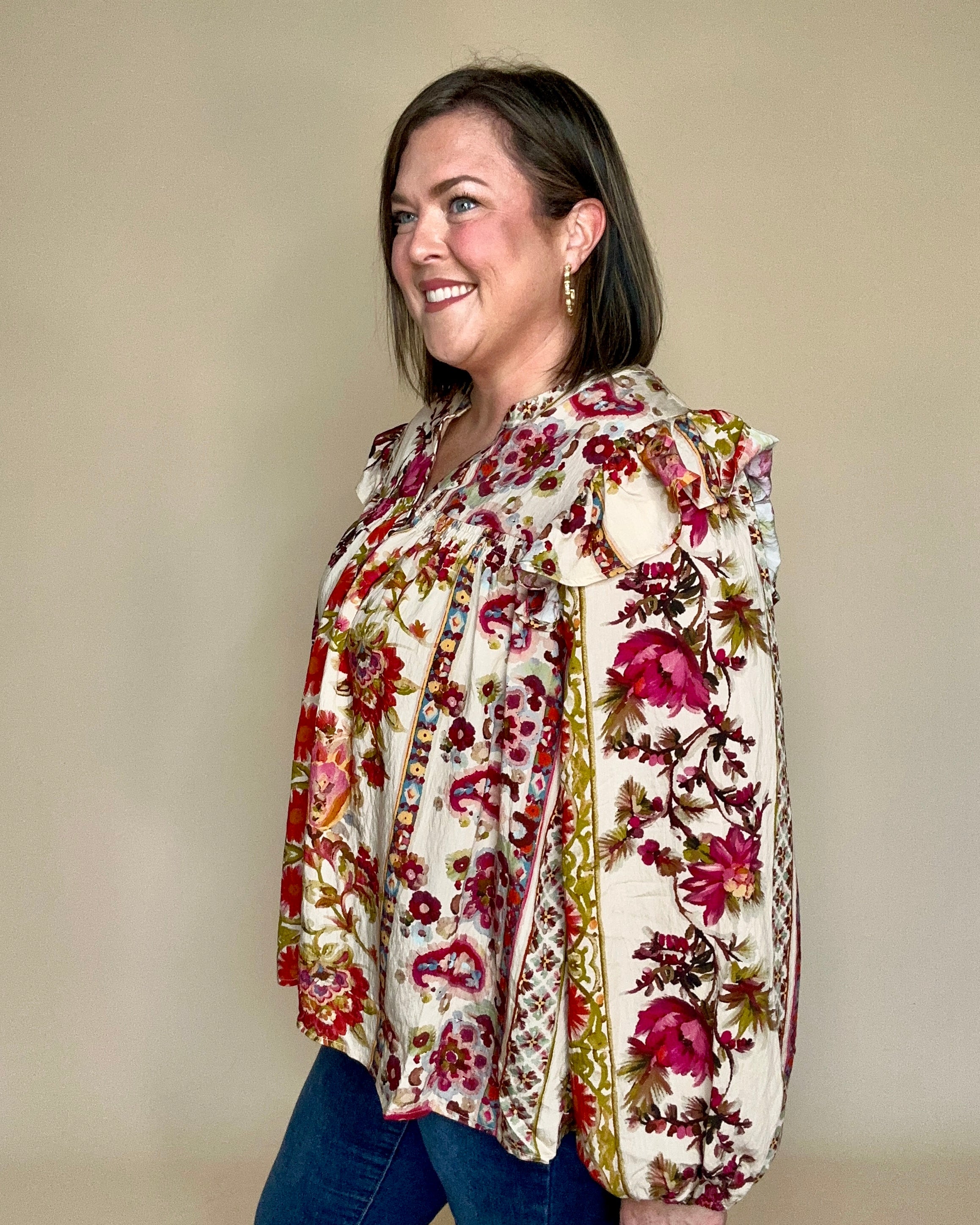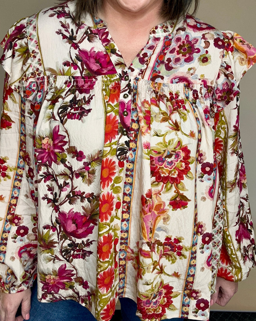 Burgundy Floral Ruffle Sleeve Top