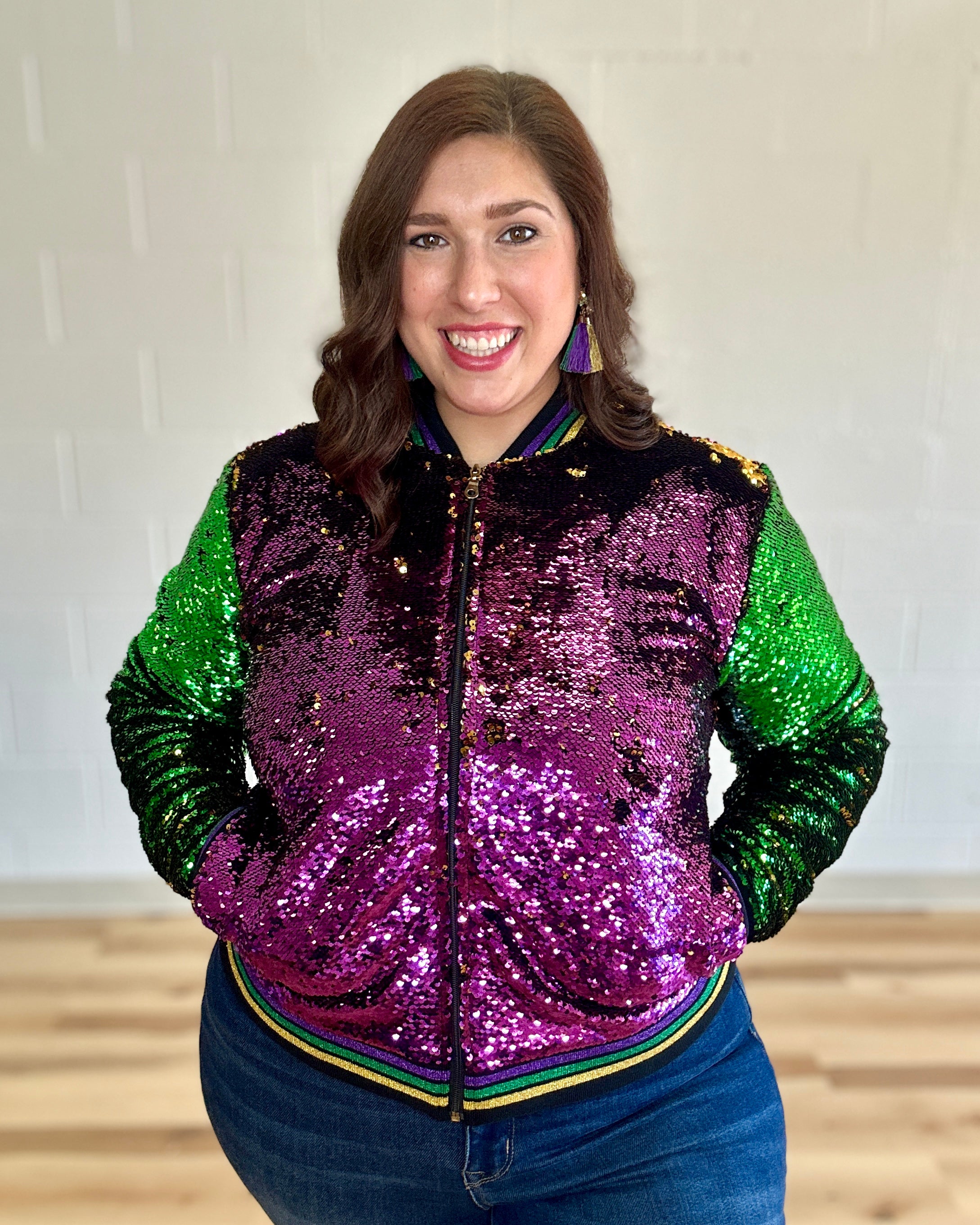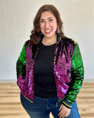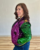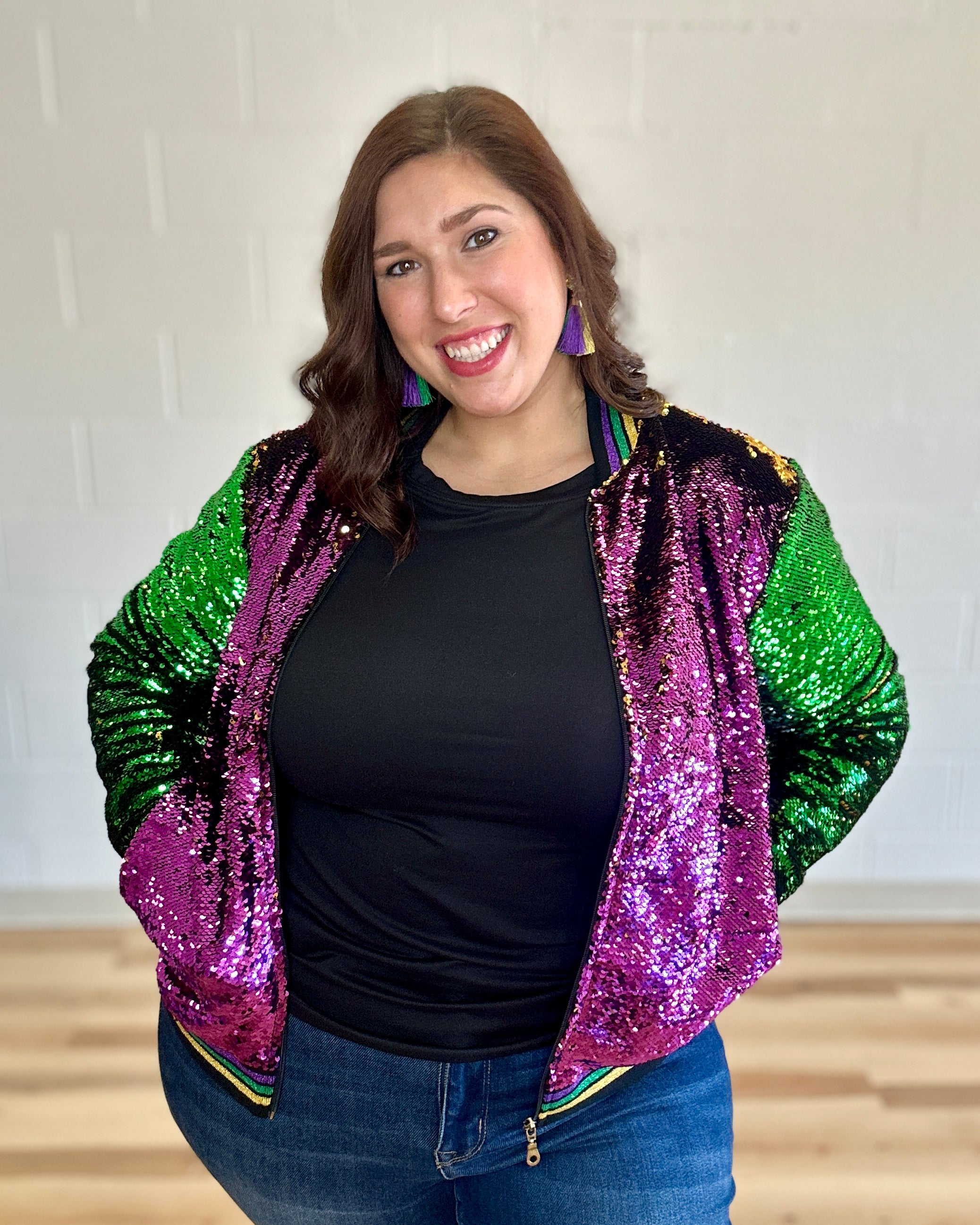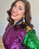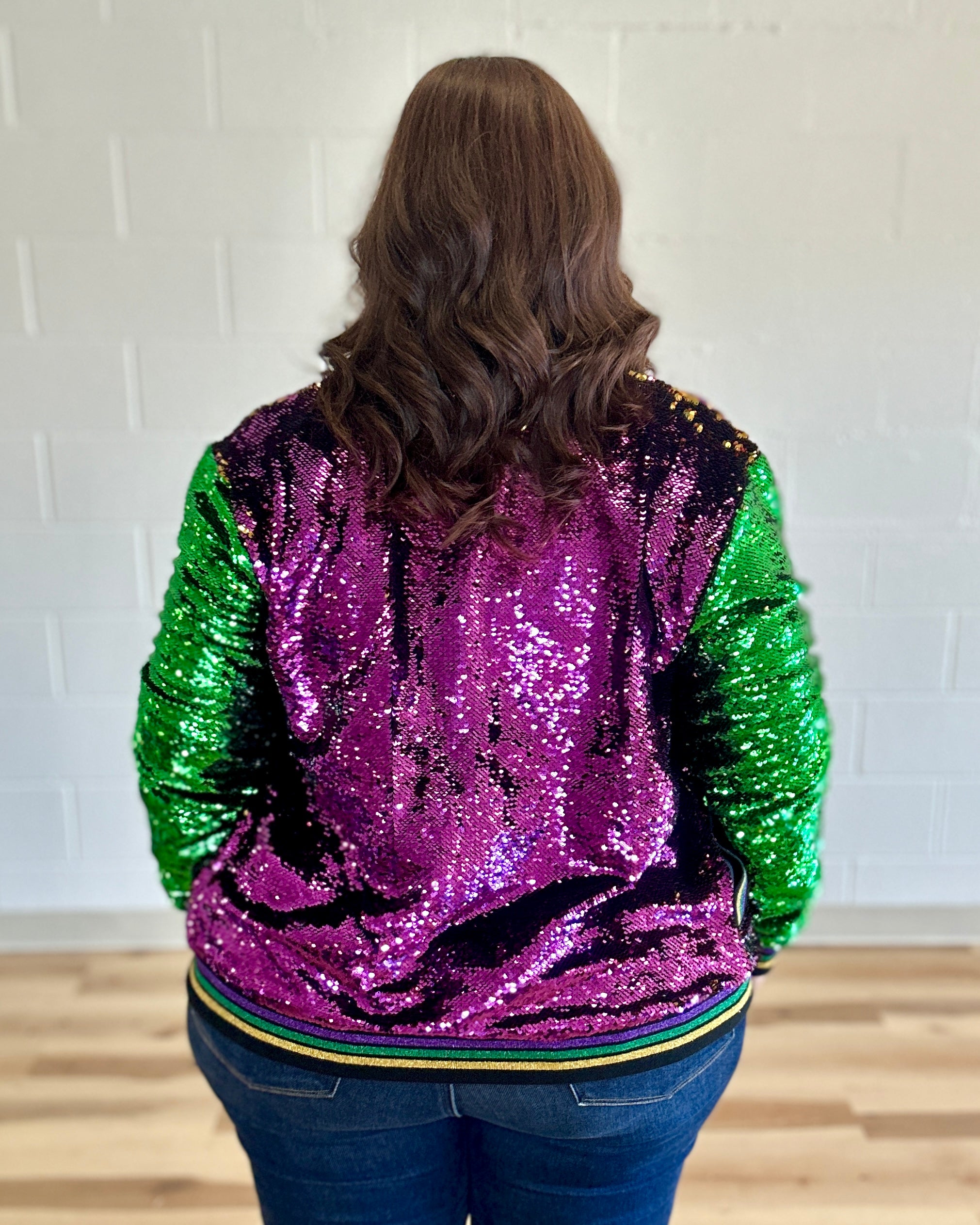 Celebrate Mardi Gras with this stylish long sleeved sequined bomber jacket. This features purple green & gold sequins all over and a zip up design with pockets.