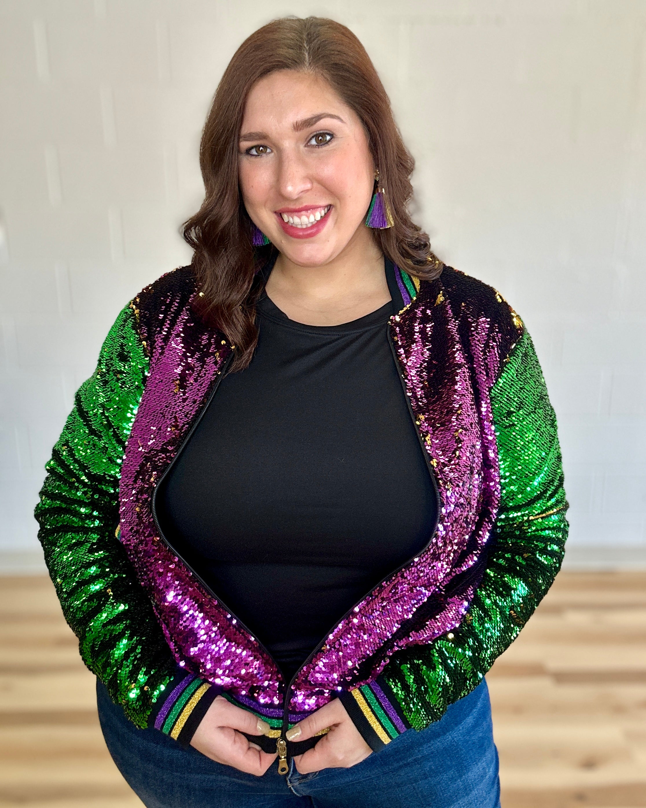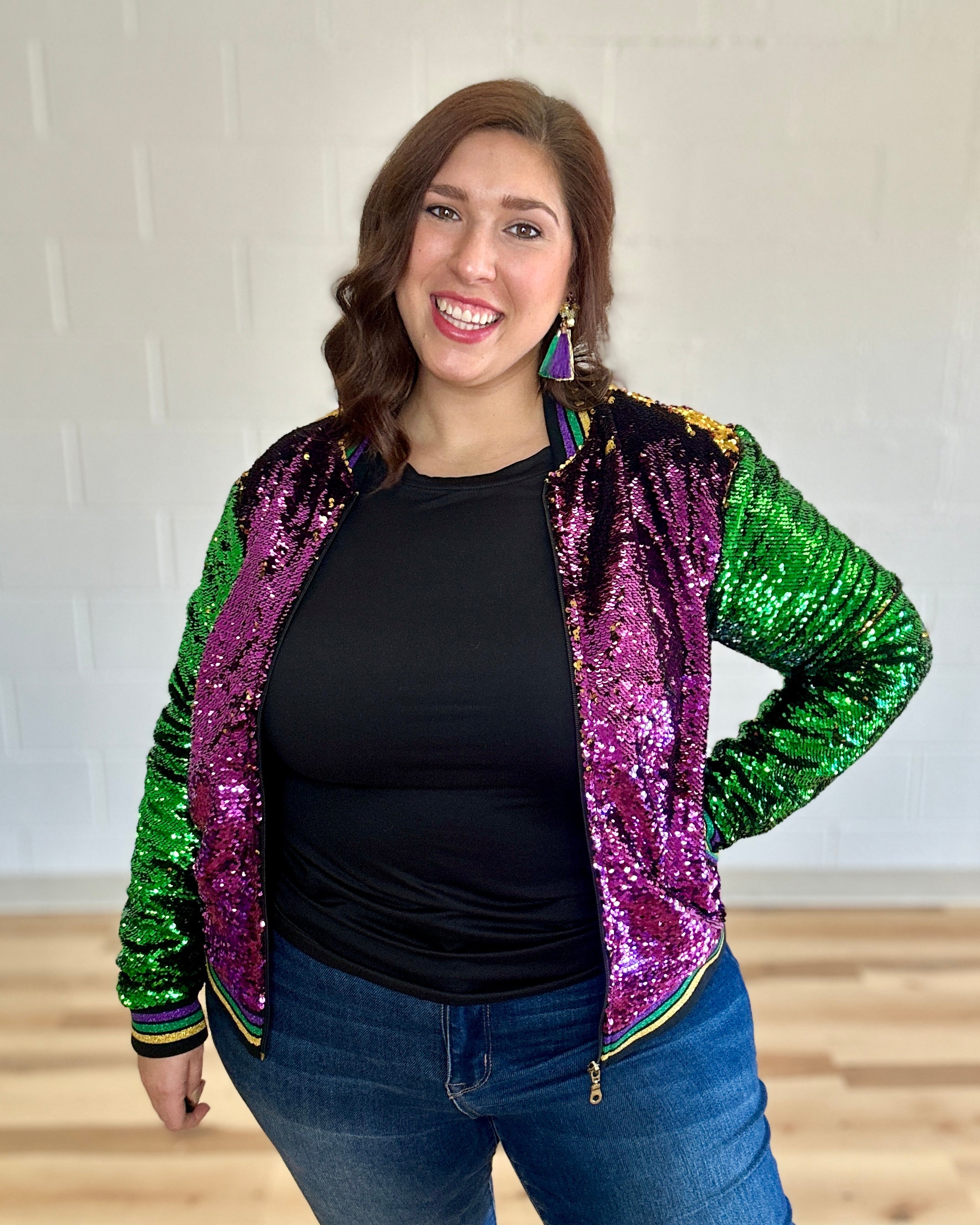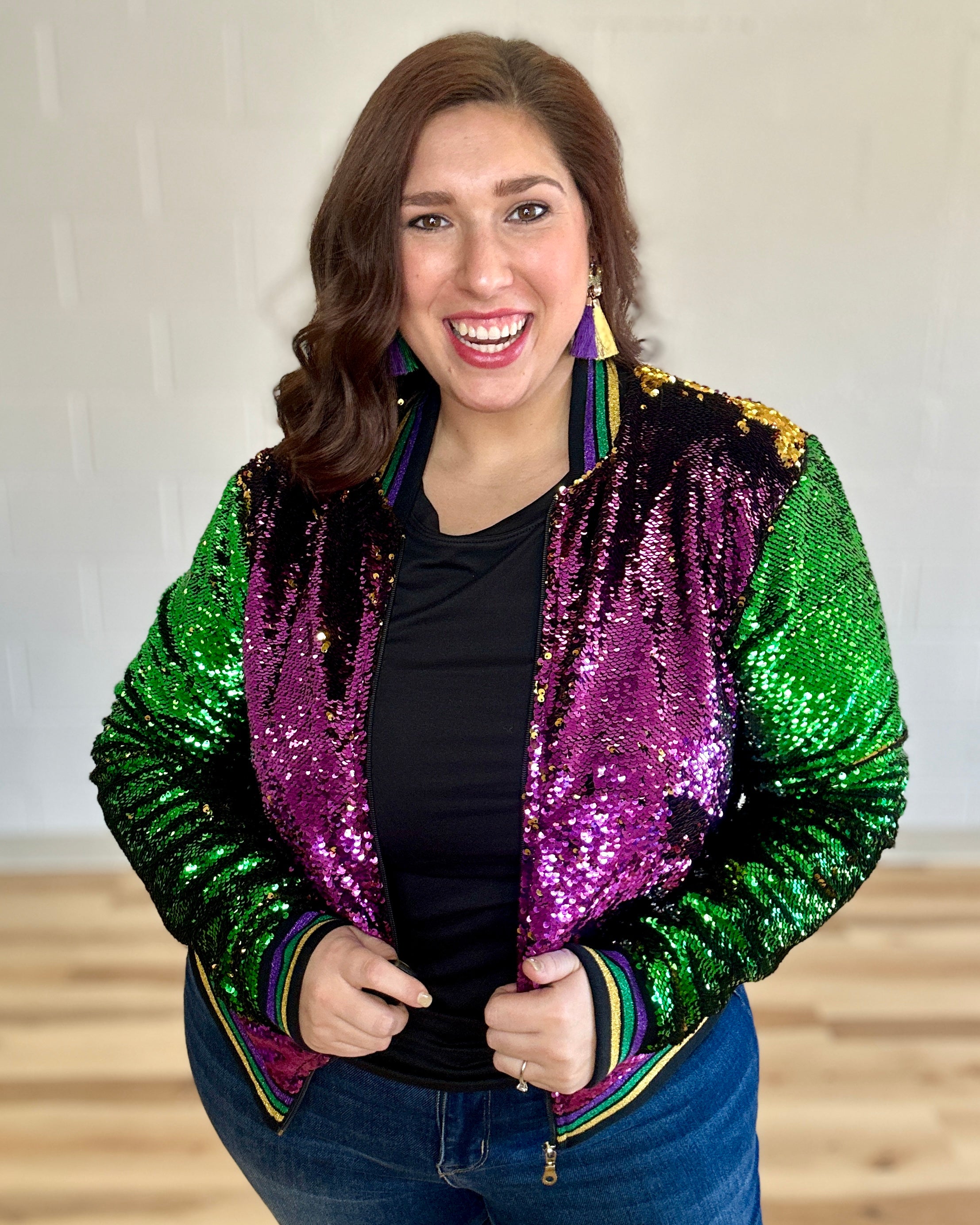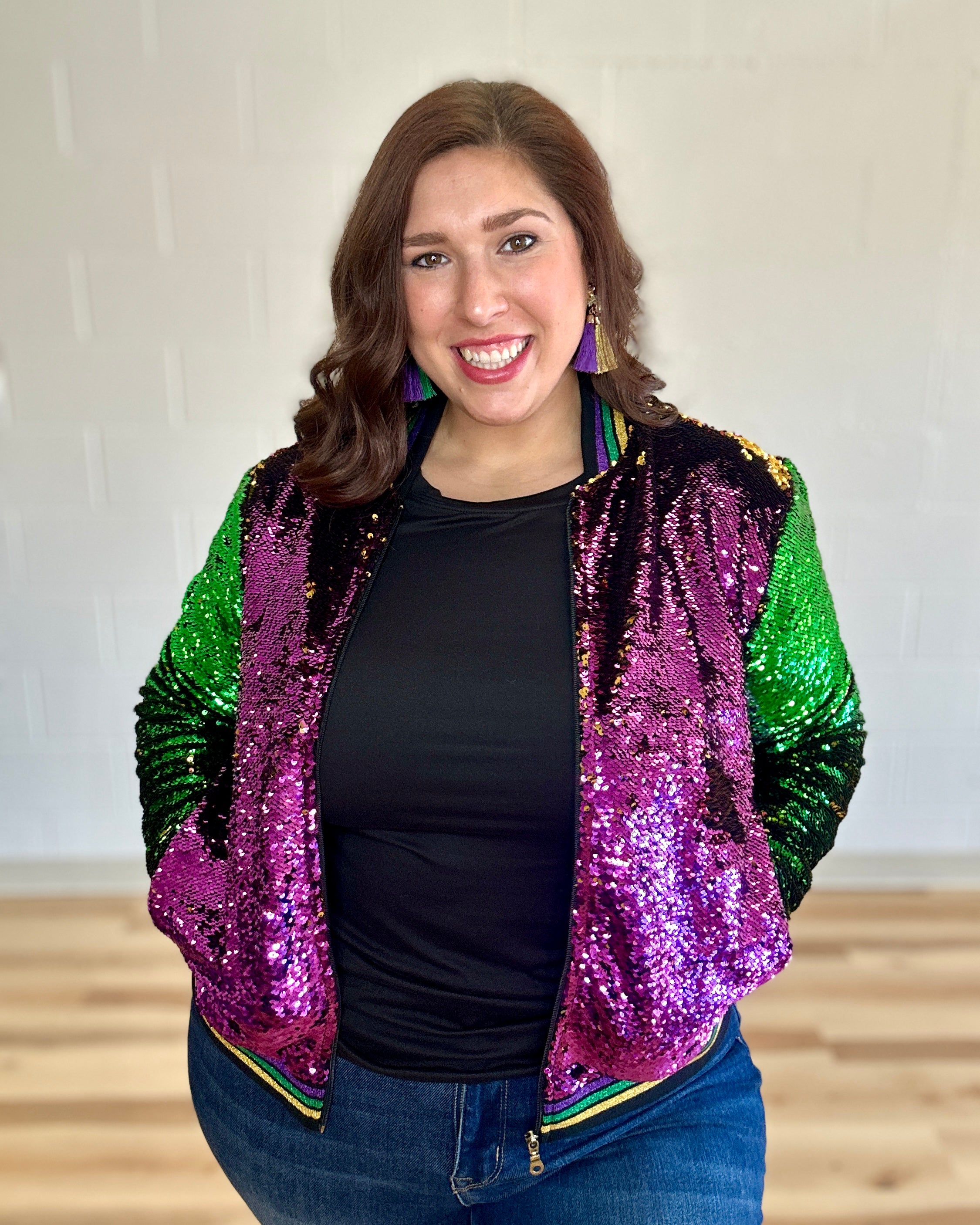 Celebrate Mardi Gras with this stylish long sleeved sequined bomber jacket. This features purple green & gold sequins all over and a zip up design with pockets.