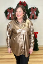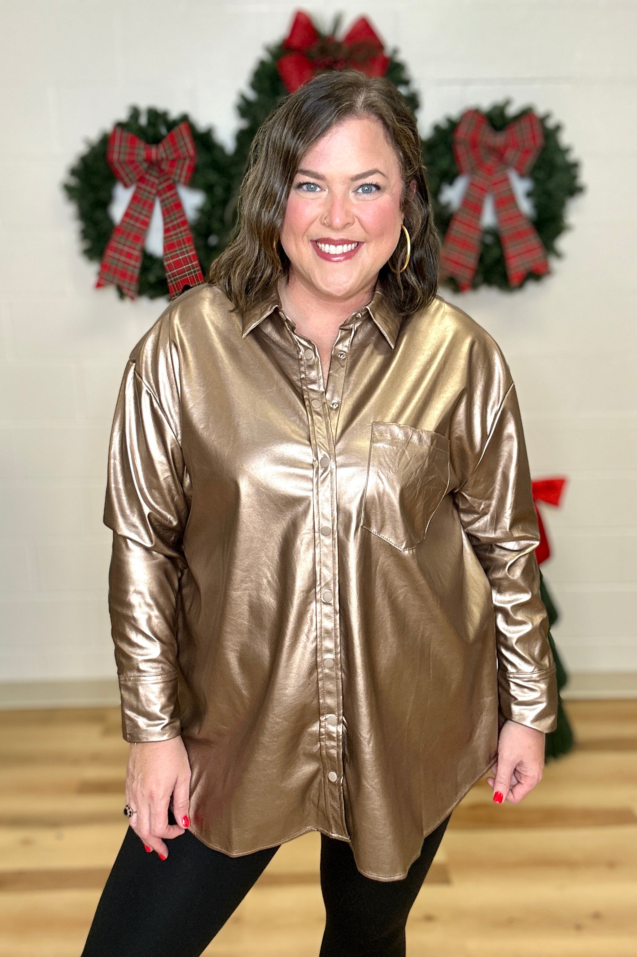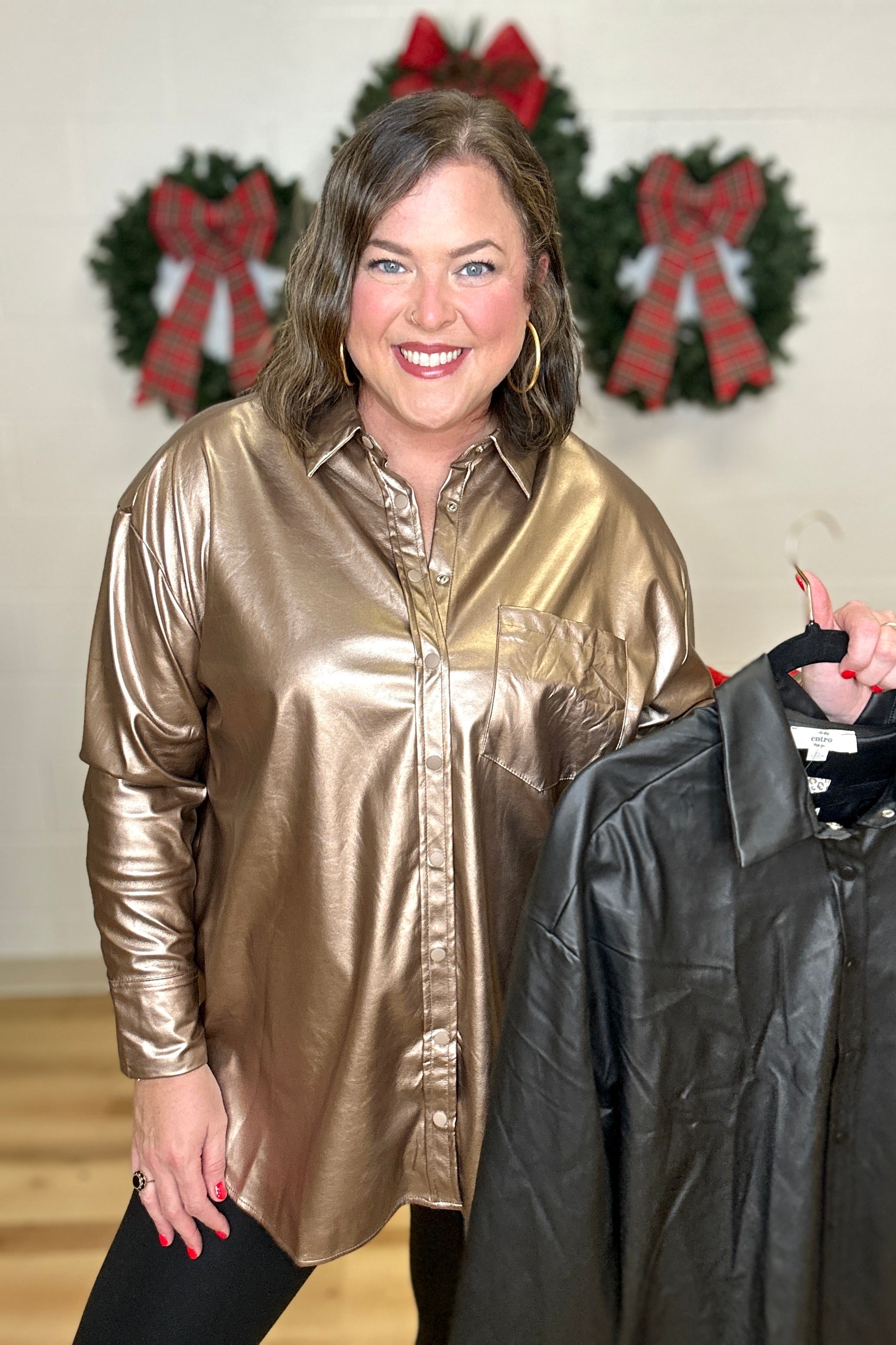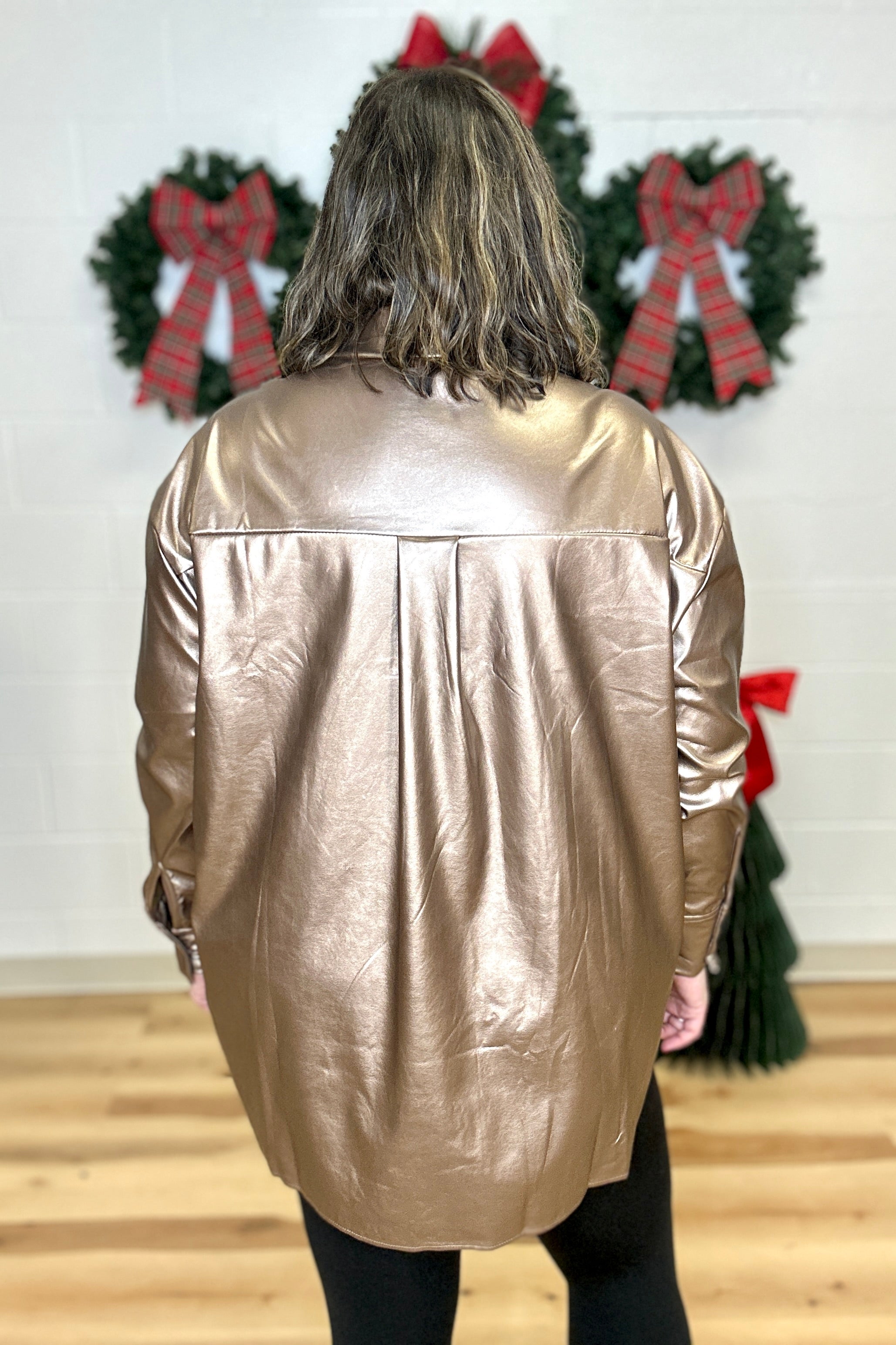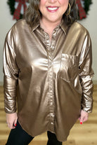 Make a statement with this eye-catching metallic shacket that transforms any outfit instantly. The sleek pleather finish catches the light beautifully, while the lightweight woven construction keeps you comfortable all day long. Unlined for breathability and non-sheer for confidence, it features a practical bust pocket for modern functionality. Layer it over dresses, tees, or sweaters for endless styling possibilities. This is the versatile piece your closet has been waiting for—bold enough to stand alone, practical enough to wear everywhere.