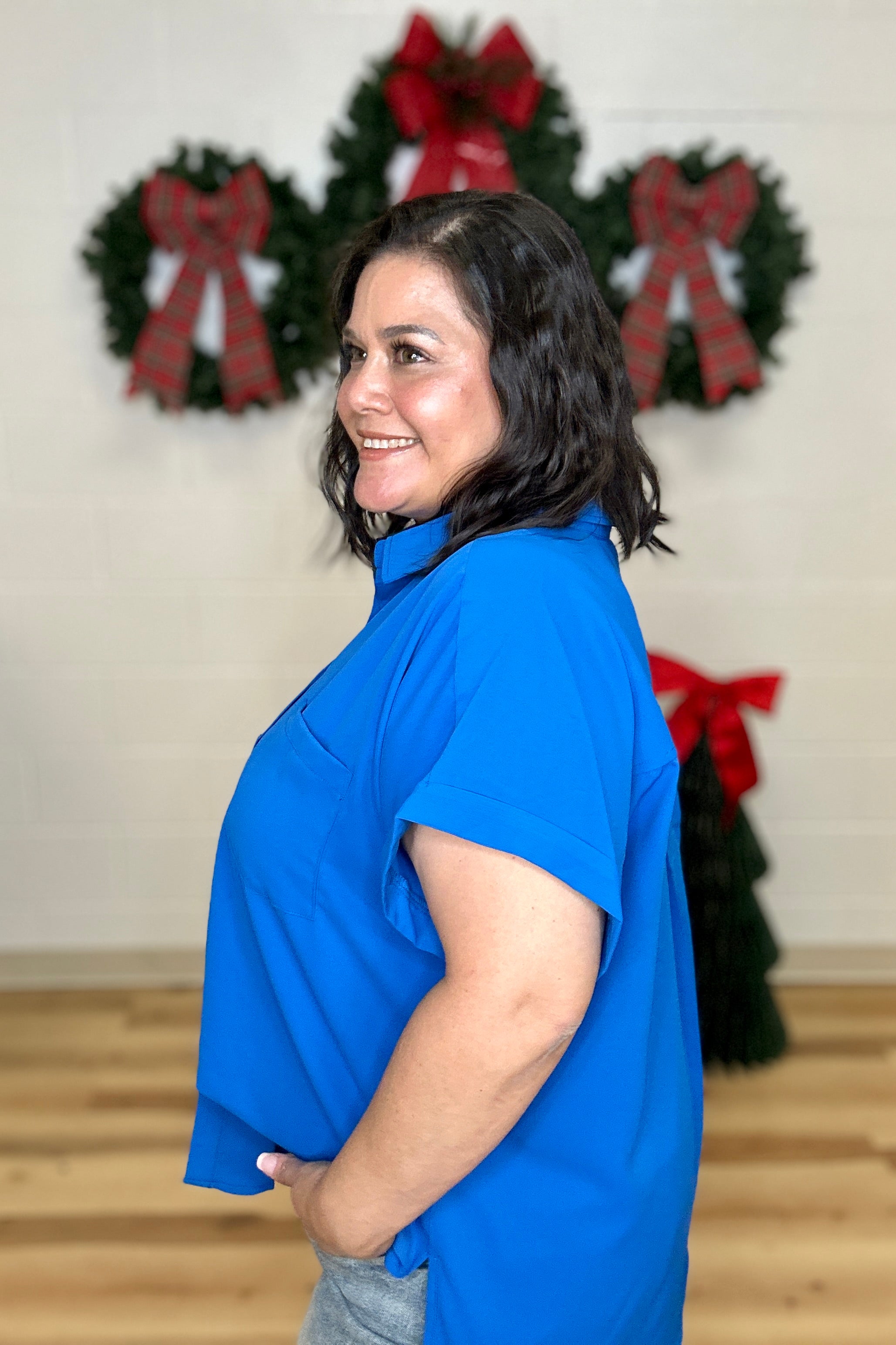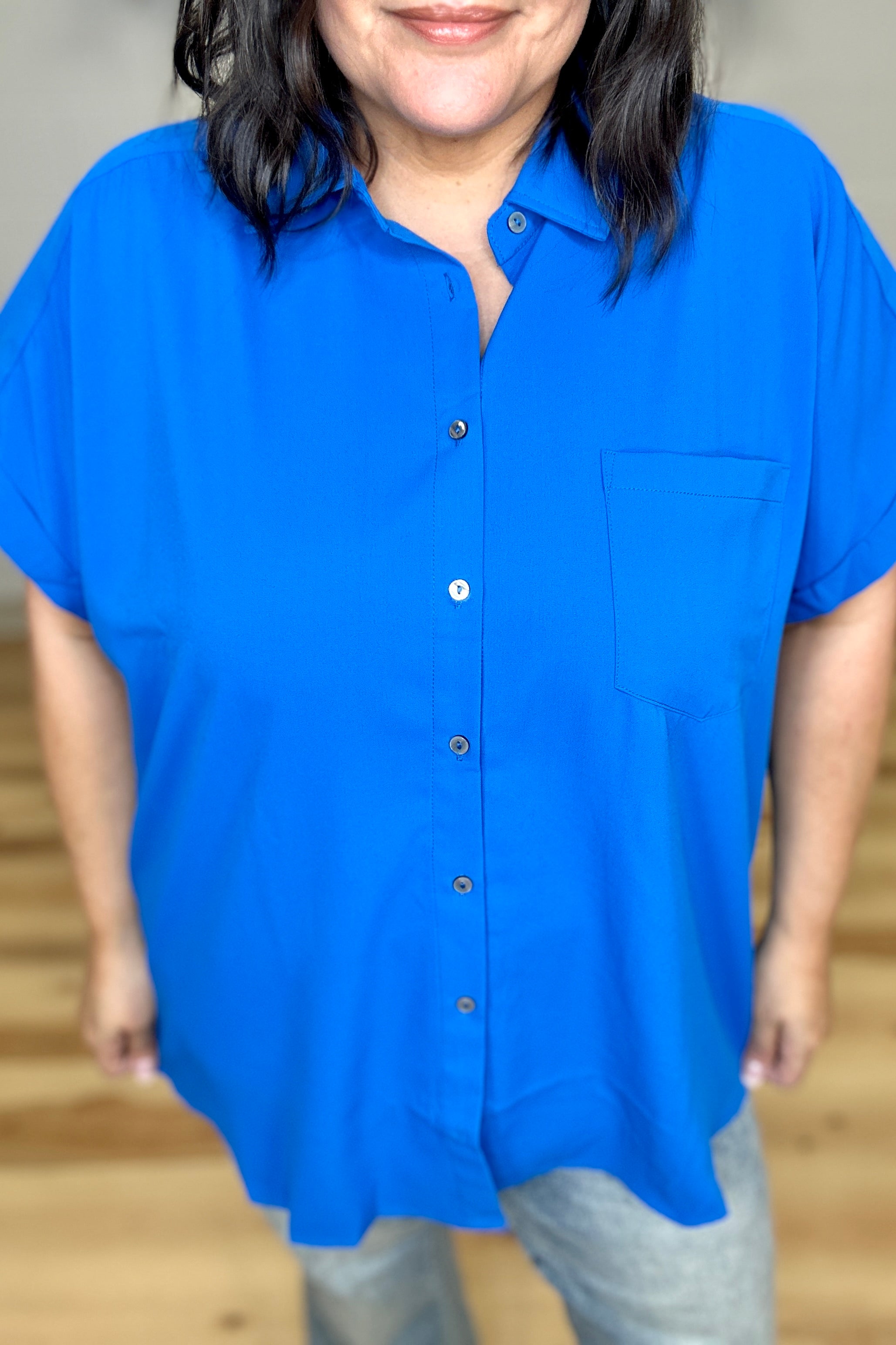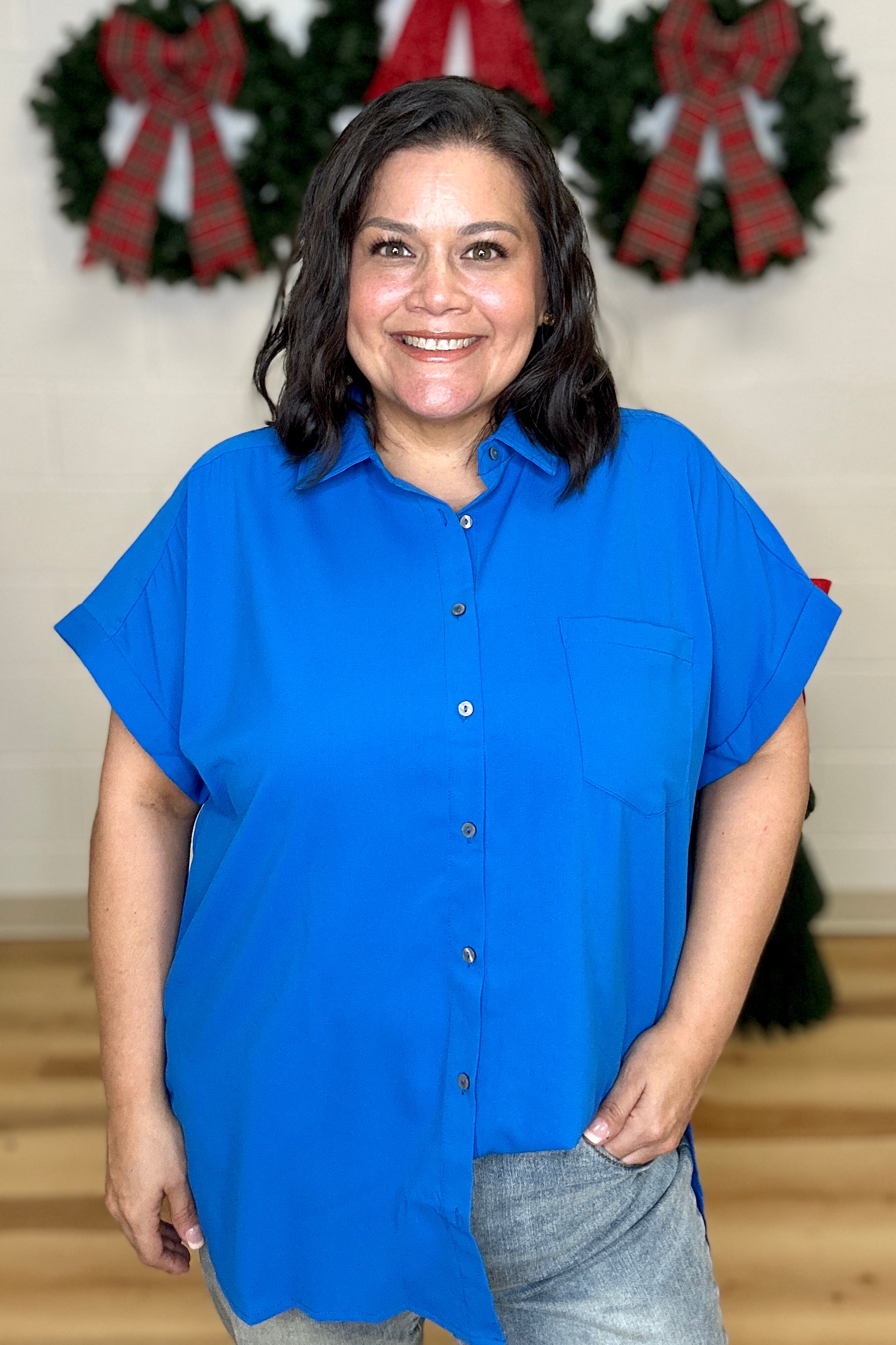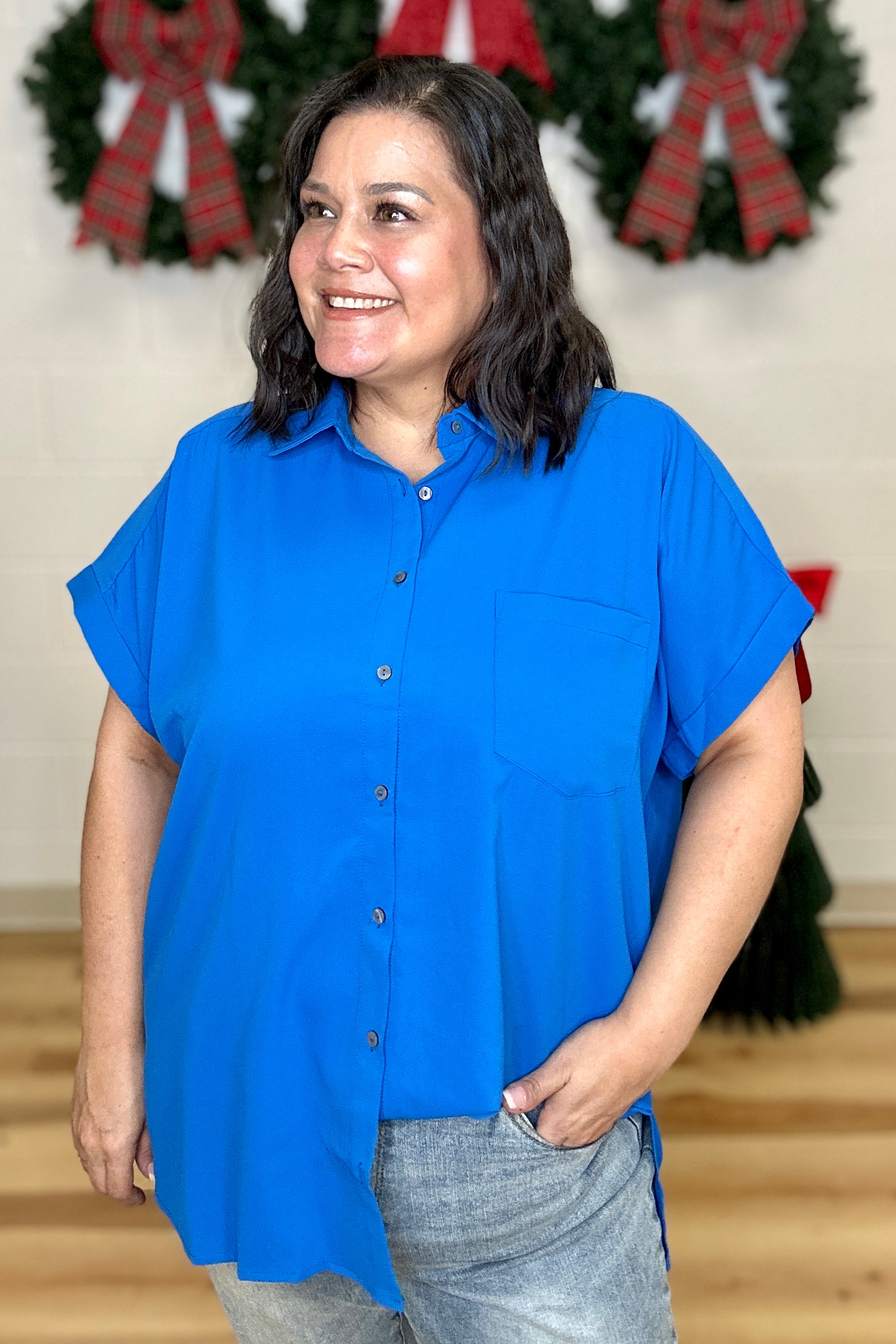 Effortless style meets everyday comfort in this solid button-up top. Featuring a classic collared neckline with a functional bust pocket, side slits for easy movement, and a flattering pleated back, this piece is designed for laid-back sophistication. Crafted from lightweight woven fabric that's non-sheer and unlined, it's perfect for layering or wearing solo. Available in crisp green or cool blue—pick your vibe and go!
