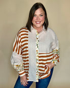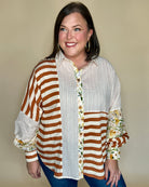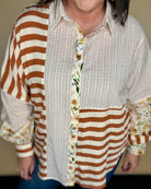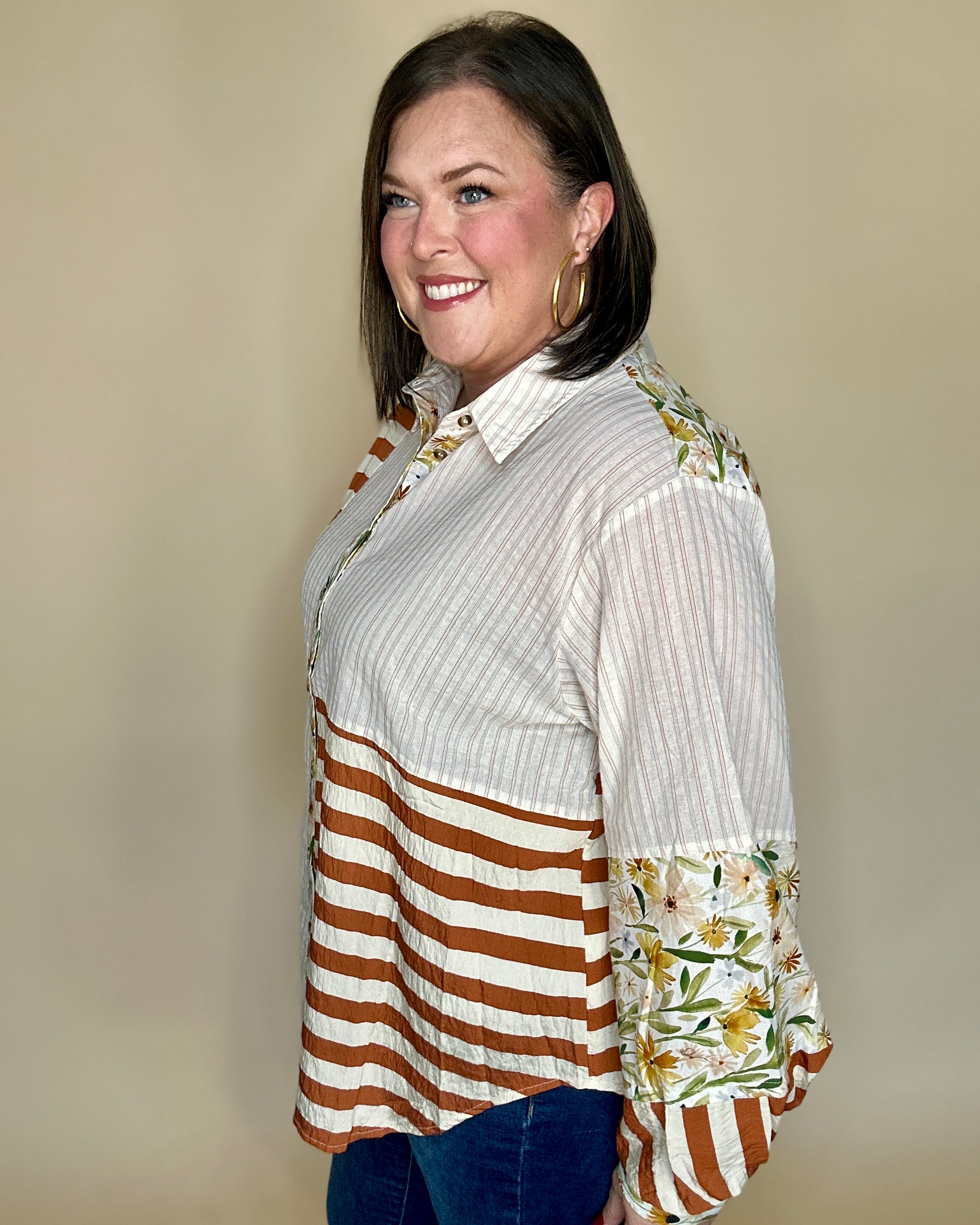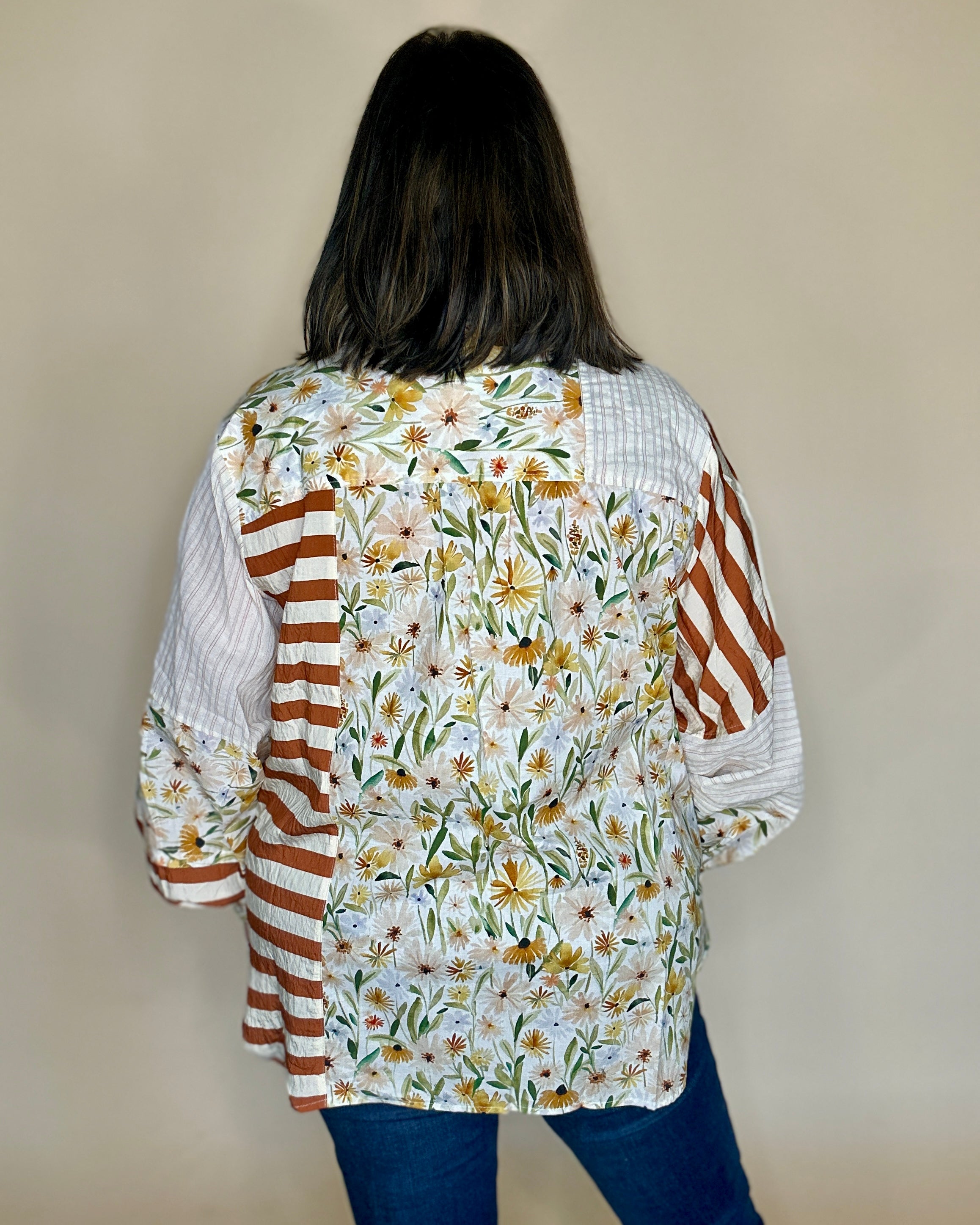 Elevate your wardrobe with the Floral & Stripe Patchwork Button Up Top, a unique blend of classic stripes and vibrant floral patterns. This button-up offers a fresh, stylish twist that pairs effortlessly with jeans or skirts, making it perfect for both casual outings and chic office looks. Crafted for comfort and visual appeal, it ensures you stand out with every wear. Add a touch of personality to your everyday style with this versatile, eye-catching top.