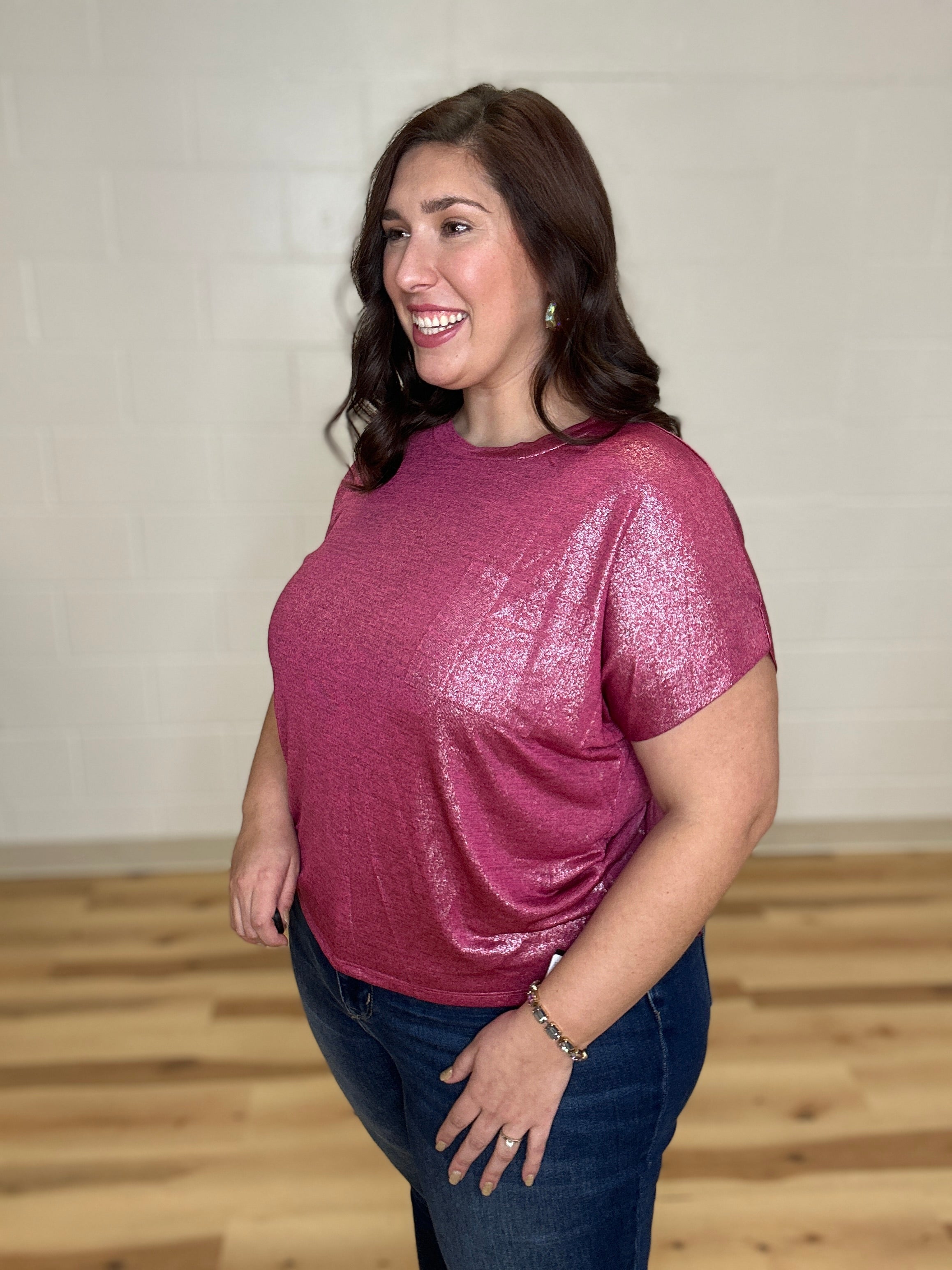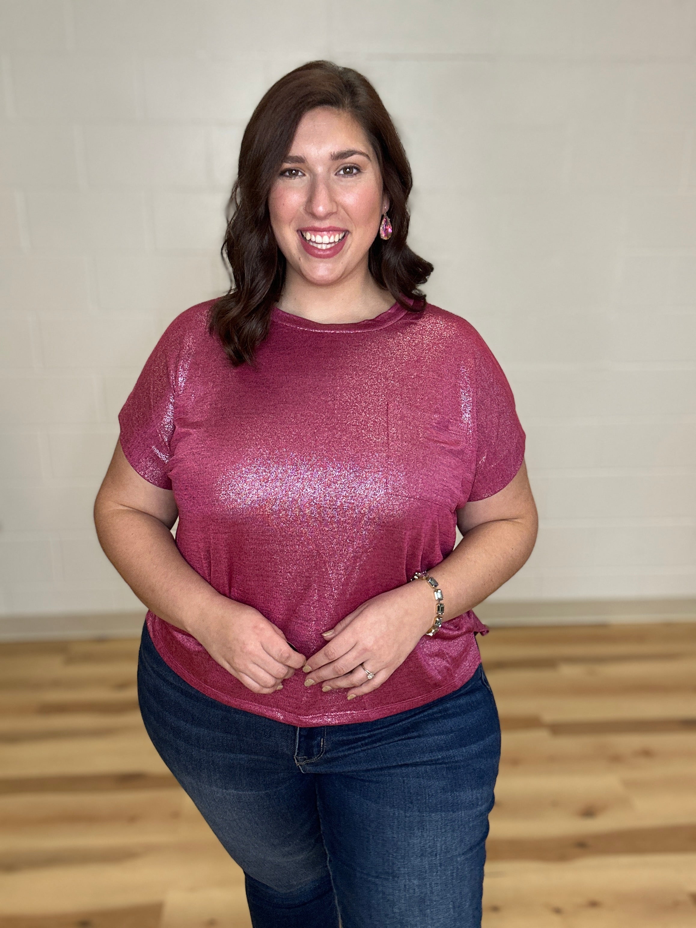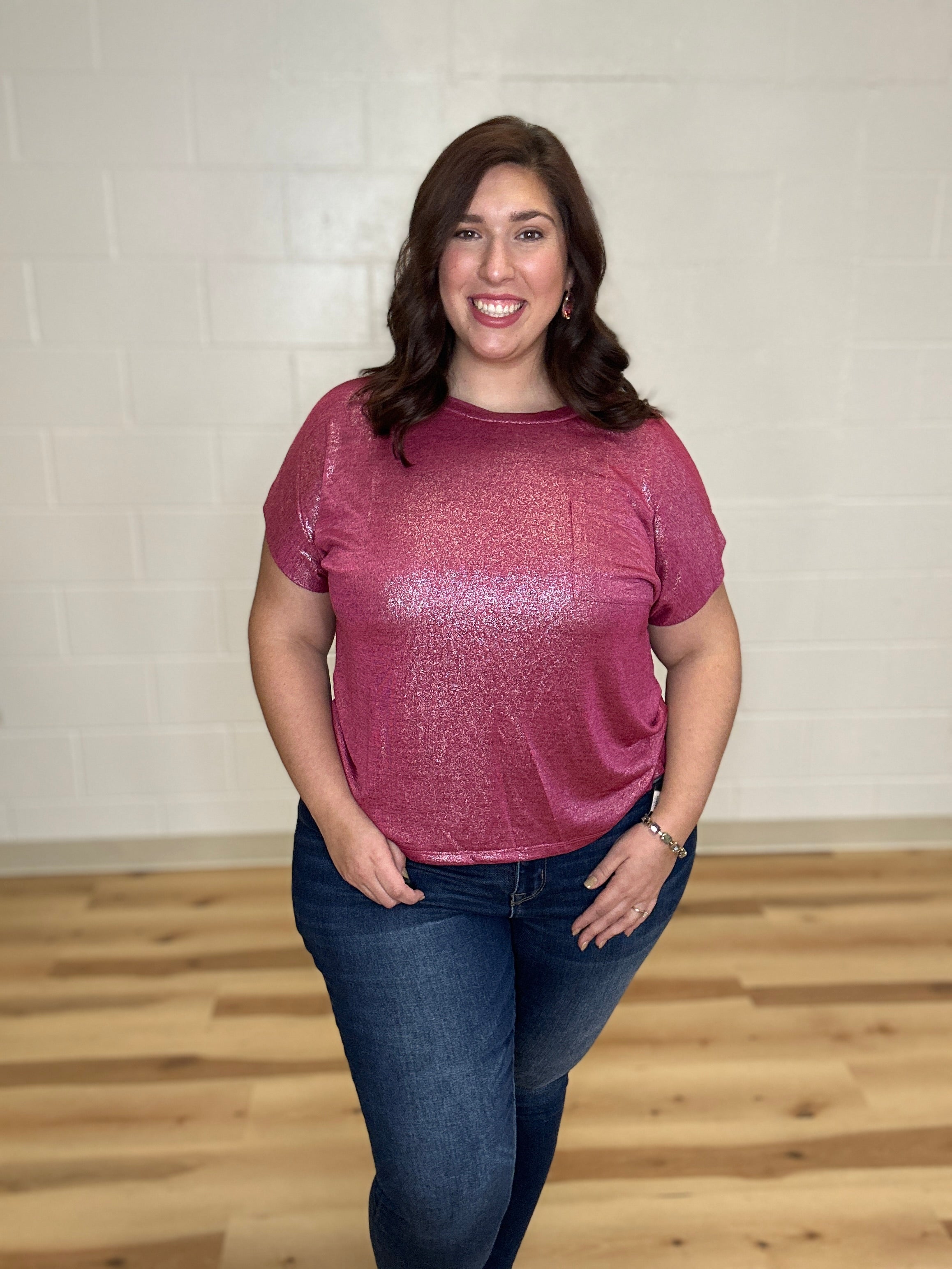 This shimmering top combines effortless elegance with everyday comfort. Crafted from soft, lightweight fabric, it offers a relaxed fit and a flattering flowy silhouette. A single front pocket adds a practical touch without compromising style. With its subtle sparkle, classic round neckline, and short sleeves, this versatile piece easily transitions from casual daywear to sophisticated evening looks. Elevate your wardrobe with a top that’s as comfortable as it is captivating.
