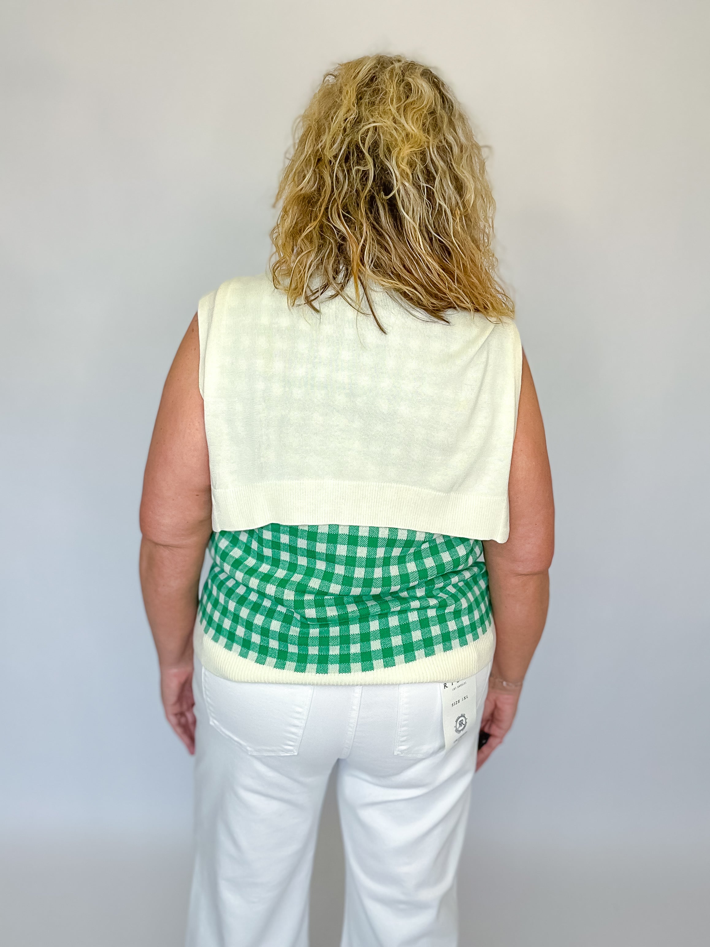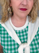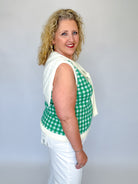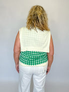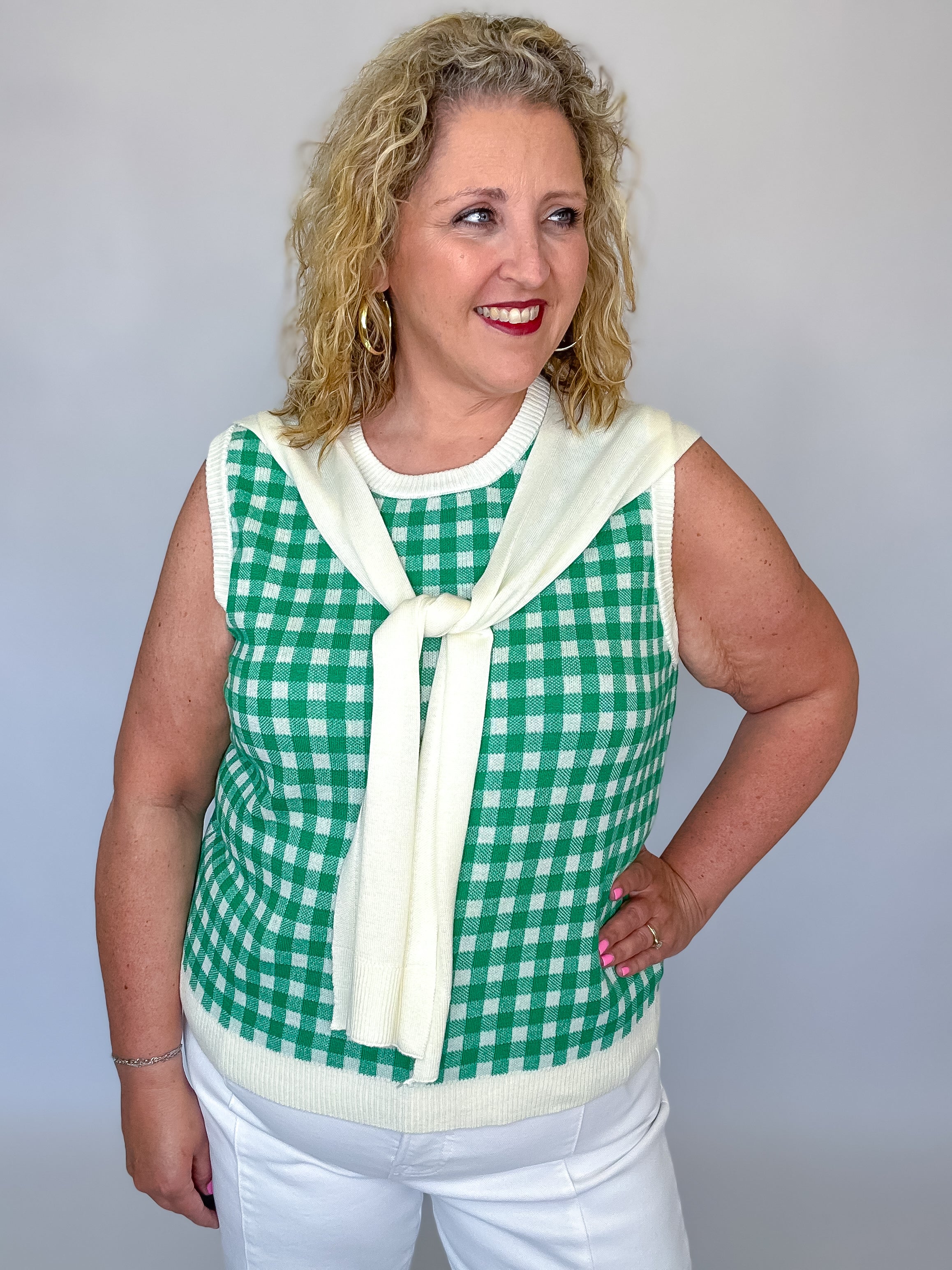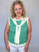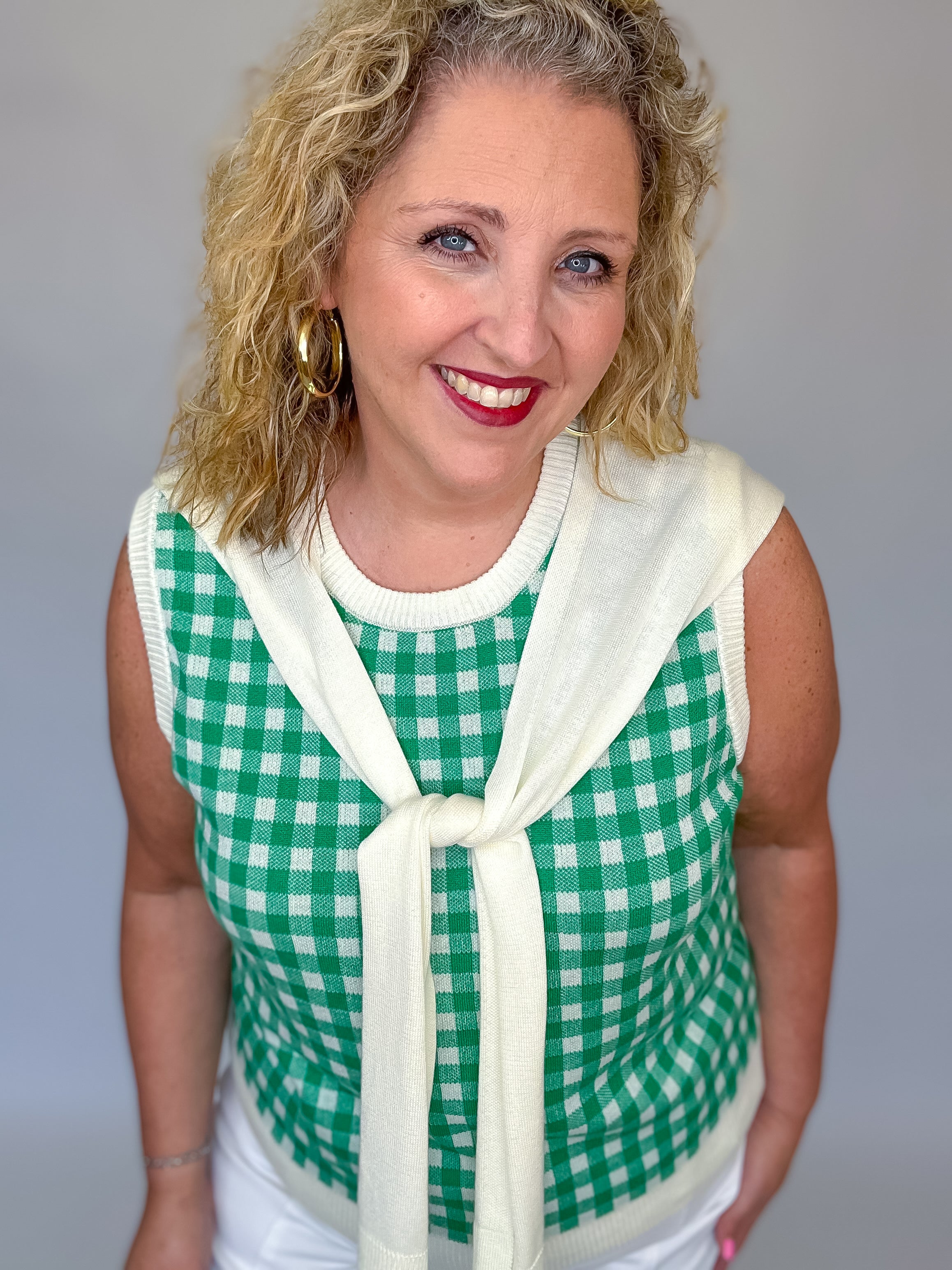Sail into style with this charming gingham sleeveless sweater knit top. The attached sweater detail drapes elegantly across the front and ties for an effortless, relaxed vibe. Ribbed neckline and hem keep everything in place, while the lightweight knit fabric moves with you. Unlined and non-sheer, it's perfect for layering or wearing solo on breezy days. A nautical-inspired essential that brings coastal charm to your everyday wardrobe.