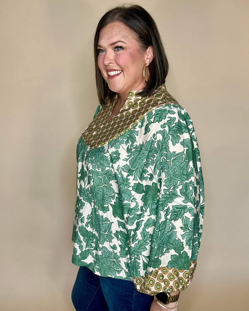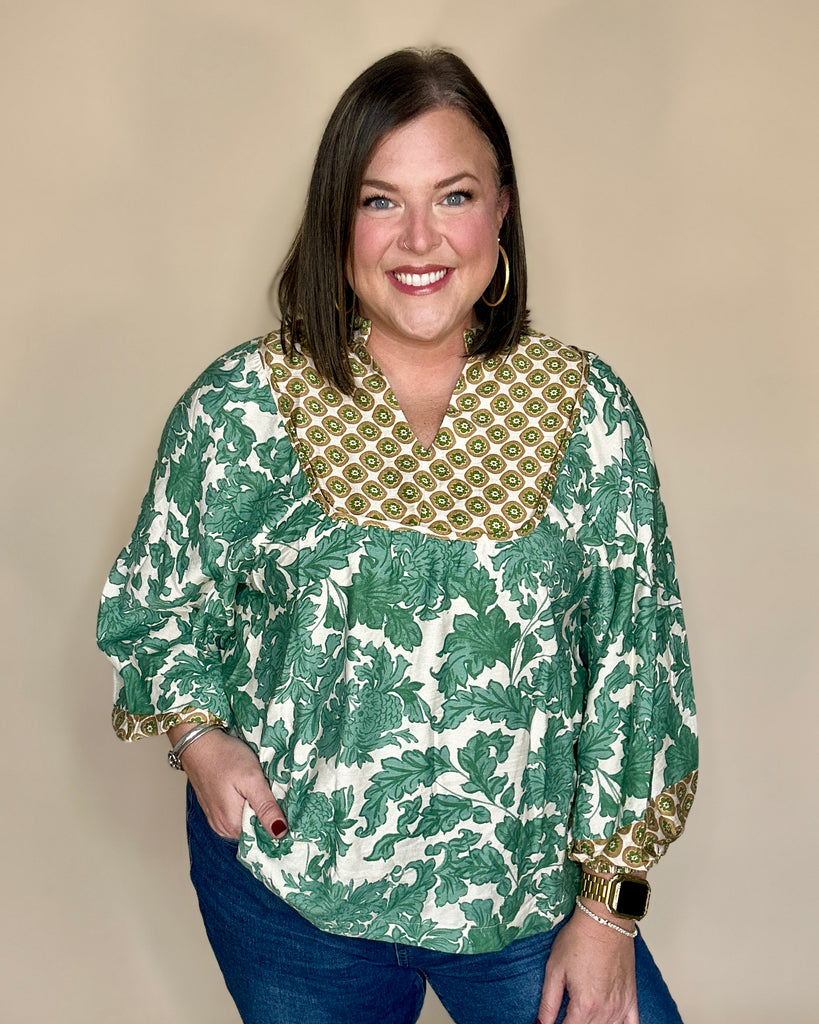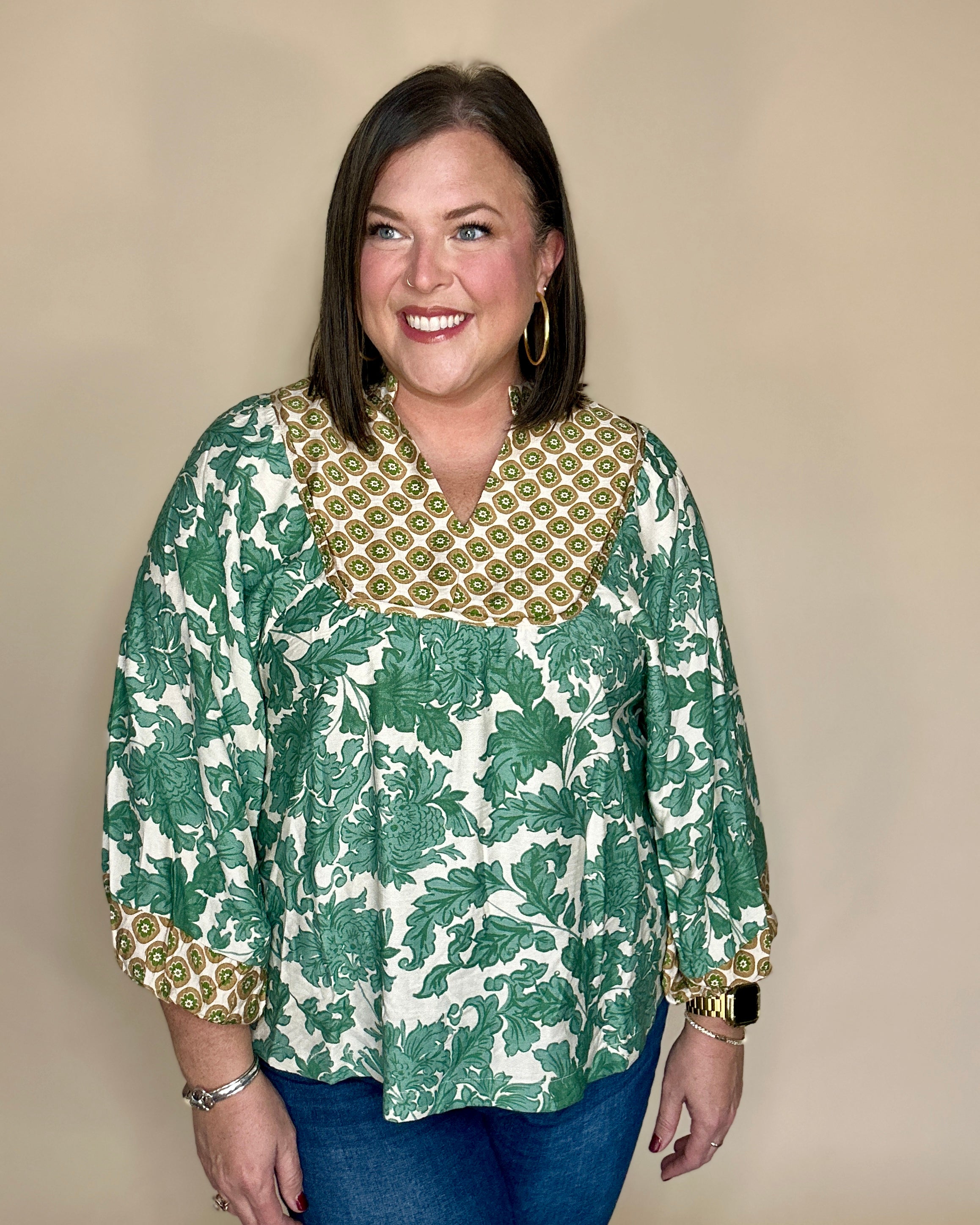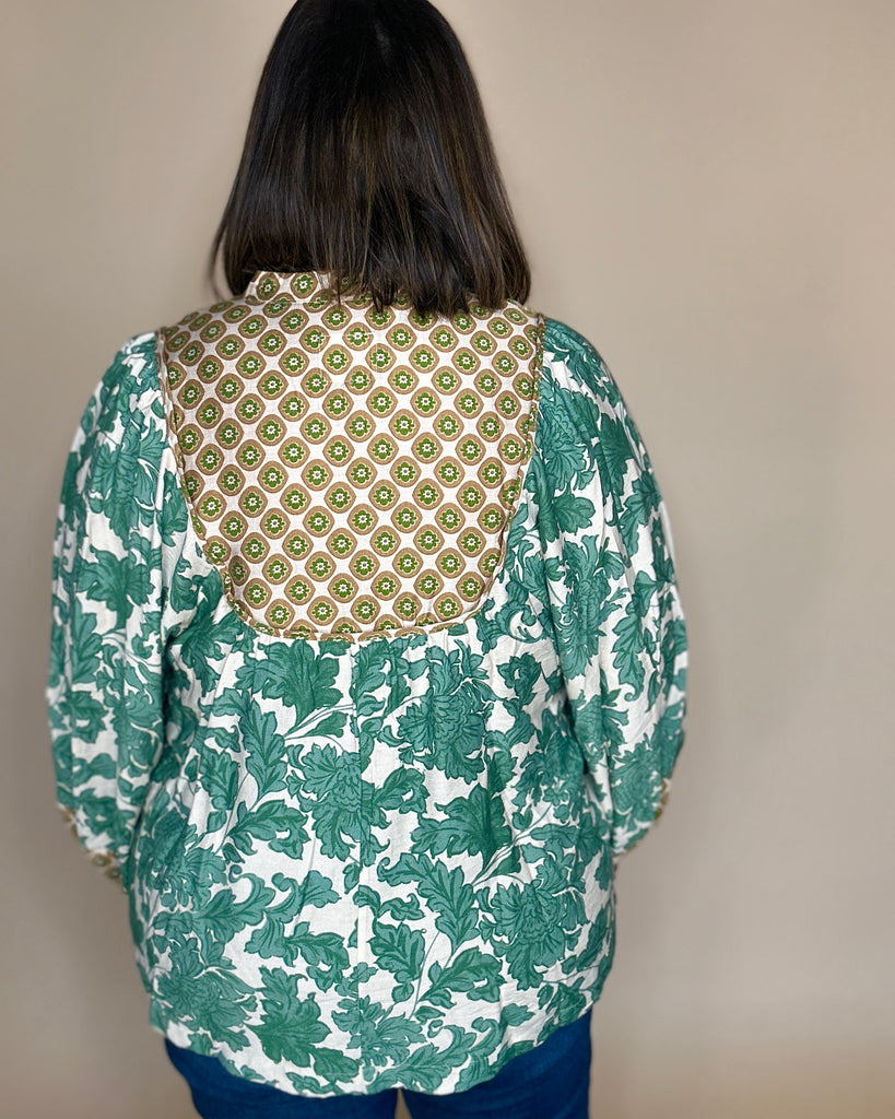 This teal green top features a comfortable relaxed fit with a mixed print design. The main body has a leafy pattern and elegant long balloon sleeves for a stylish yet easygoing look. The split V-neck and round yoke add subtle design details that enhance its unique charm. With no lining, it offers breathable wear perfect for layering or standalone use, making it a versatile addition to your wardrobe.