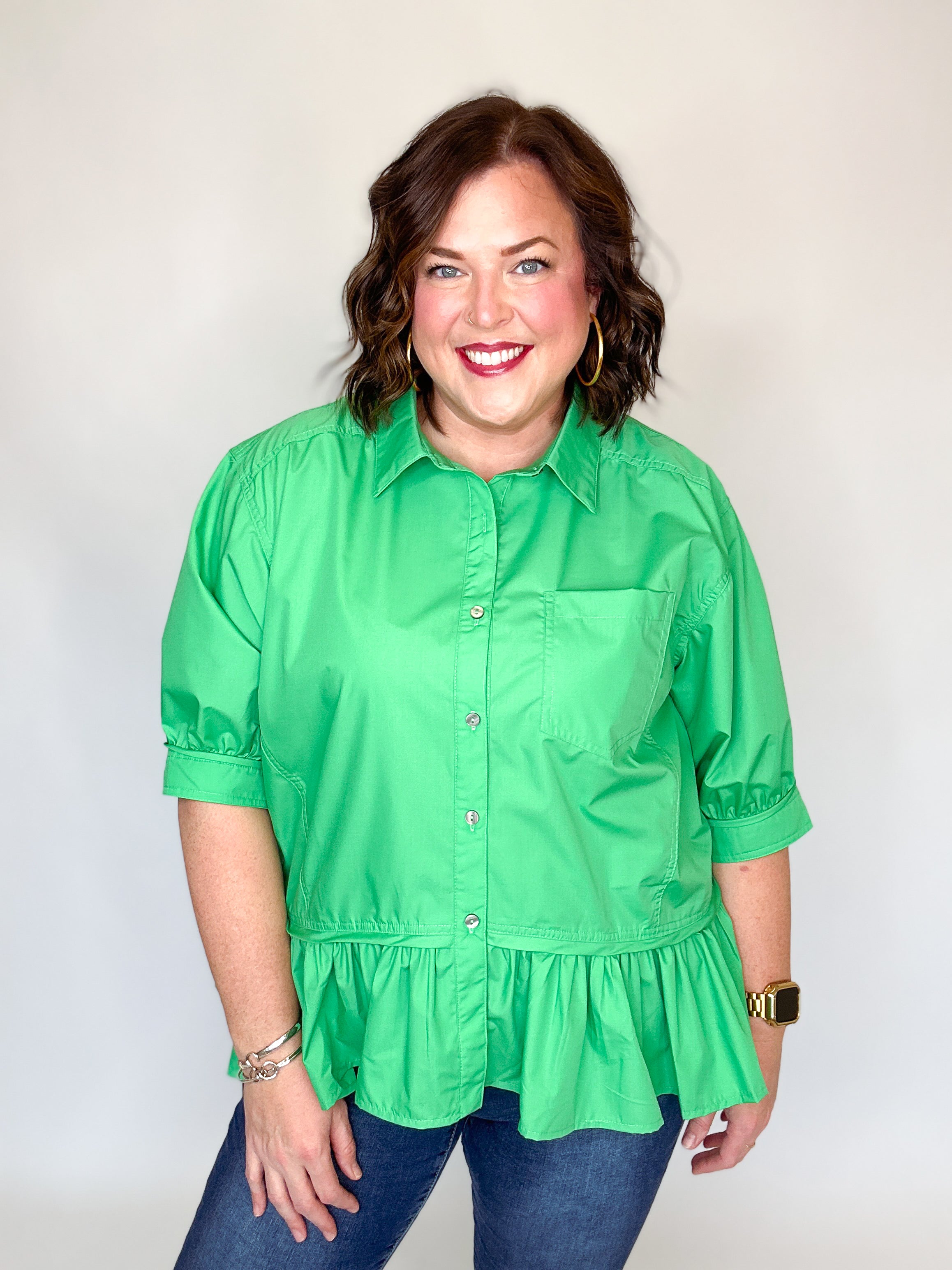 Fresh, feminine, and effortlessly chic, this solid button-down top is a standout staple for any wardrobe. Designed with flattering 3/4 sleeves and a playful ruffle hem, it adds just the right amount of movement and charm. The classic front button closure and chest pocket keep it timeless, while the lightweight woven fabric makes it perfect for all-day wear. Finished with buttoned cuffs, this top is unlined, non-sheer, and easy to style from workdays to weekends.