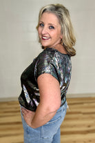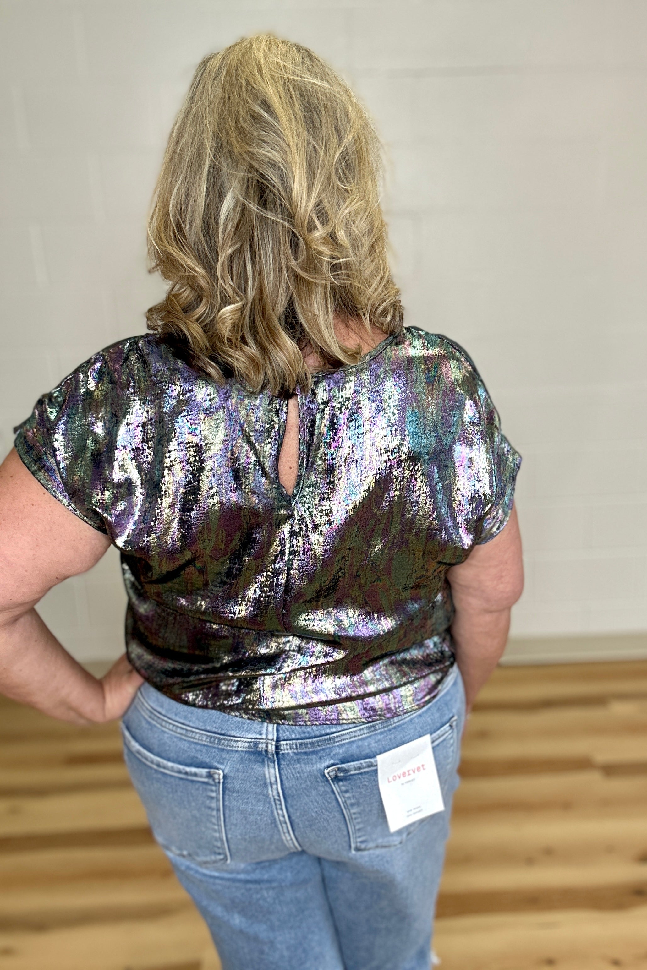 This statement top showcases an iridescent foil finish enhanced by a multicolor brushed effect, delivering a captivating, light-responsive appearance. Designed with a relaxed fit, short sleeves, and a back keyhole secured by a button closure, it combines comfort with distinctive style. Ideal for elevating your wardrobe, this piece adds a contemporary and bold accent to any ensemble.
