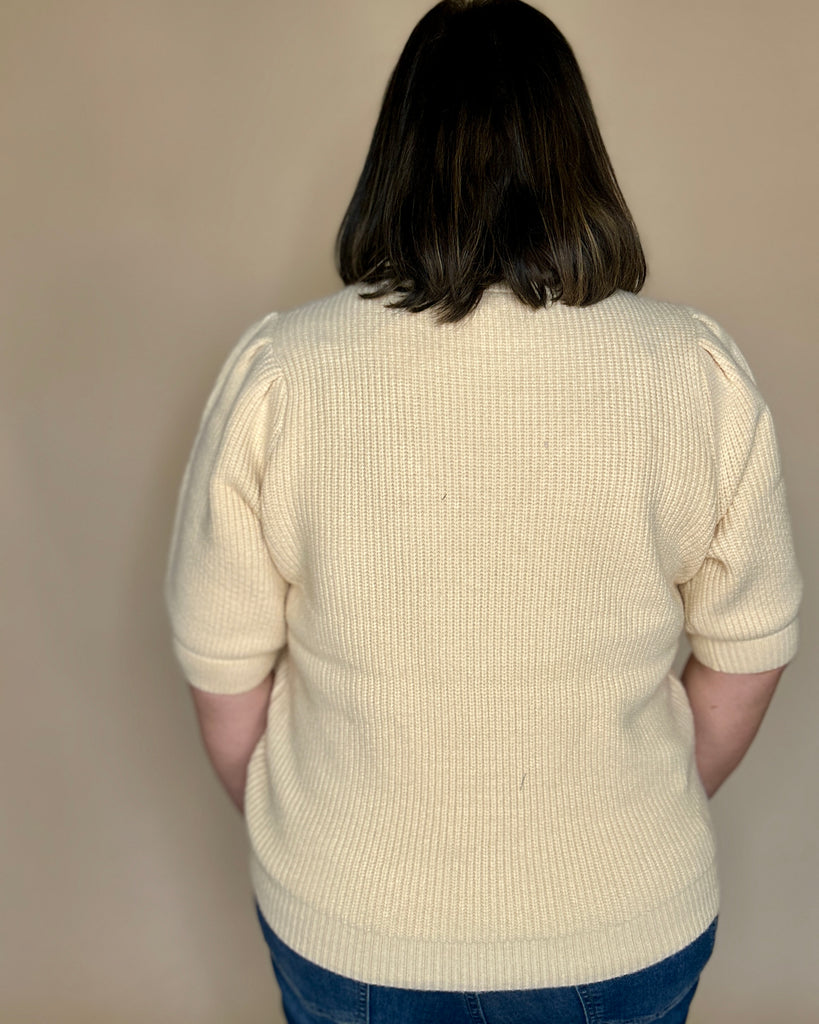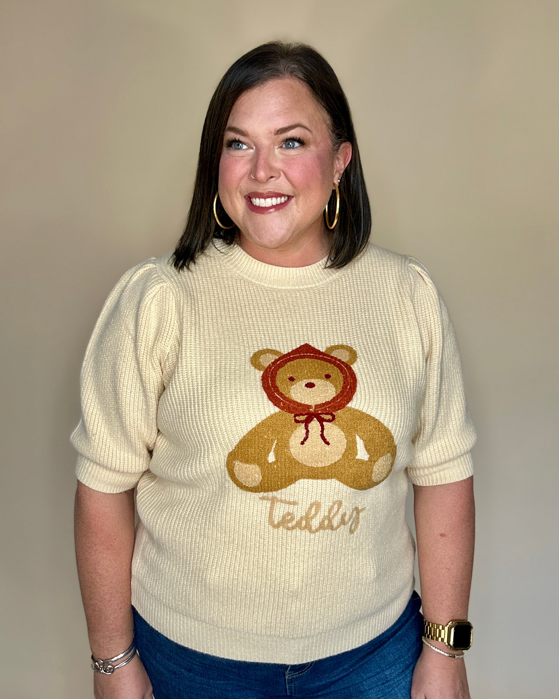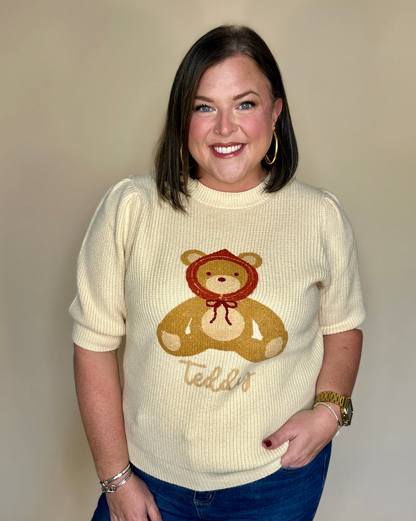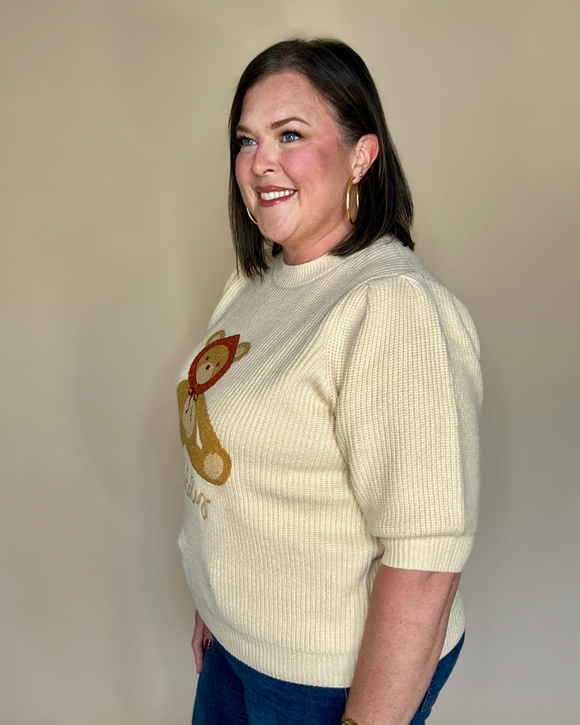 Ivory Teddy Bear Puff Sleeve Knit Sweater