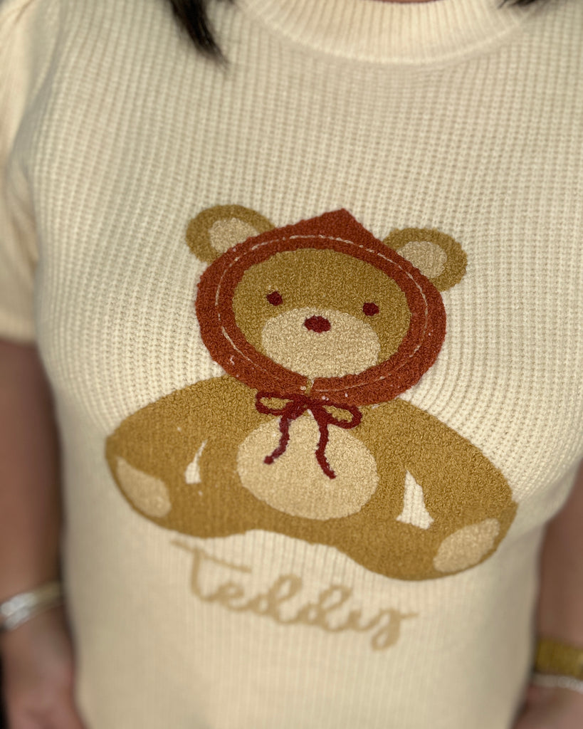 Cozy up in this charming knit sweater featuring an adorable teddy bear motif and playful puff sleeves. With whimsical embroidered details adding a touch of fun, it’s the perfect piece to brighten your day and bring out your inner child’s joy. Ideal for adding personality to any outfit, this sweater from Oddi combines comfort and lighthearted style effortlessly.