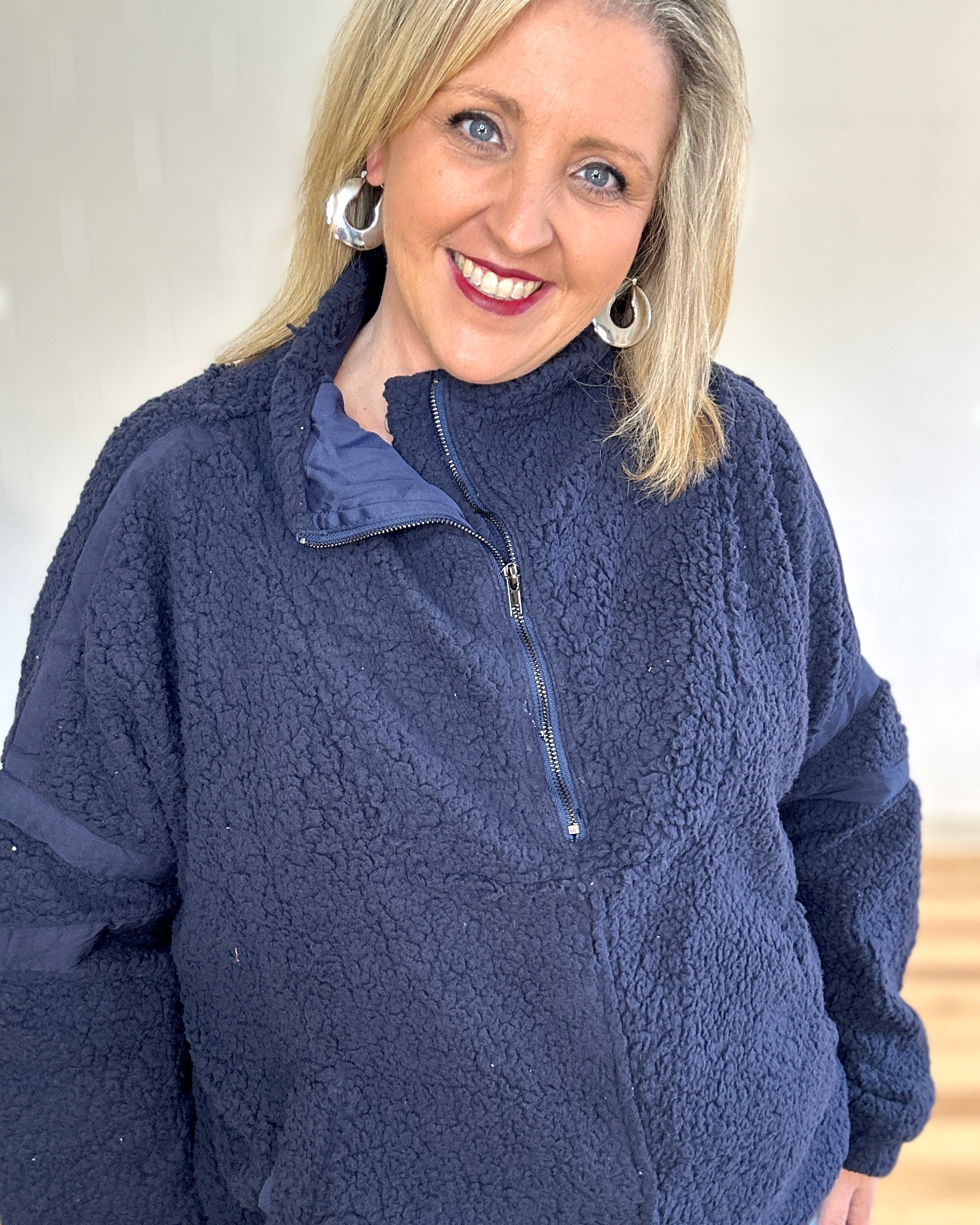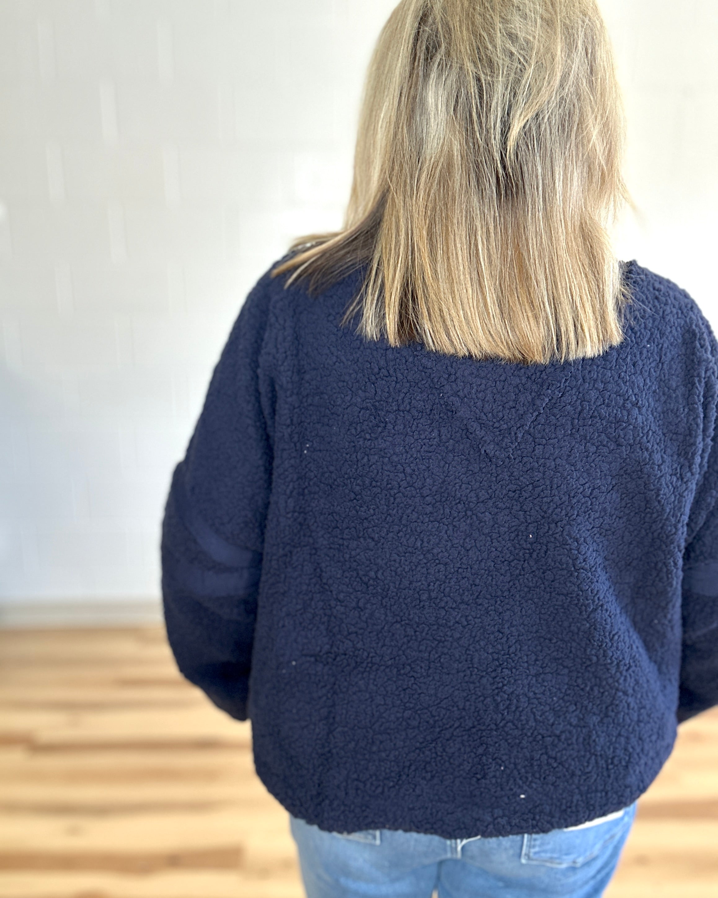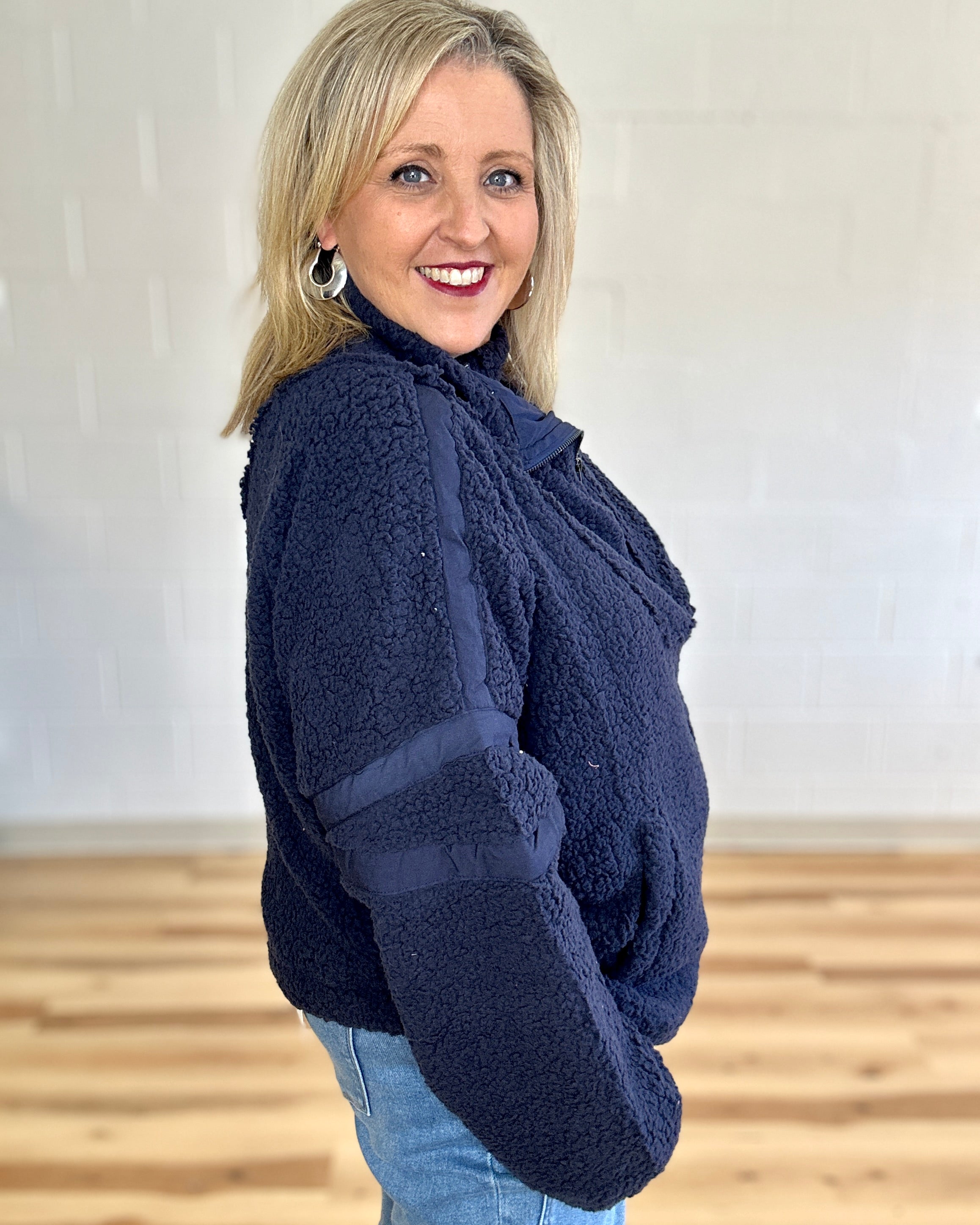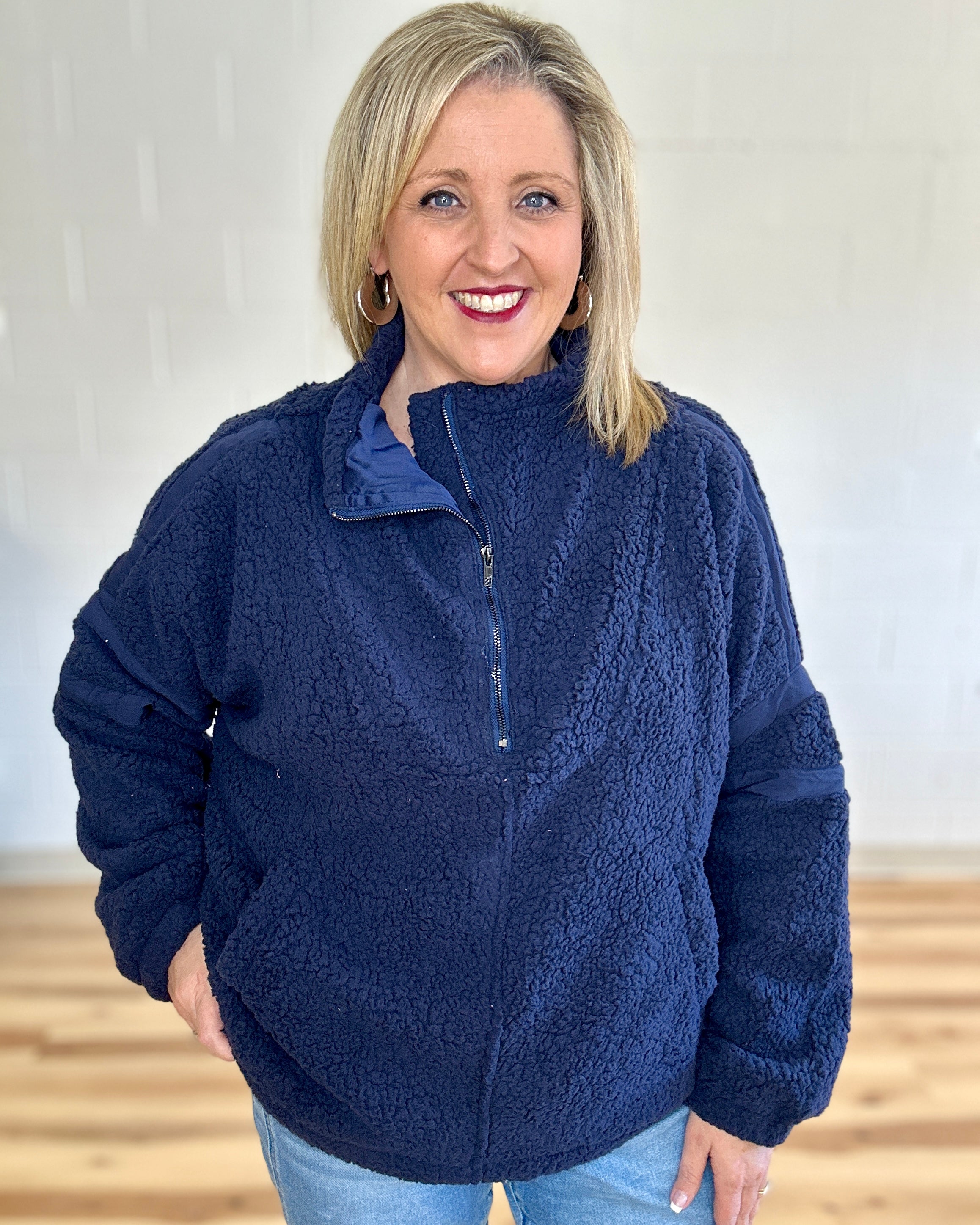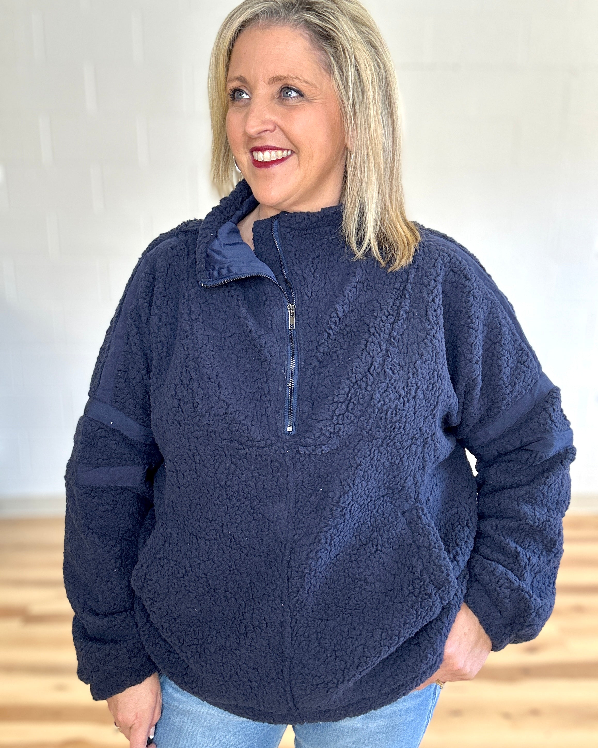 Elevate your casual wardrobe with this midnight sherpa half-zip jacket from Davi&Dani. Crafted with a plush sherpa lining for warmth and comfort, this versatile piece features a convenient half-zip front for easy layering and functional pockets to keep your essentials close. The solid design pairs effortlessly with any outfit, making it an essential addition to your everyday collection.