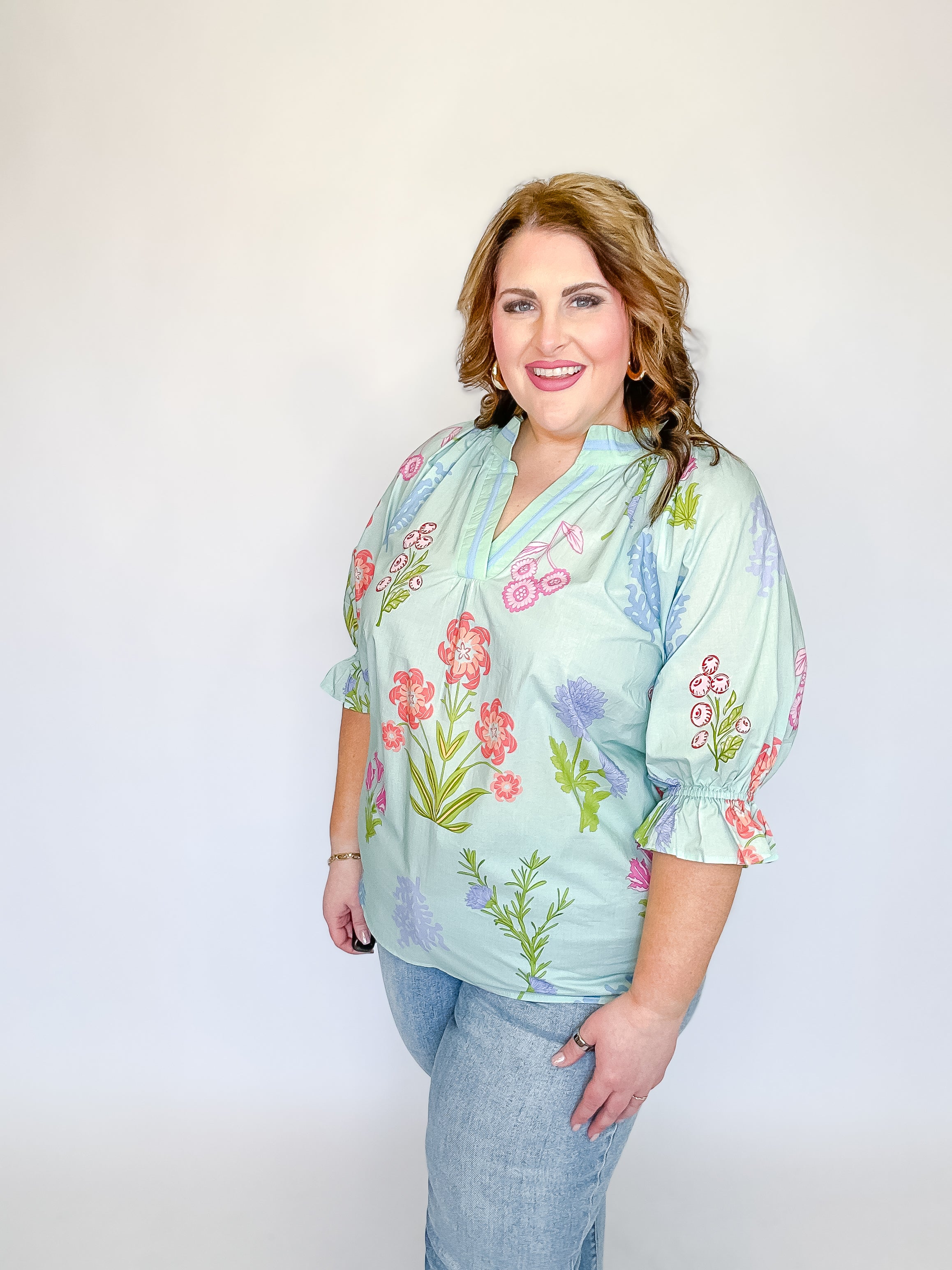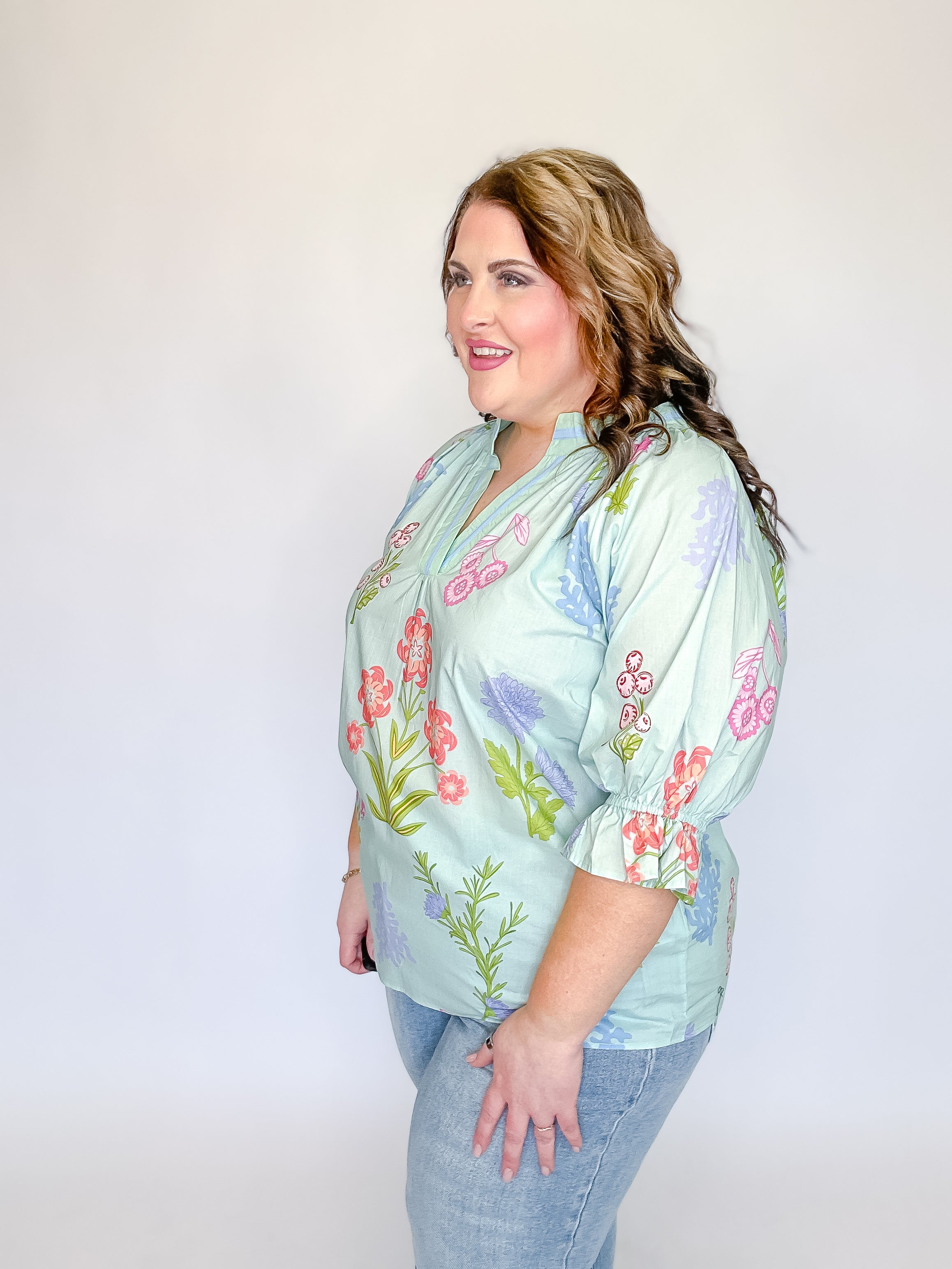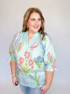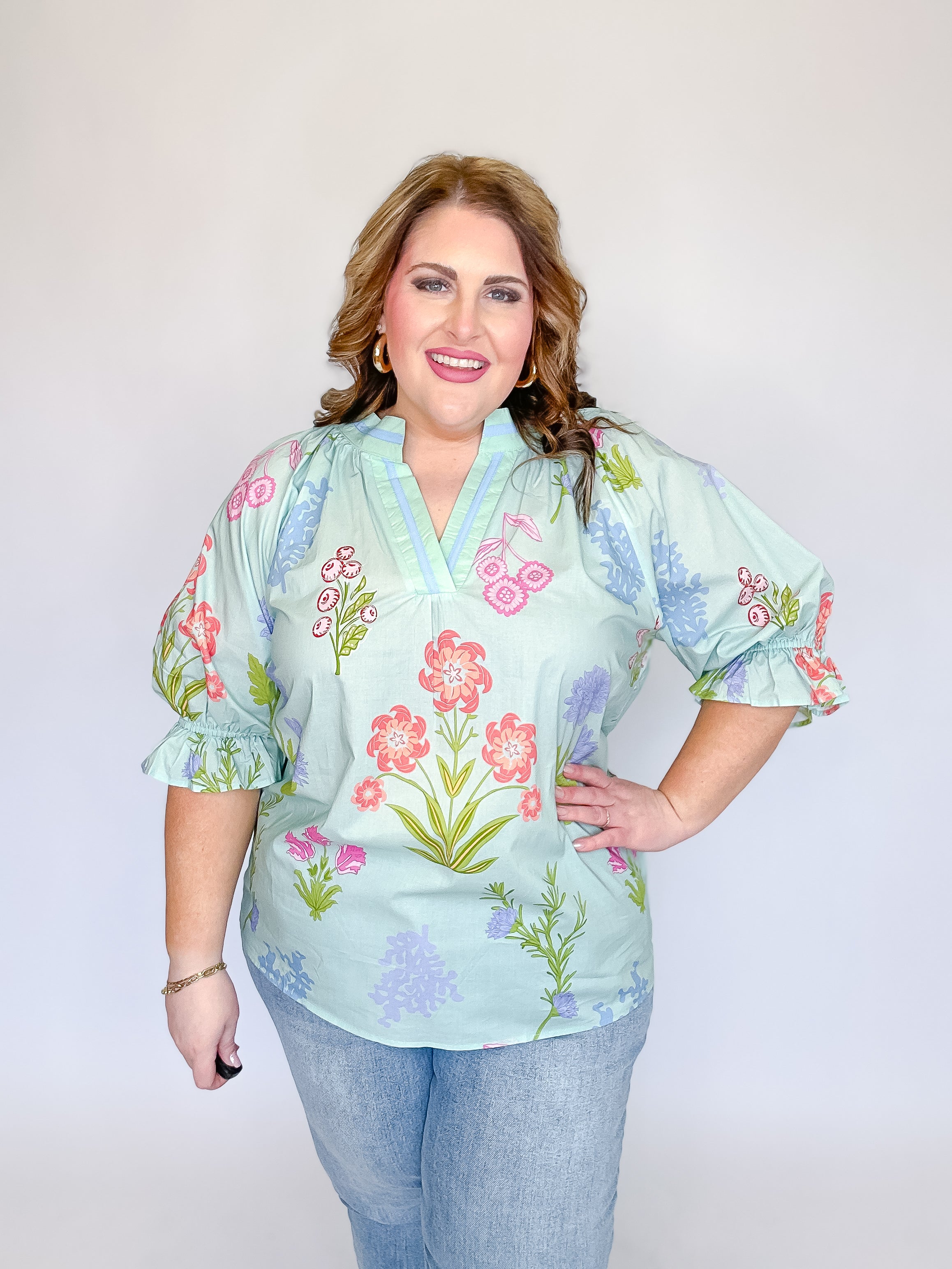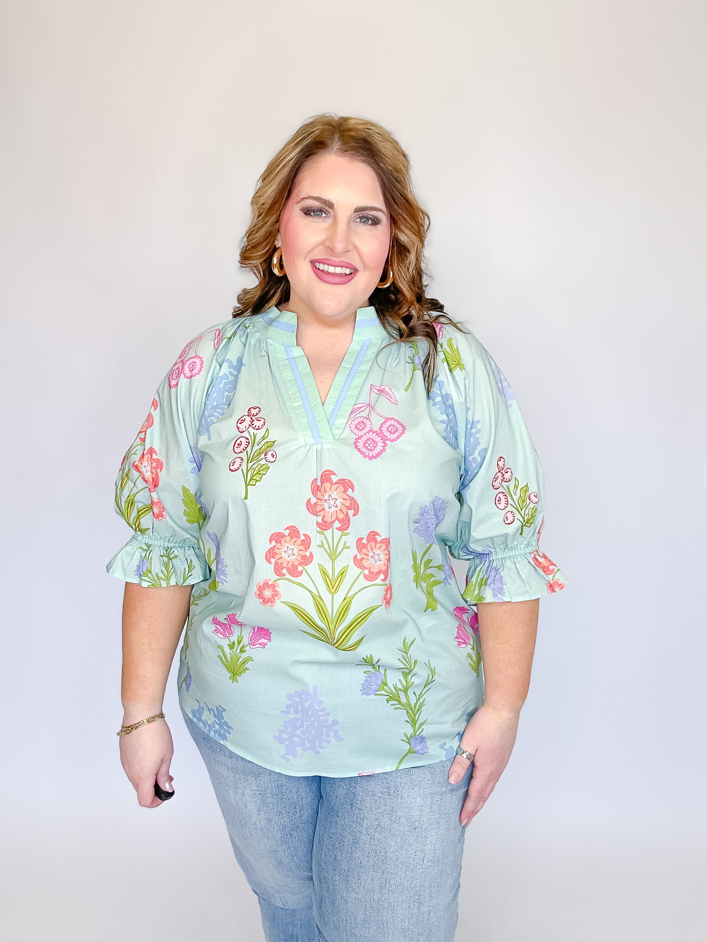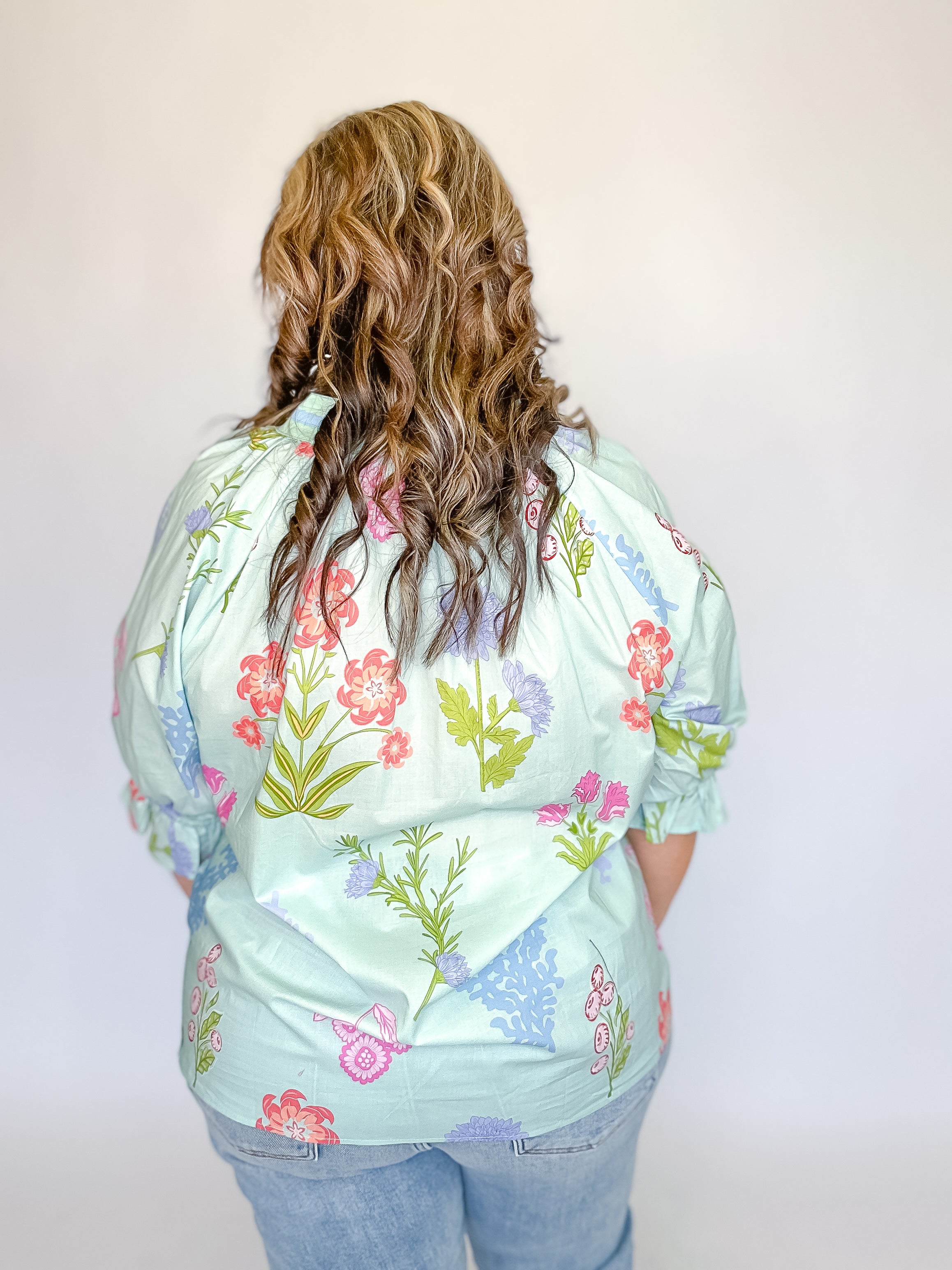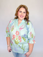 Fresh, feminine, and effortlessly polished, this floral blouse brings a breath of spring to your everyday style. Designed in a soft mint hue, it features a vibrant garden-inspired print with cheerful pops of coral, lavender, pink, and leafy green for a look that feels both playful and refined.