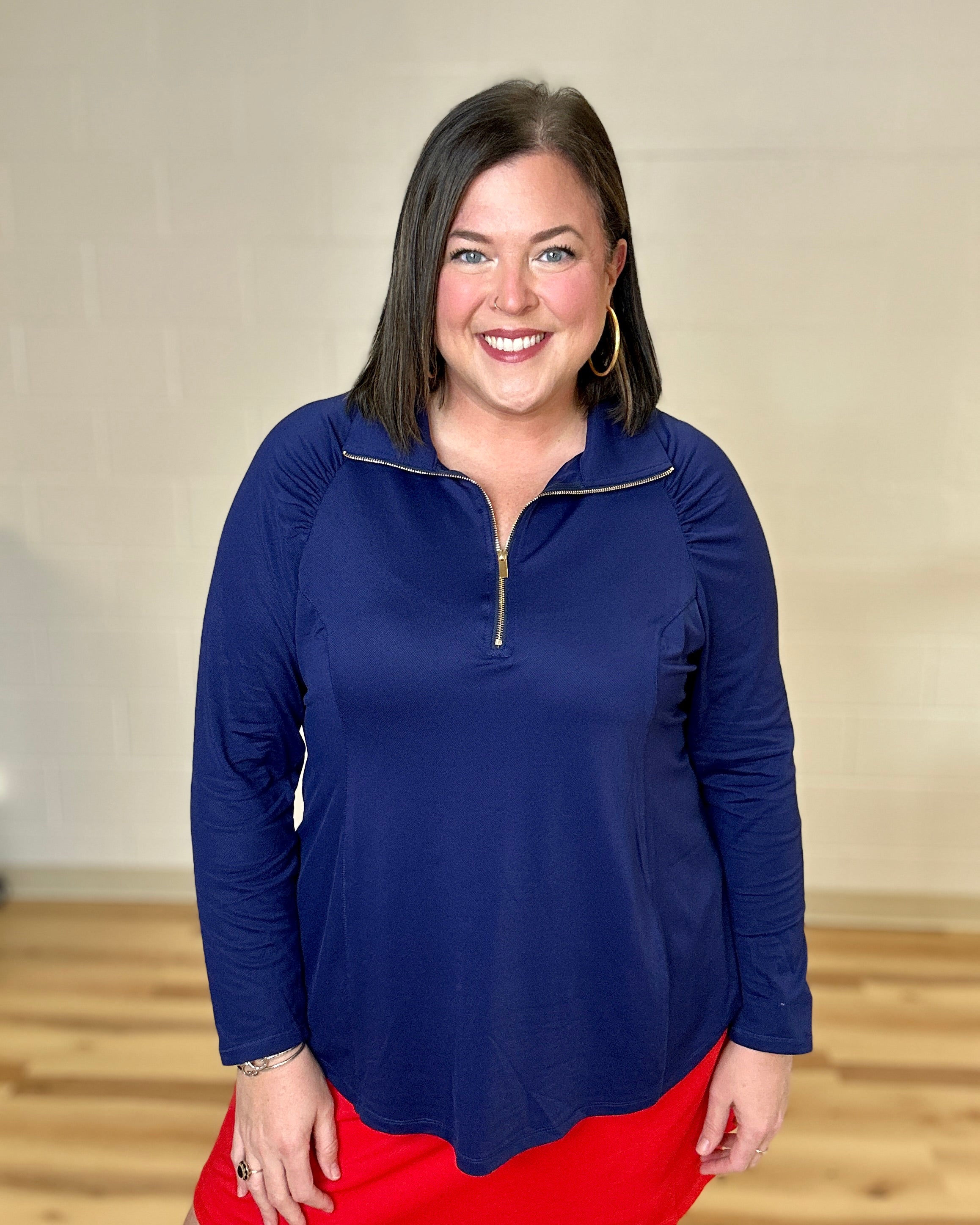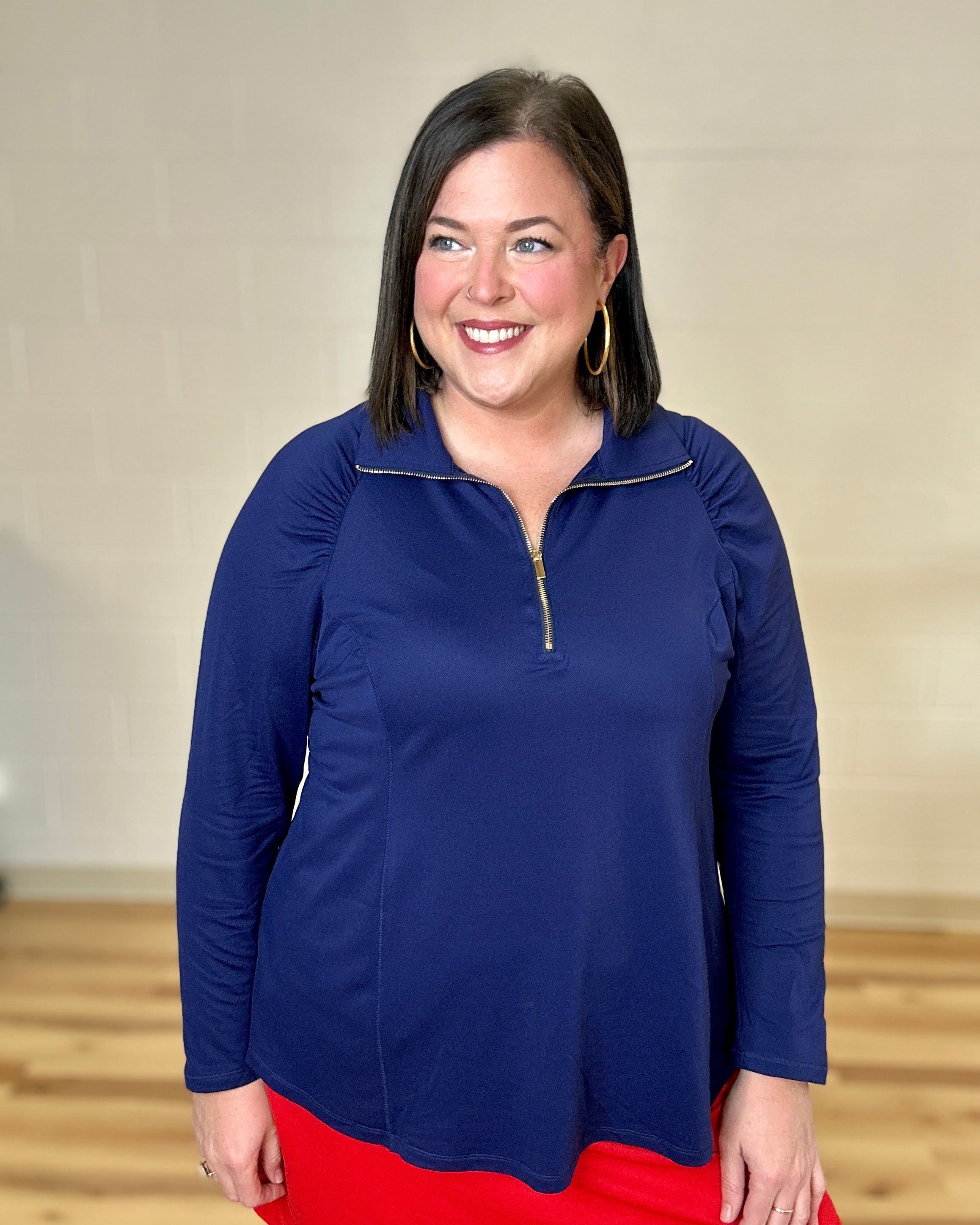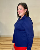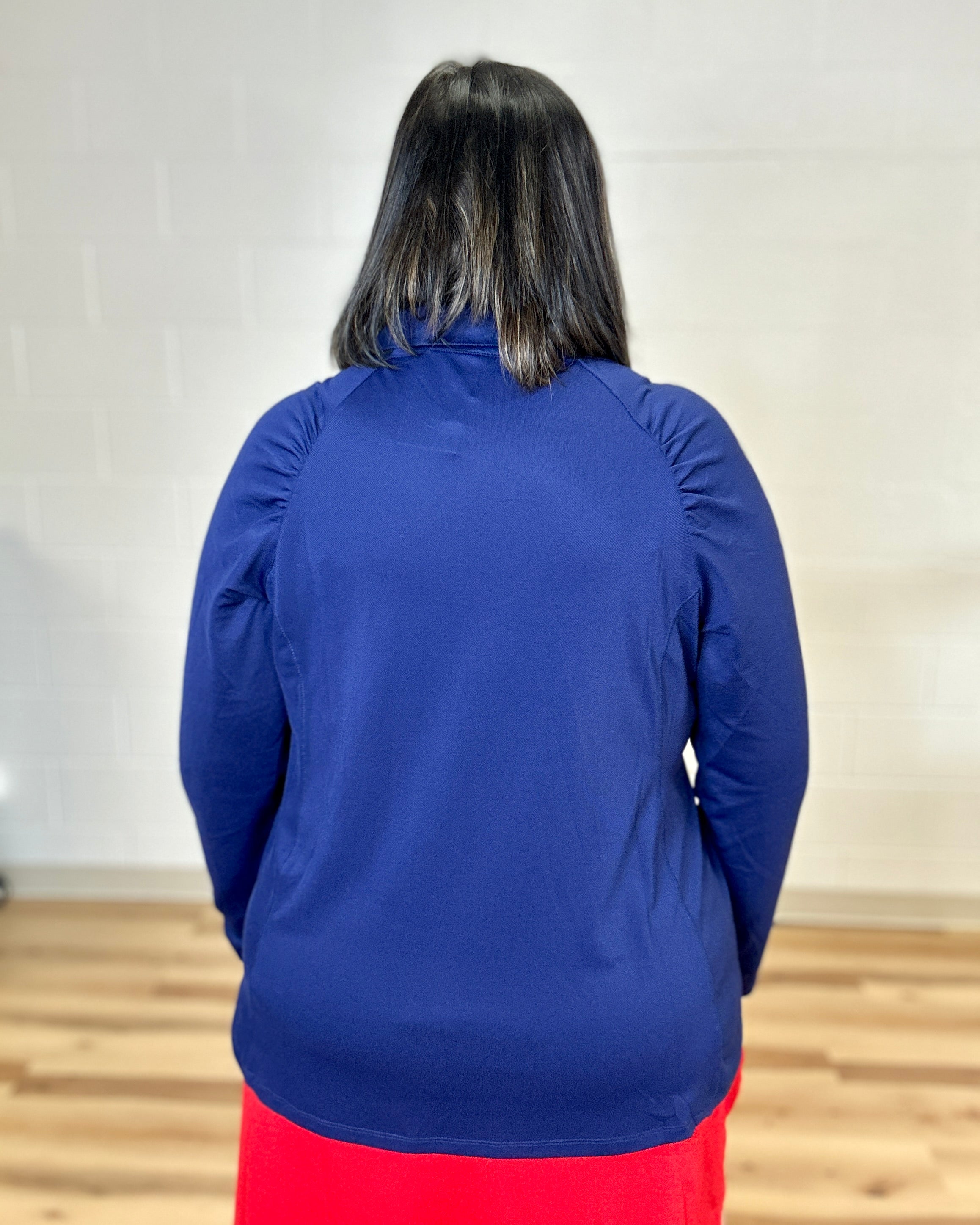 Navy Shirred Shoulder Half Zip Top