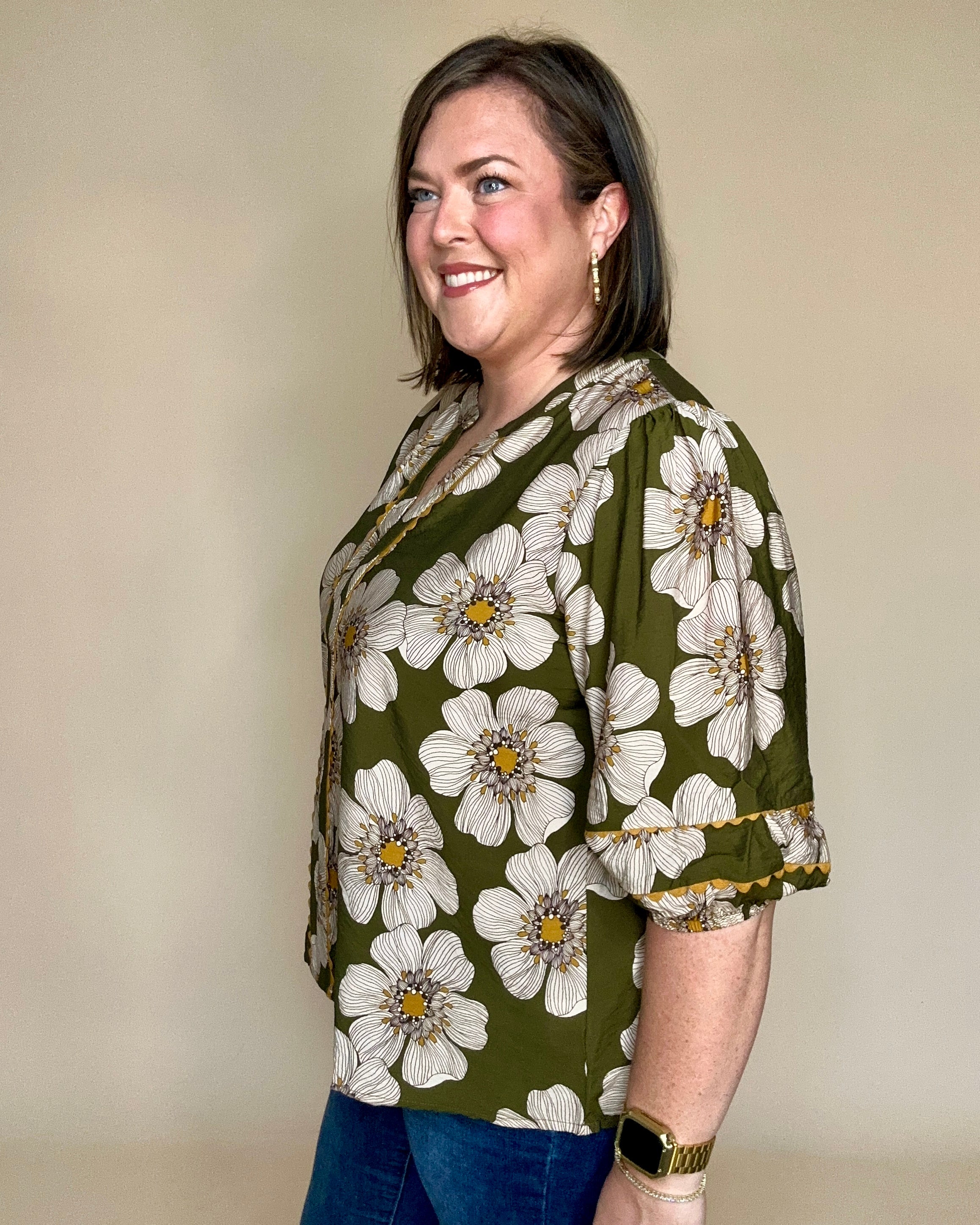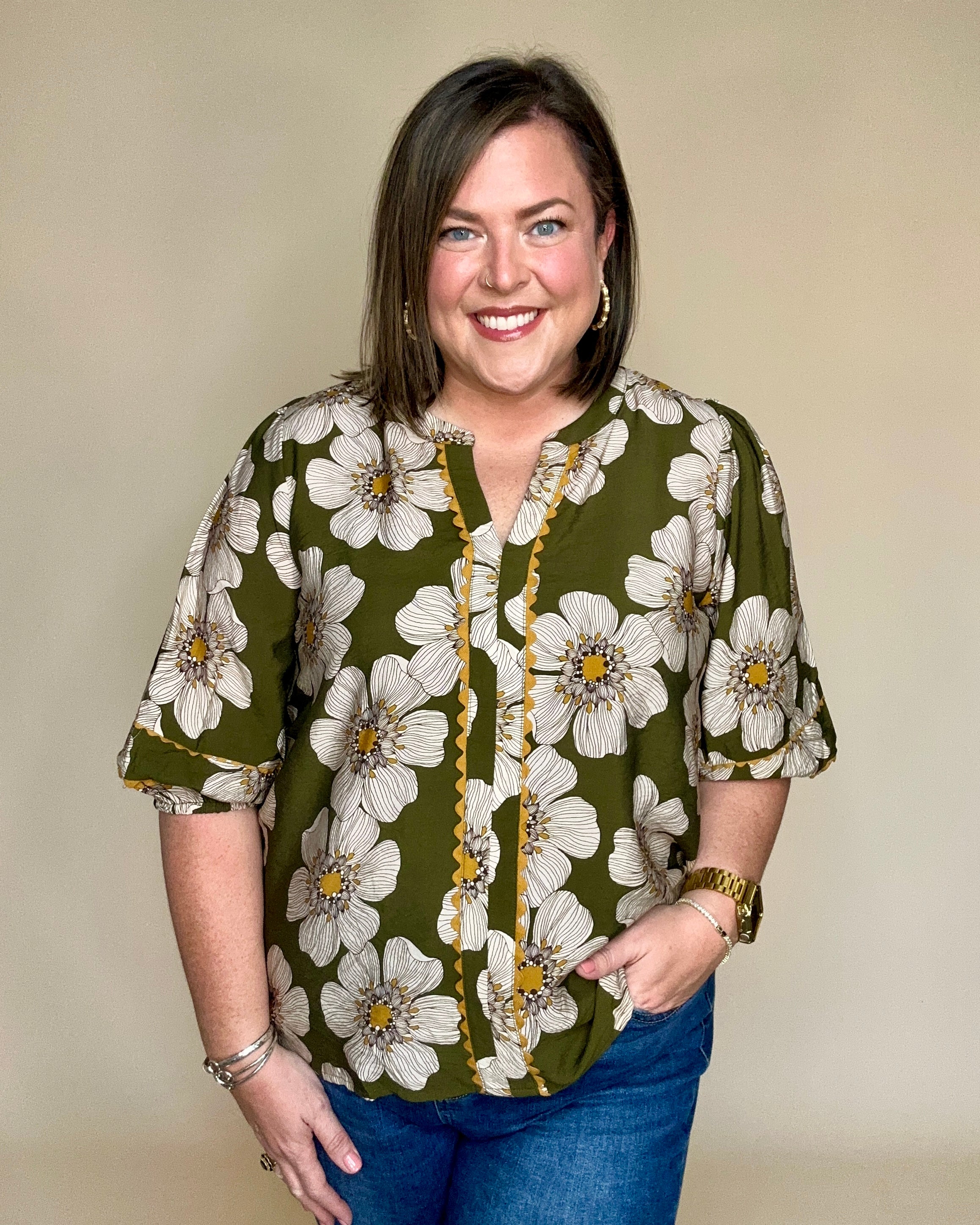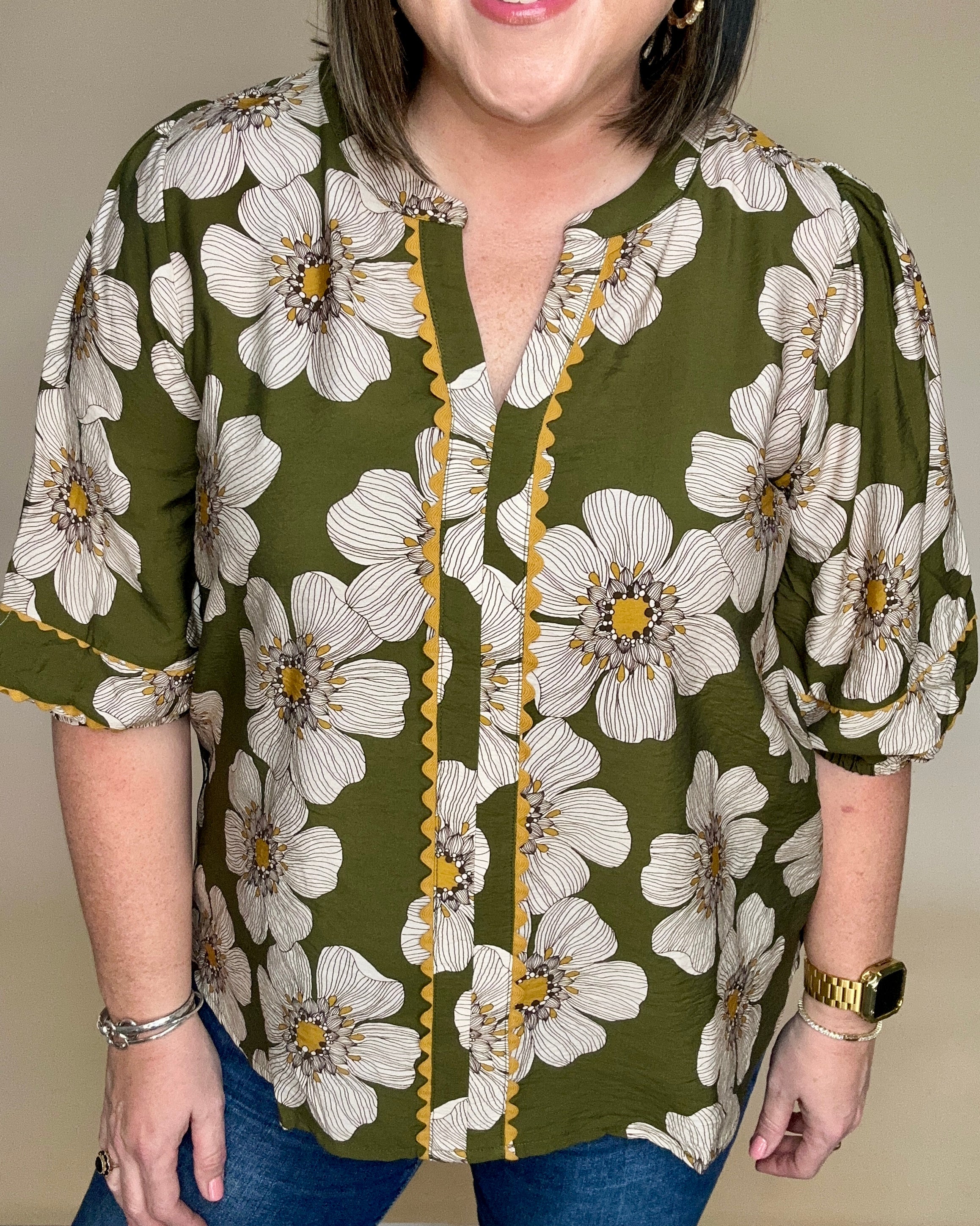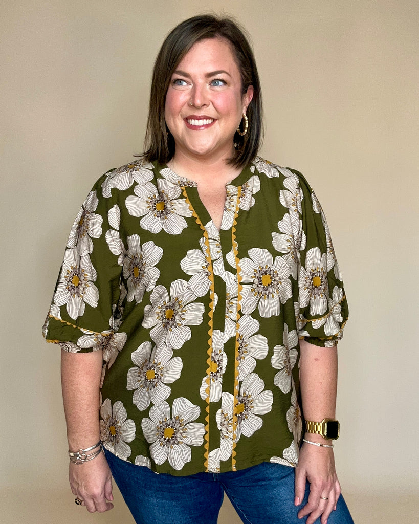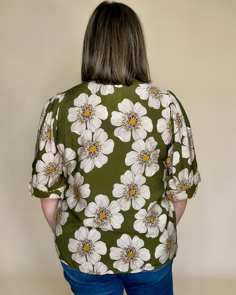 Olive Floral Scallop Trim Top
