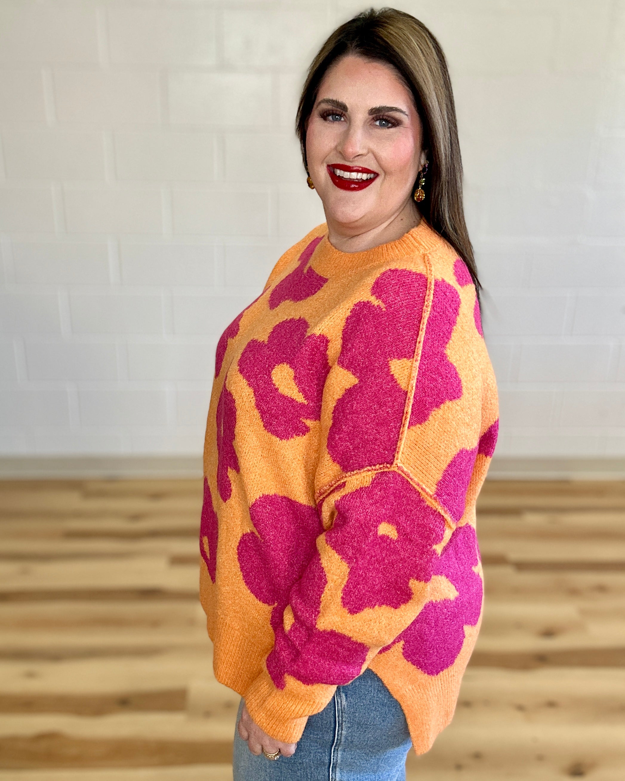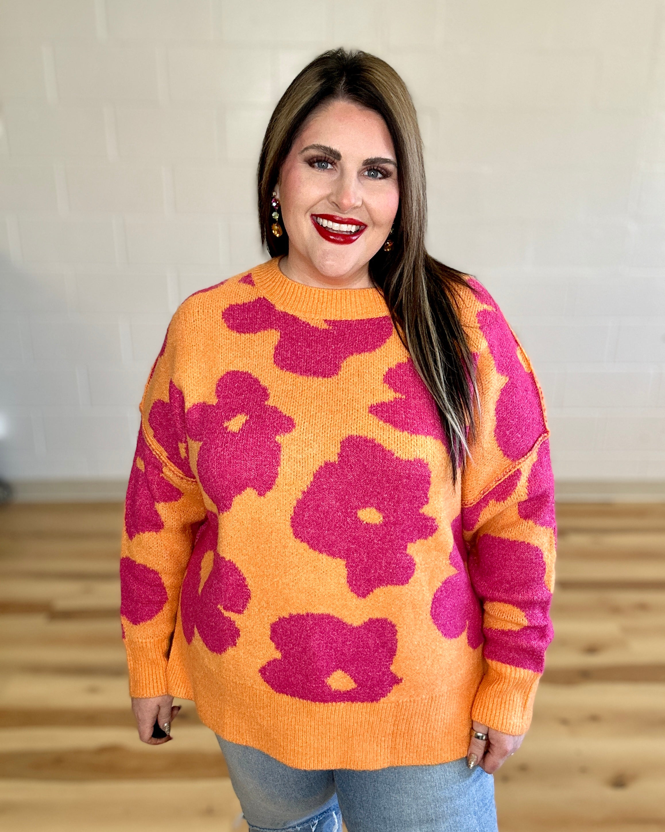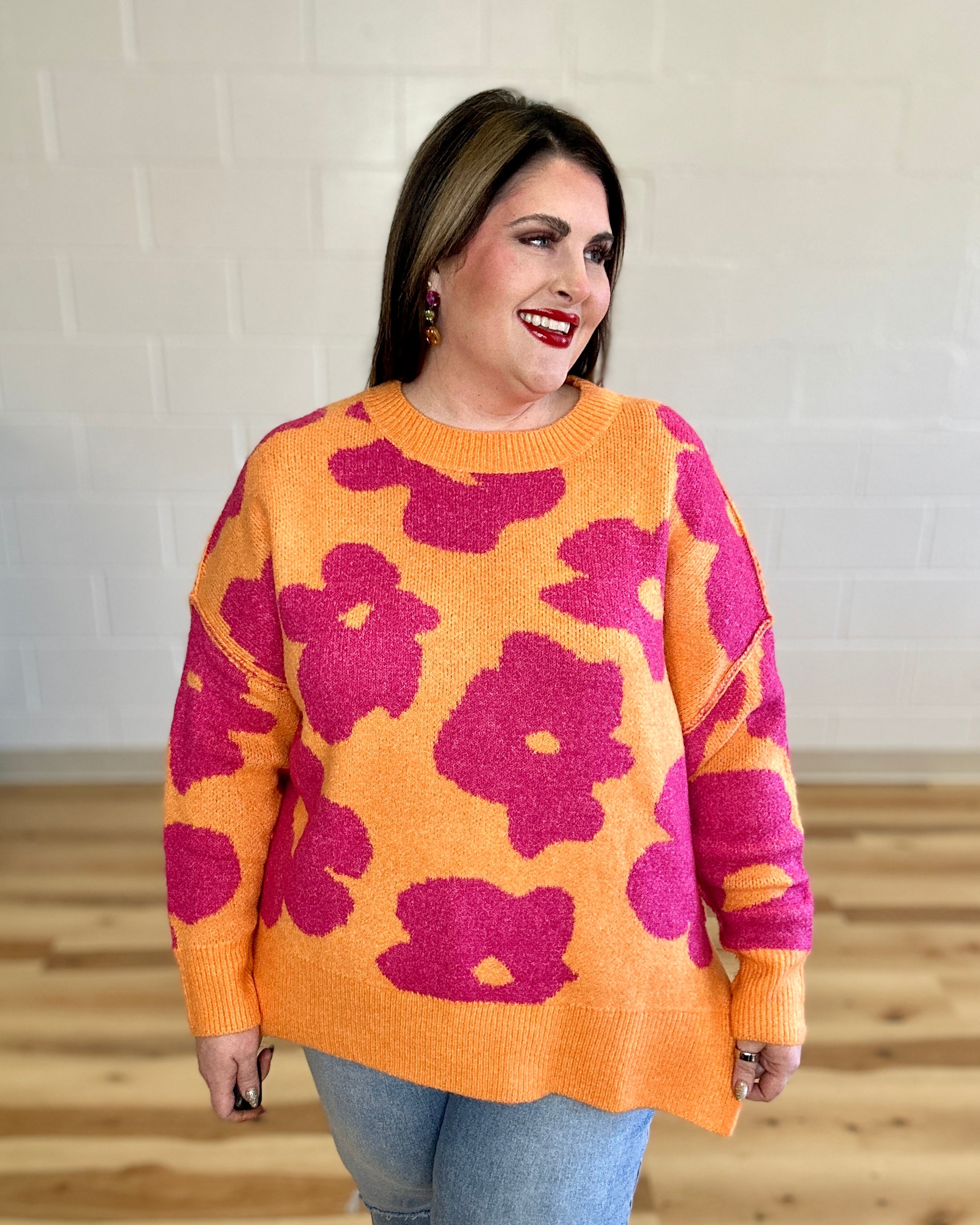 Elevate your everyday wardrobe with this oversized floral knit sweater from Davi&Dani. Striking orange and fuchsia blooms create visual interest across the entire piece, while the relaxed silhouette offers comfort without compromise. Ribbed trims provide structure and definition, while strategically placed side slits enhance movement and versatility. Layer it effortlessly over basics or pair with denim and wide-leg trousers for a polished, intentional look that transitions seamlessly from season to season.