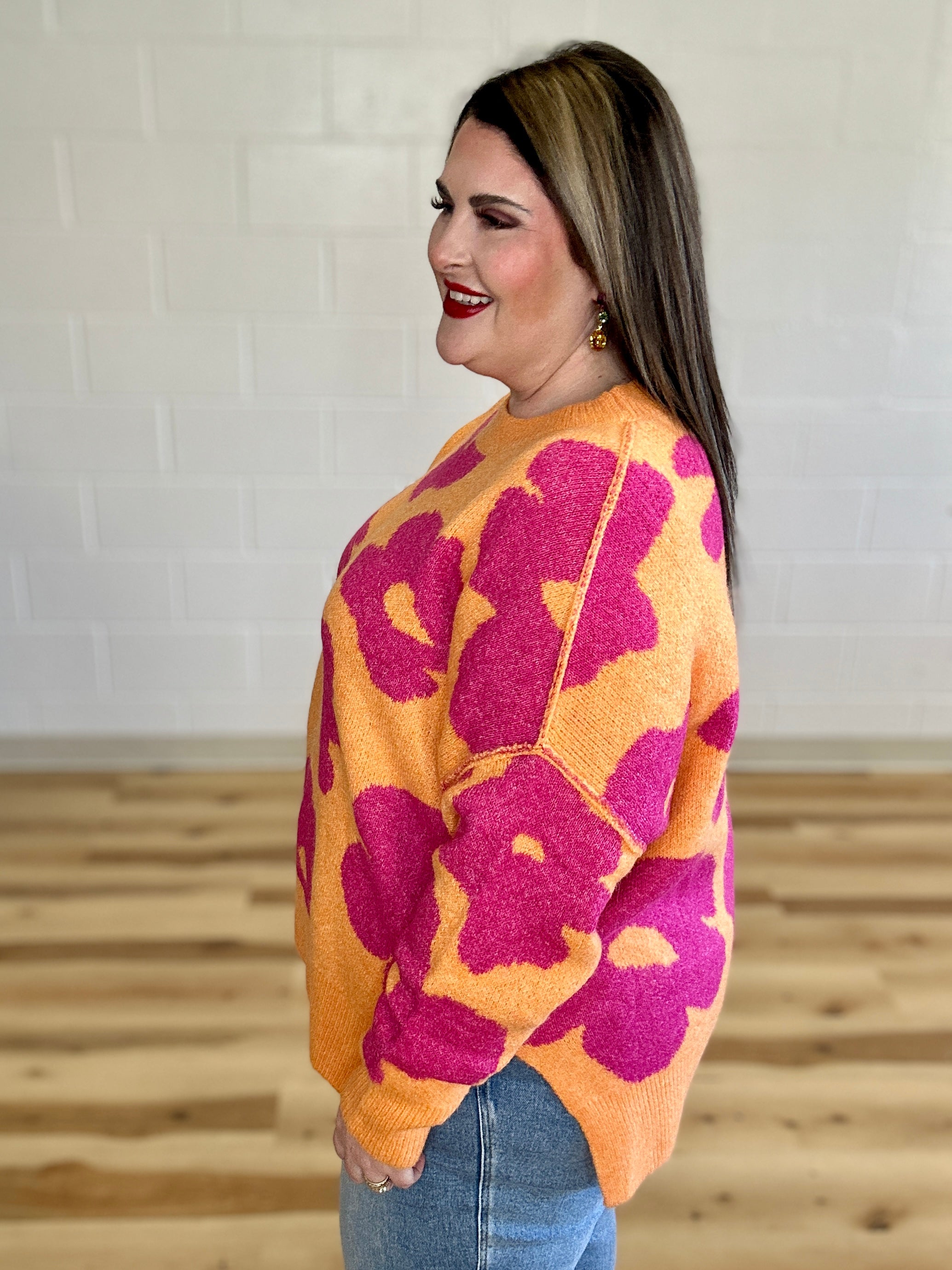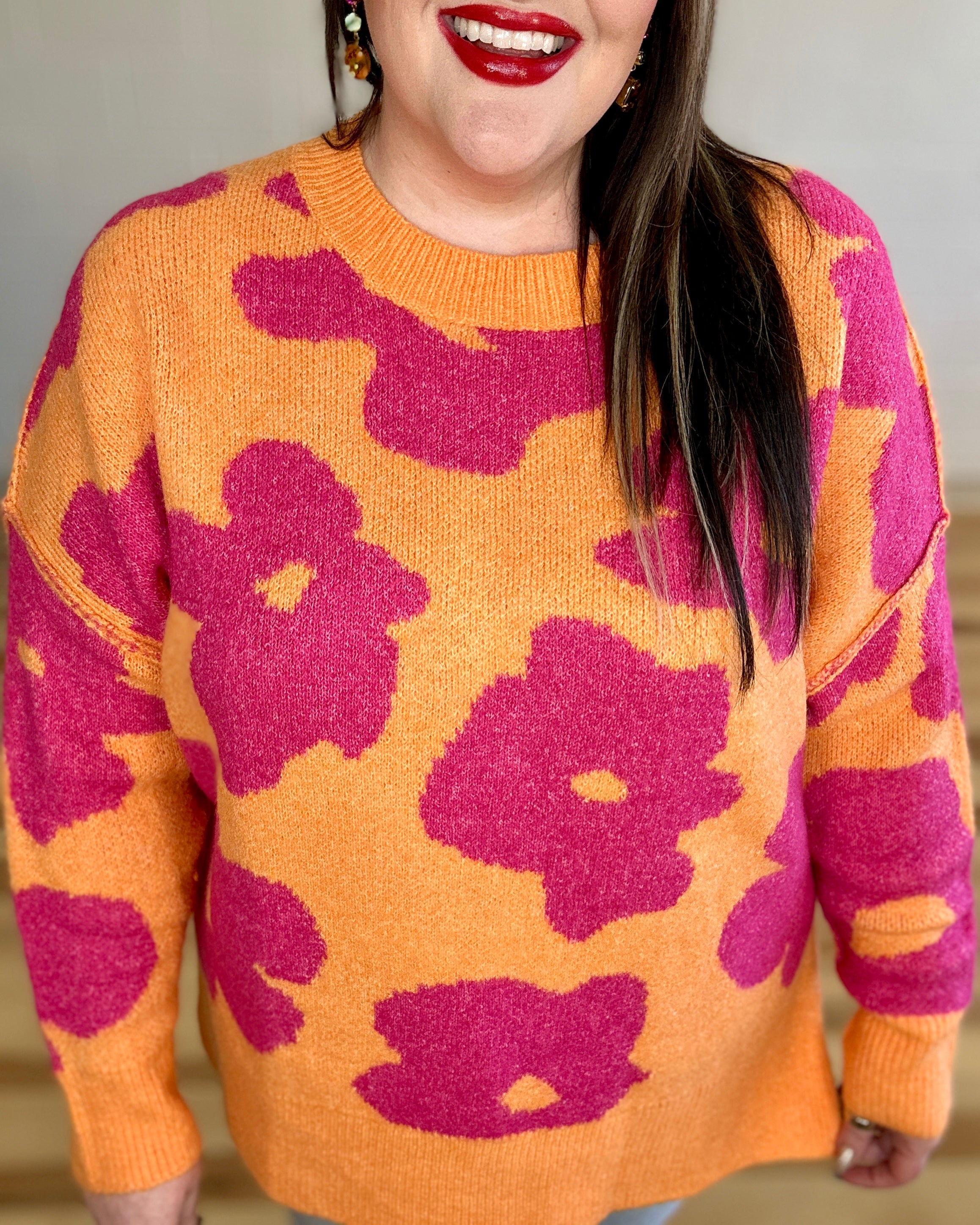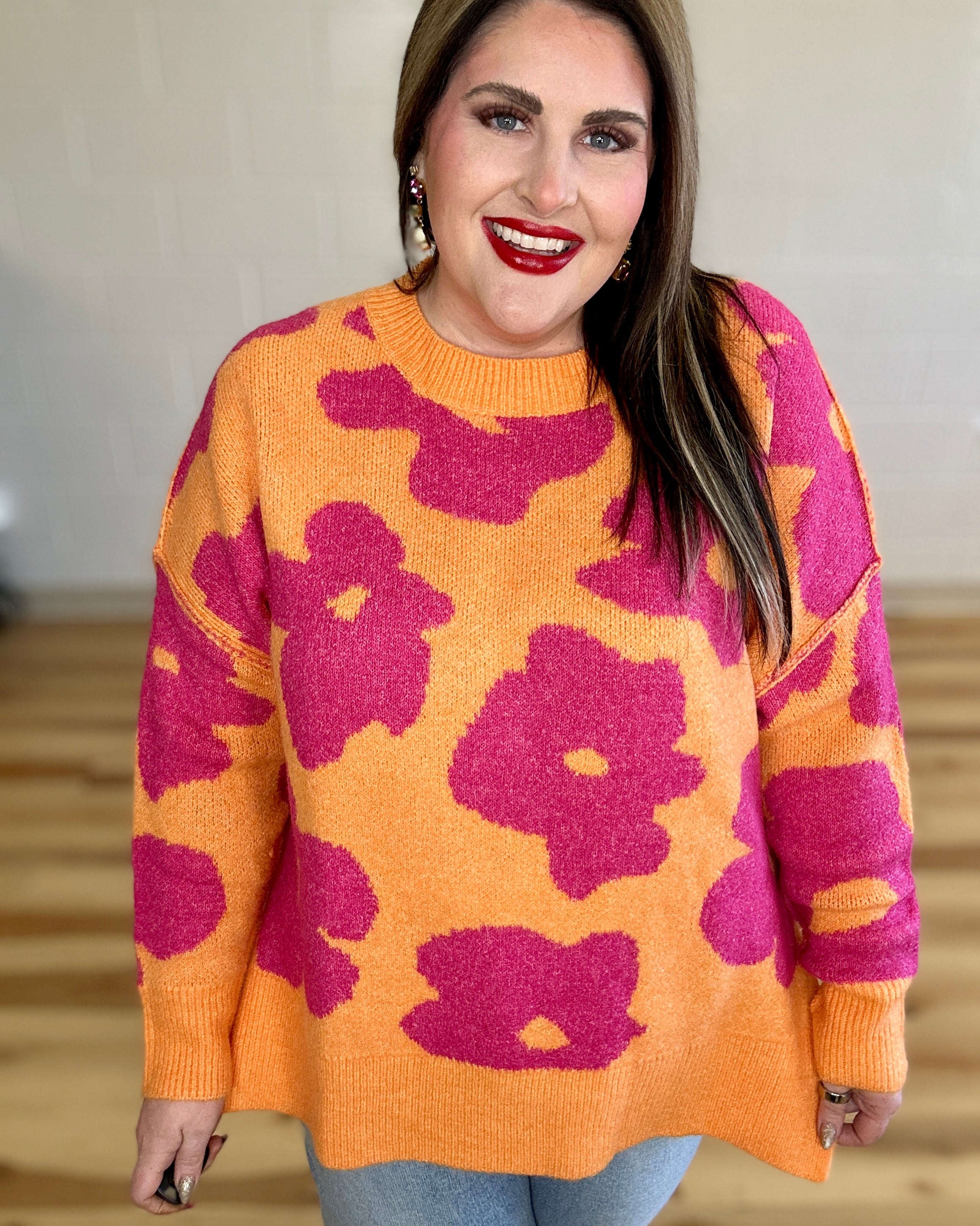 Elevate your everyday wardrobe with this oversized floral knit sweater from Davi&Dani. Striking orange and fuchsia blooms create visual interest across the entire piece, while the relaxed silhouette offers comfort without compromise. Ribbed trims provide structure and definition, while strategically placed side slits enhance movement and versatility. Layer it effortlessly over basics or pair with denim and wide-leg trousers for a polished, intentional look that transitions seamlessly from season to season.