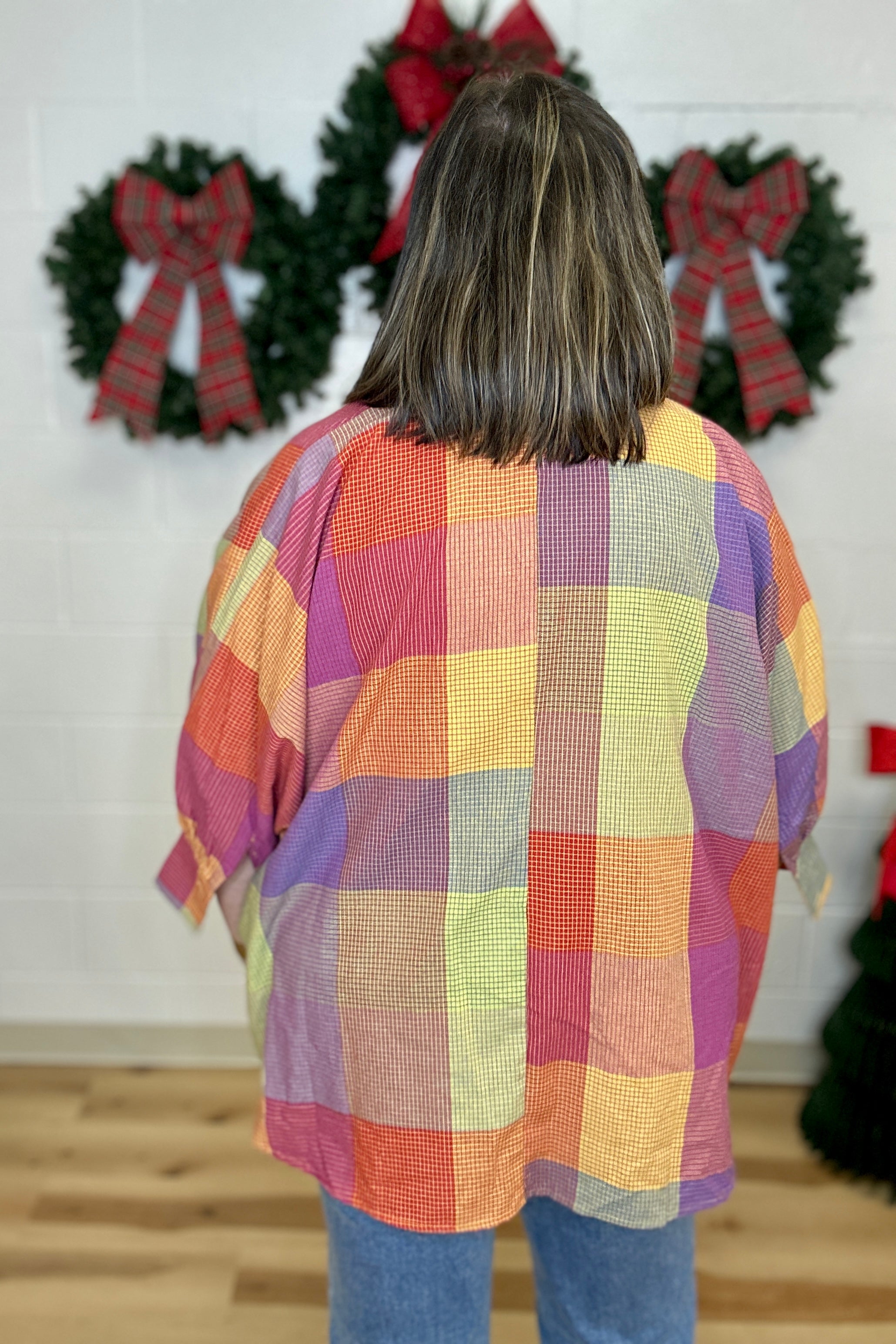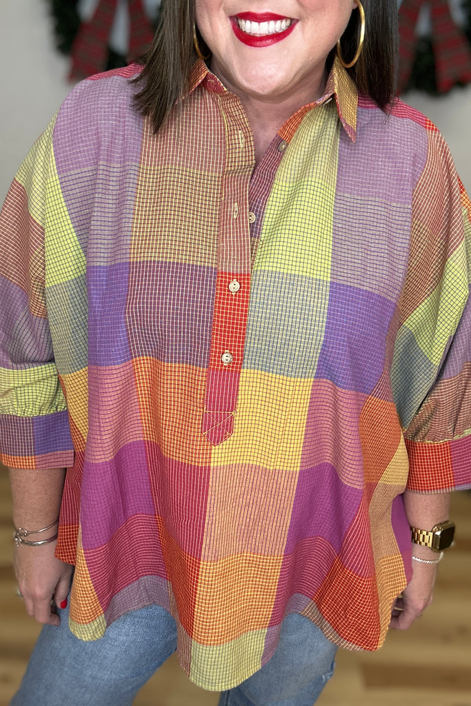 Stay stylish and comfortable in this Orange Plaid Checkered Oversized Top. Its checkered/plaid pattern, dropped shoulders, and curved hem add a touch of playfulness to your wardrobe. Featuring dolman sleeves, a collared neckline with button down placket, and a longer back, this shirt is perfect!