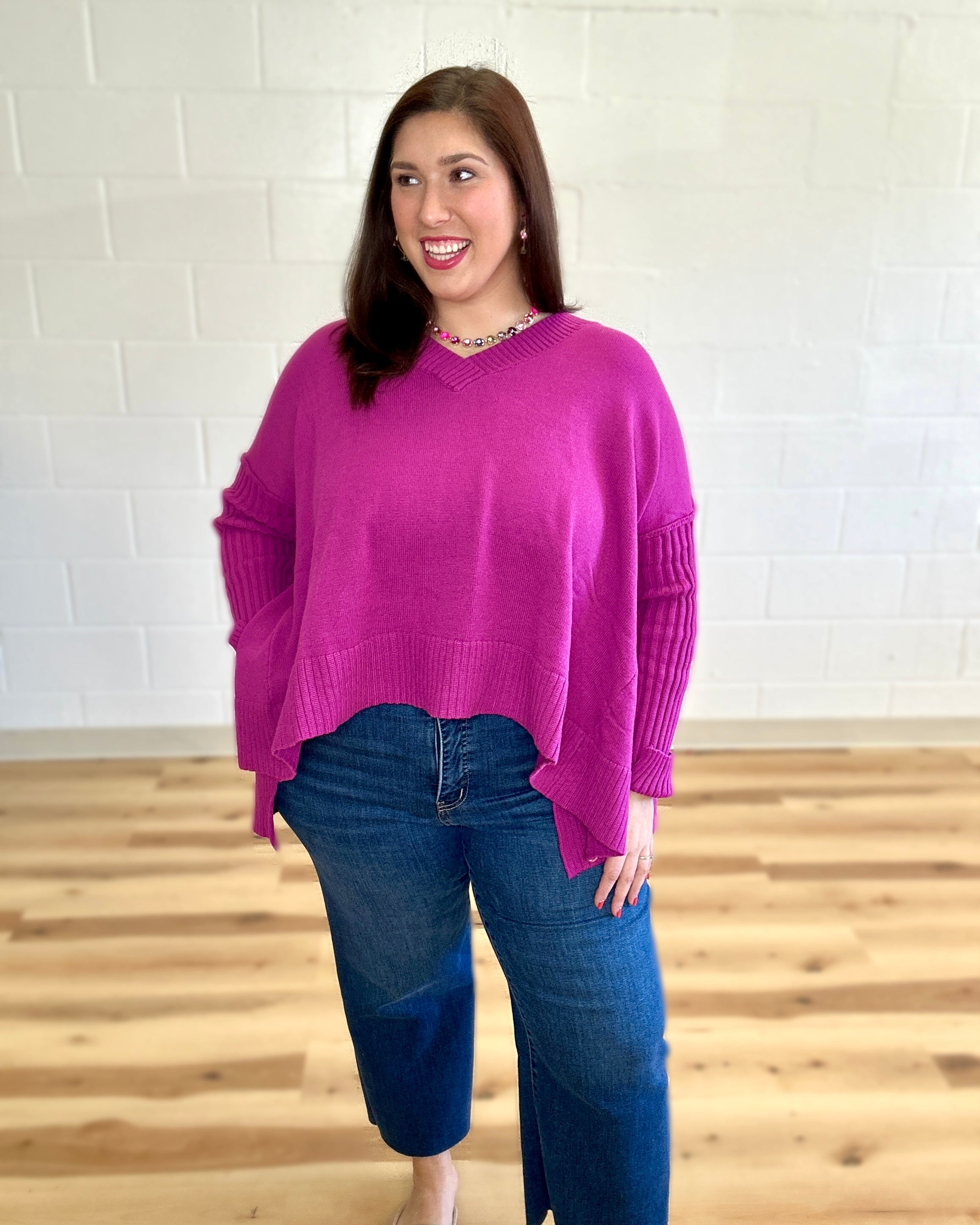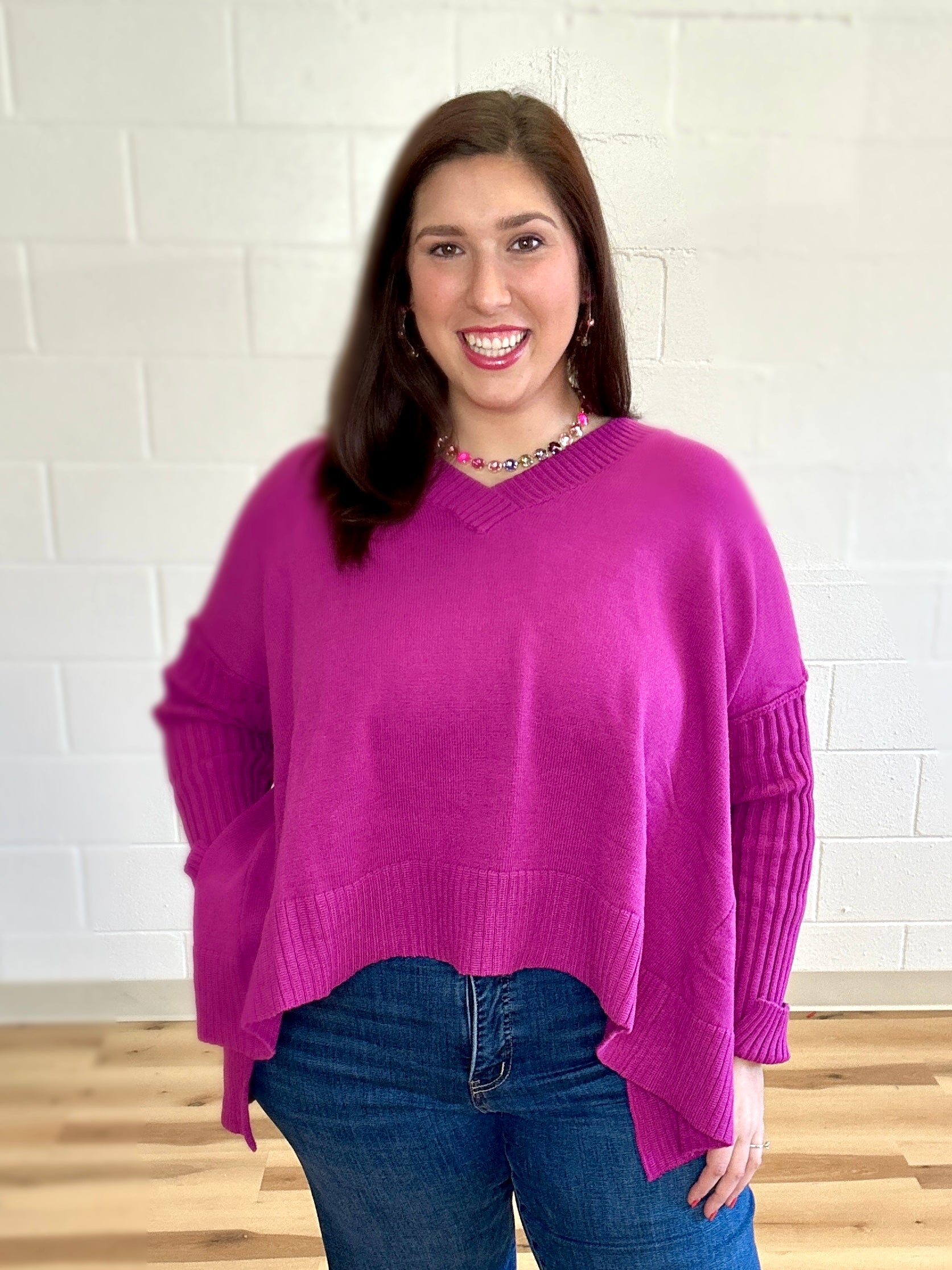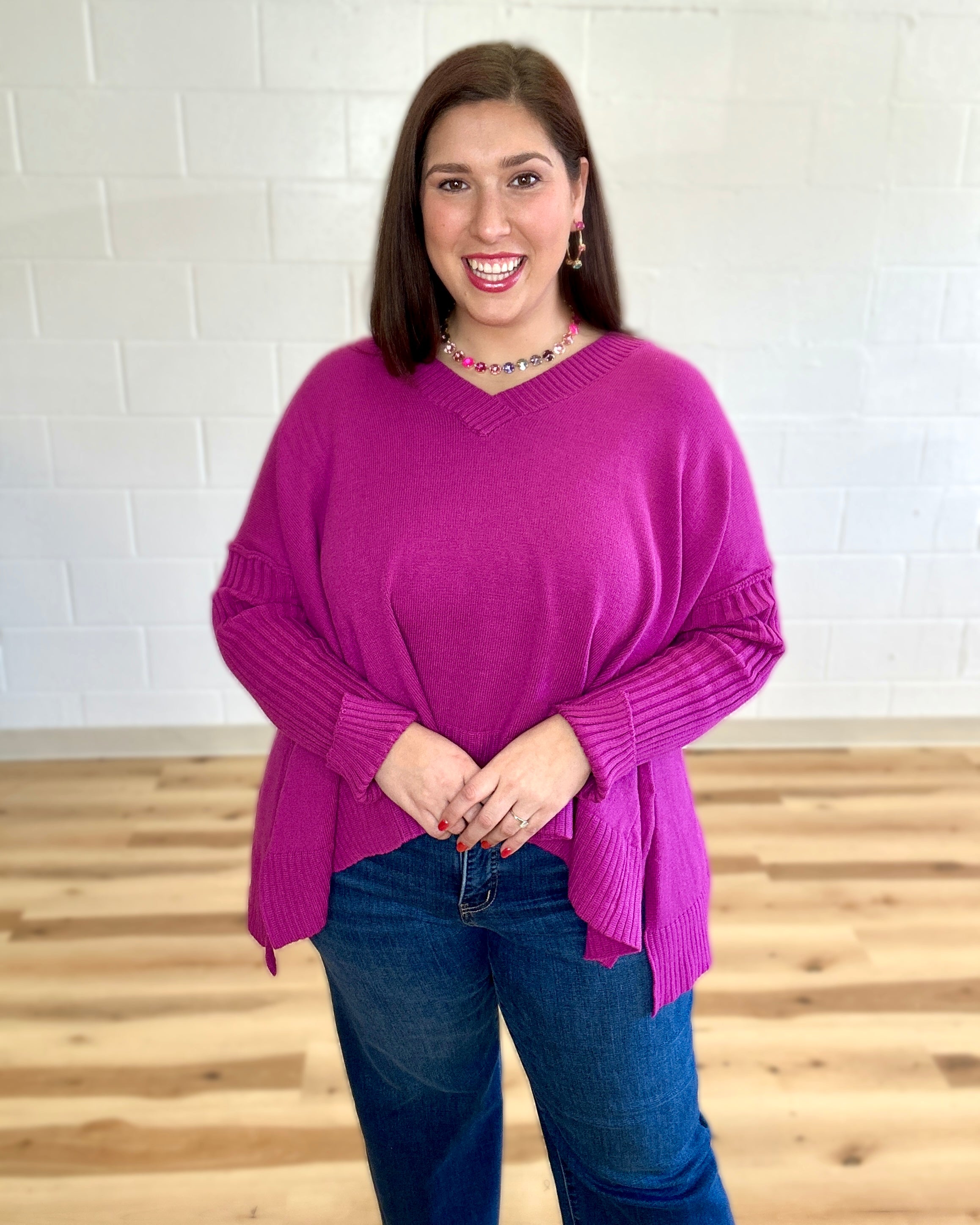 Elevate your everyday wardrobe with this oversized pullover knit sweater from Davi&Dani. Crafted with a flattering v-neckline and ribbed sleeves, this piece delivers sophisticated comfort with modern edge. The strategic side slits add movement and visual interest while maintaining the relaxed, contemporary silhouette. Perfect for layering or wearing solo, this versatile top transitions seamlessly from casual to polished occasions. An investment piece that combines quality construction with timeless design.