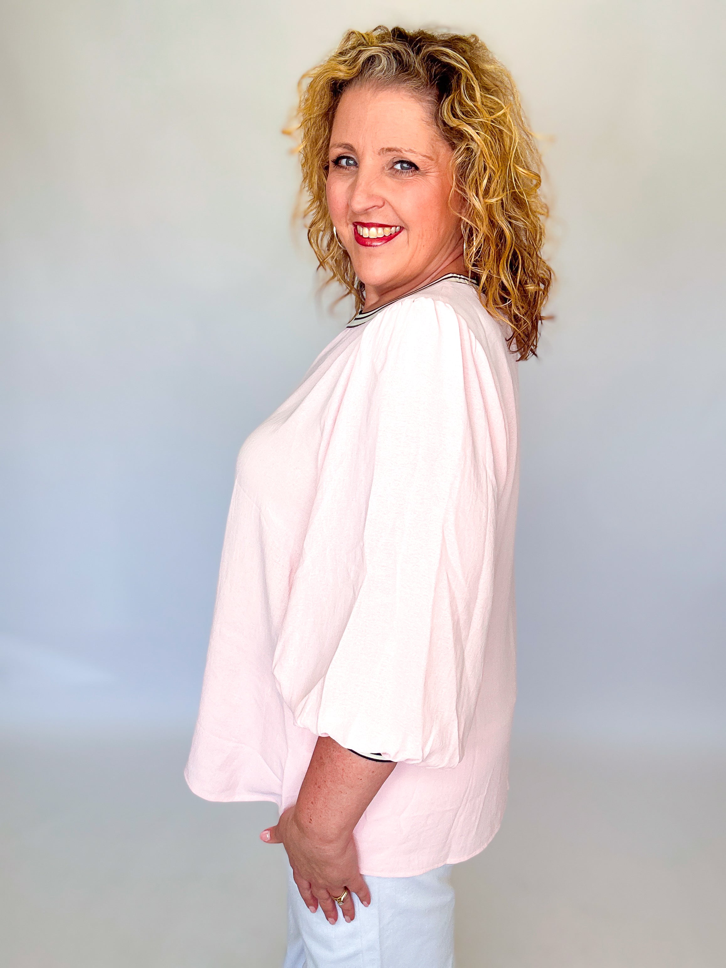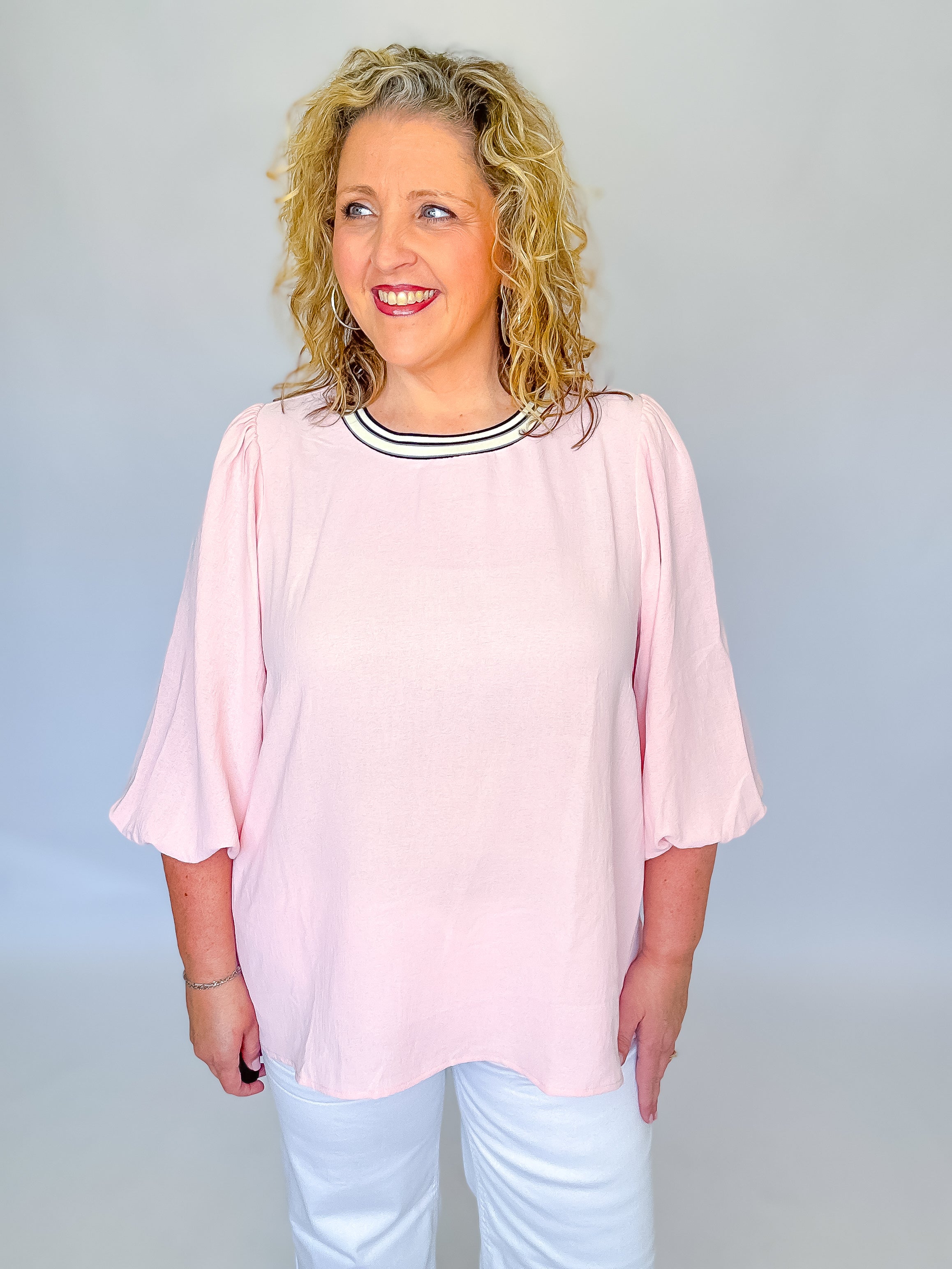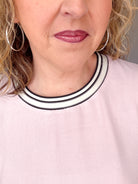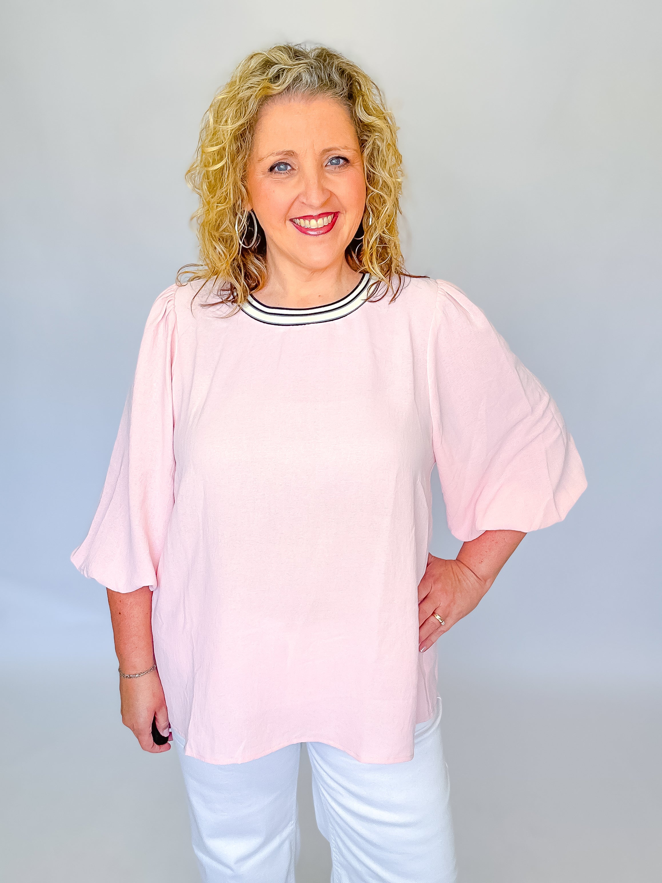 Breathe easy in this light pink top from Oddi, engineered with solid airflow fabric that keeps you cool and comfortable all day long. The striped ribbed neckline adds a touch of edge, while cuffed balloon sleeves deliver a daring silhouette that commands attention. Perfect for those who refuse to blend in—style that moves as freely as you do.