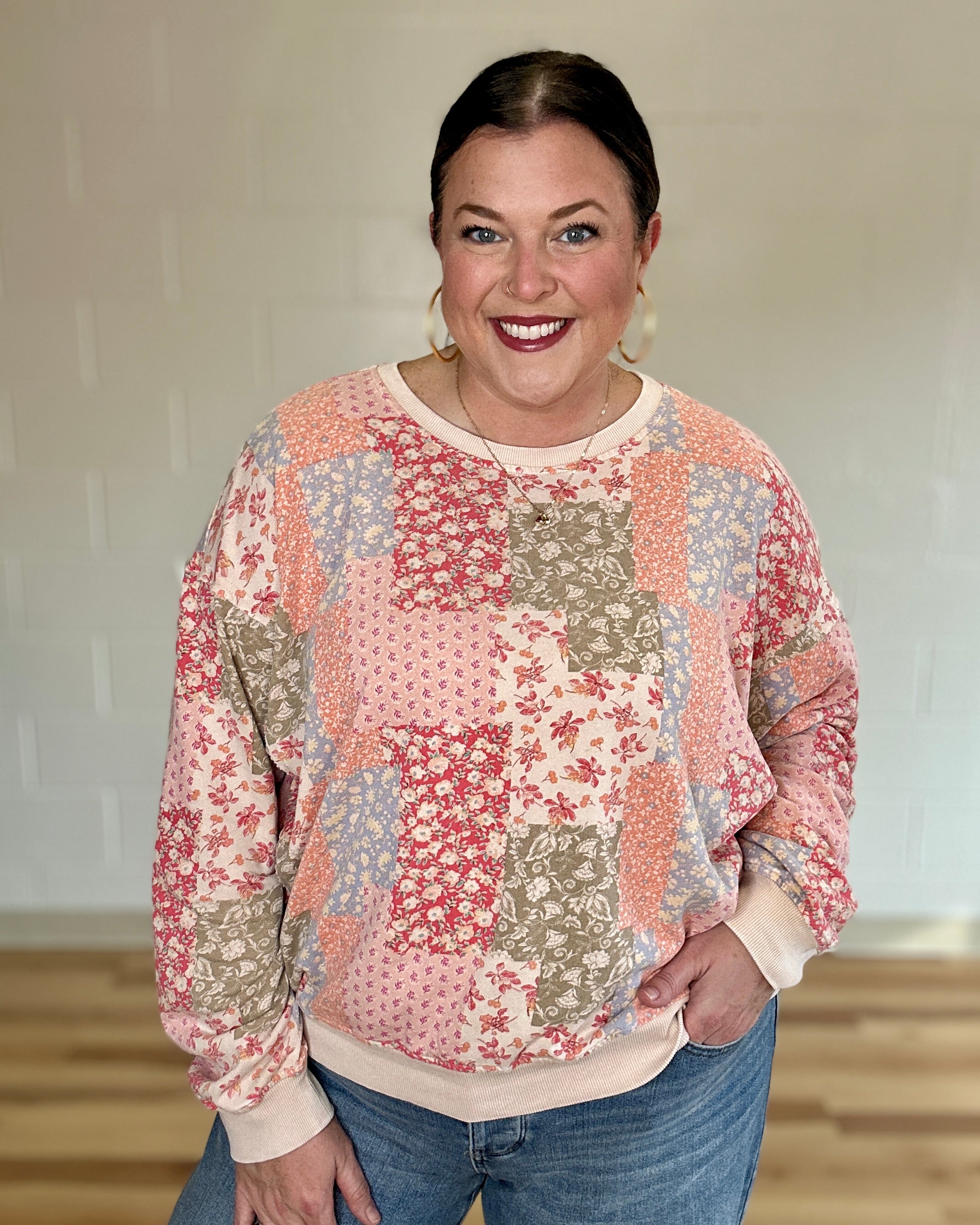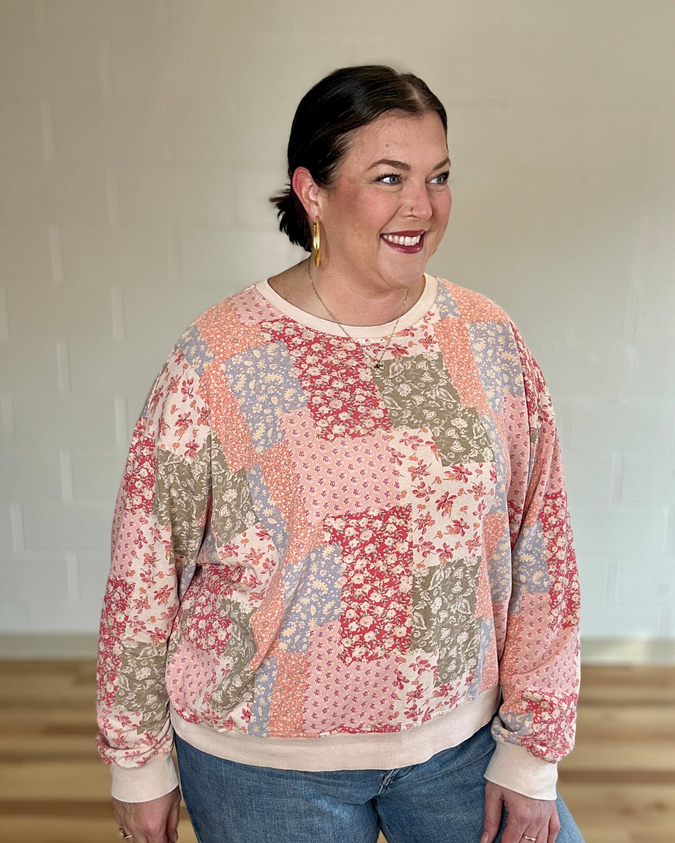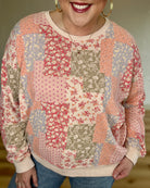 Embrace effortless style with this floral printed washed terry pullover that refuses to play it safe. The mineral-washed fabric delivers a lived-in, vintage vibe while the bold patchwork design makes a statement. Dropped shoulders and a rounded neckline create an unexpectedly cool silhouette, while banded ribbed cuffs and hem keep things grounded. Perfect as a standalone piece or paired with the matching lounge set for a coordinated look that's equal parts comfort and attitude.
