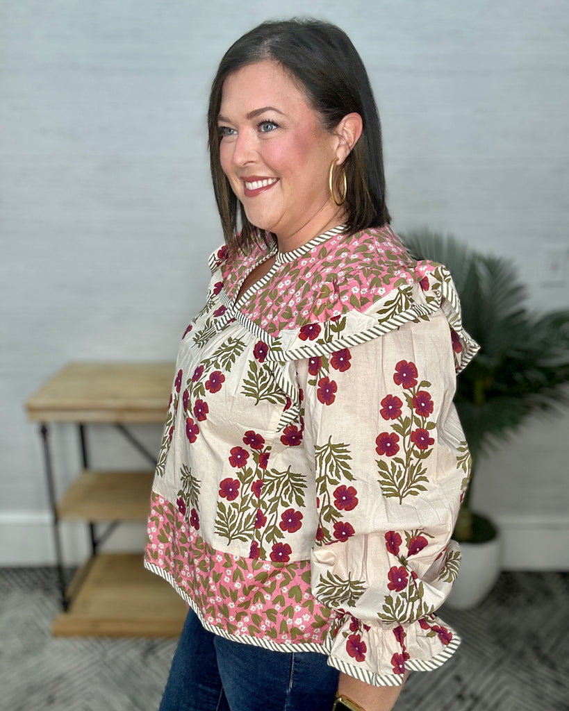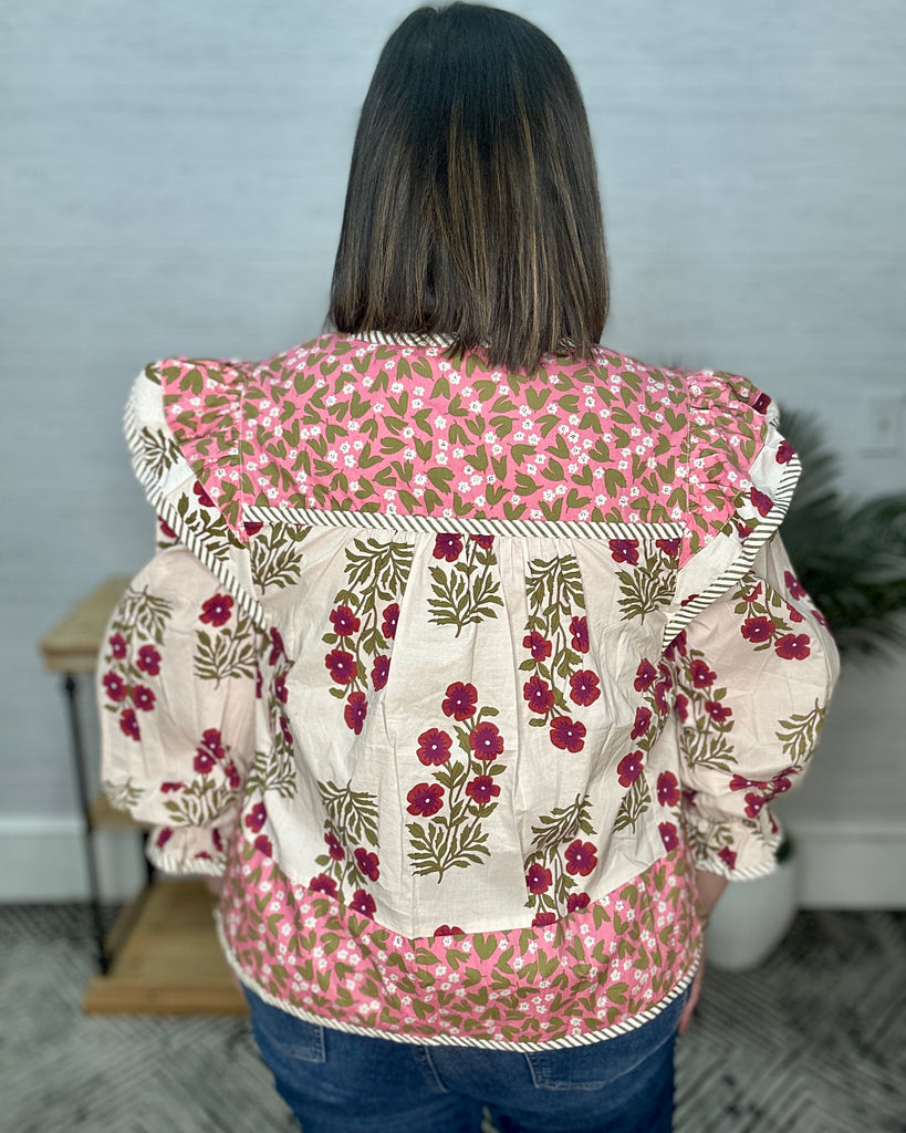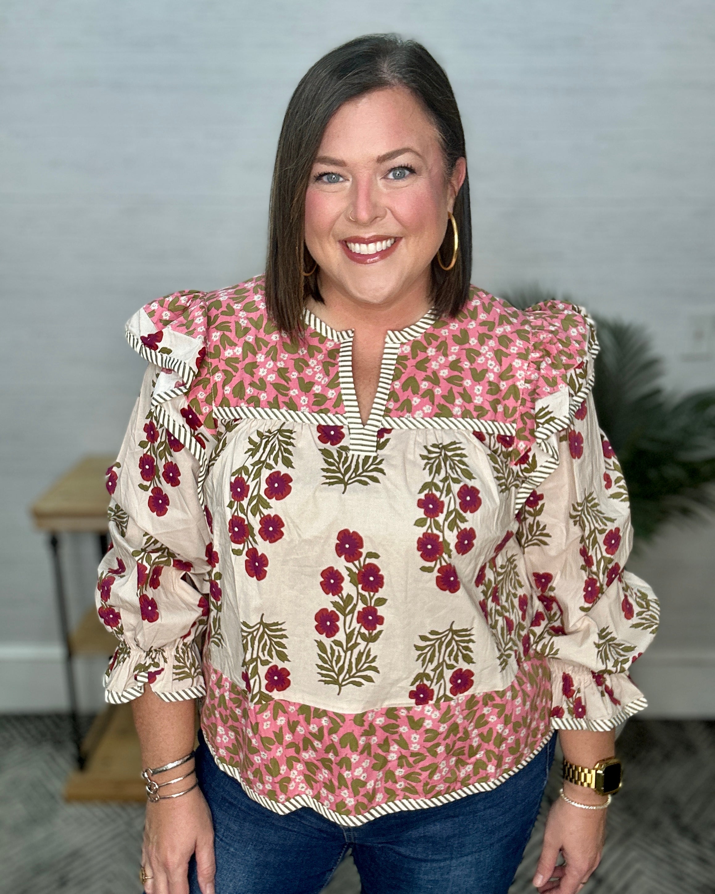 Elevate your wardrobe with this long puff sleeve top by Entro, featuring a delicate multi-print ruffle accent on the shoulders and a striking striped contrast V-neck band. Crafted from lightweight woven fabric, this unlined, non-sheer piece offers both comfort and refined style, perfect for sophisticated everyday wear.