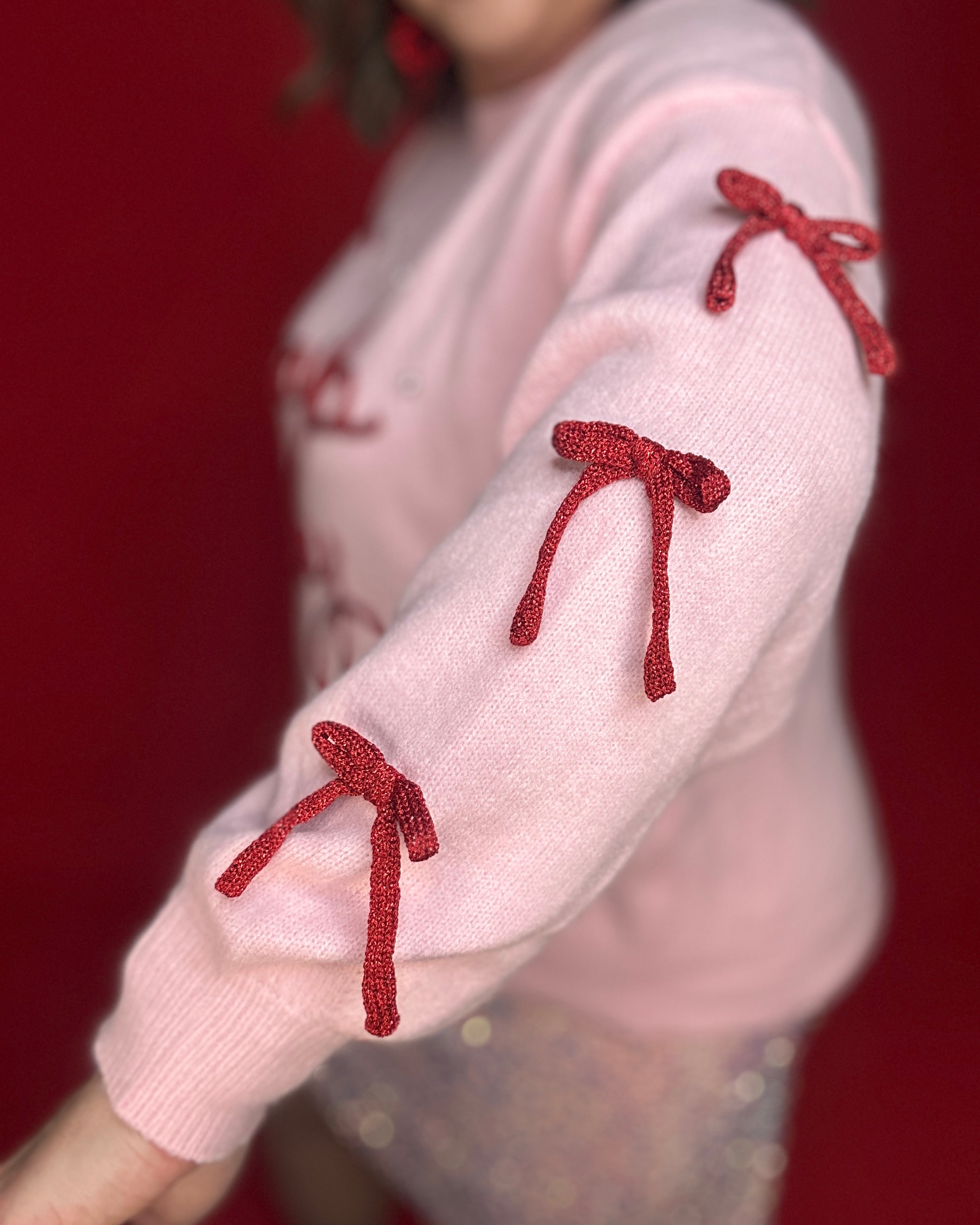 Cozy up in this playful round neck knit sweater, featuring rhinestone detail, a shimmery, embroidered cord lettering and adorable bow appliqués along the sleeves. Its medium-weight, non-sheer knit keeps you comfy and stylish, perfect for adding a fun twist to your everyday look. Unlined for easy layering and all-day wear!