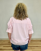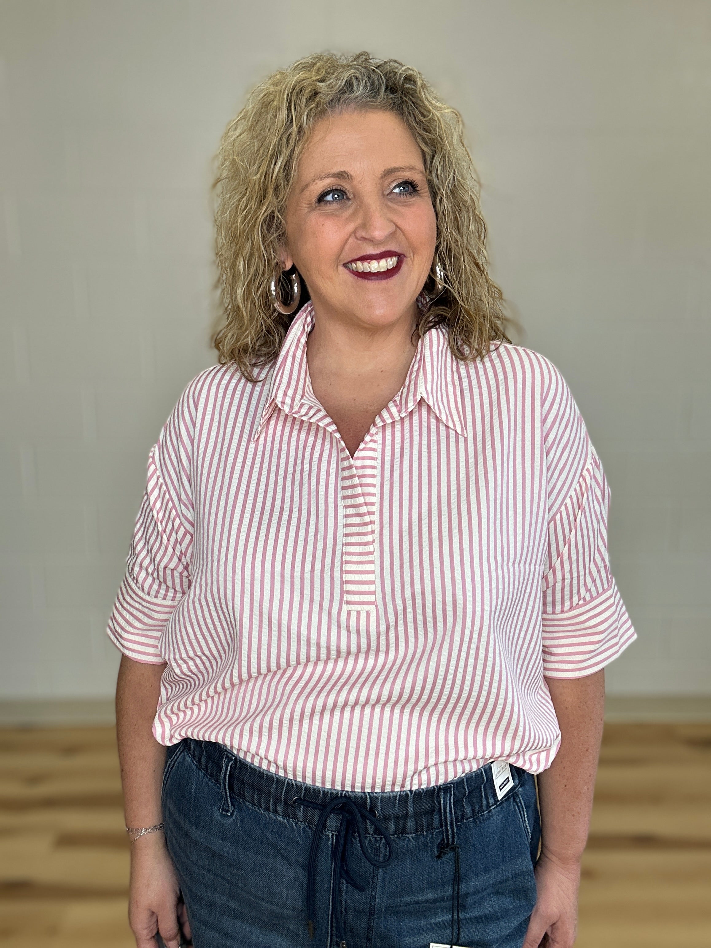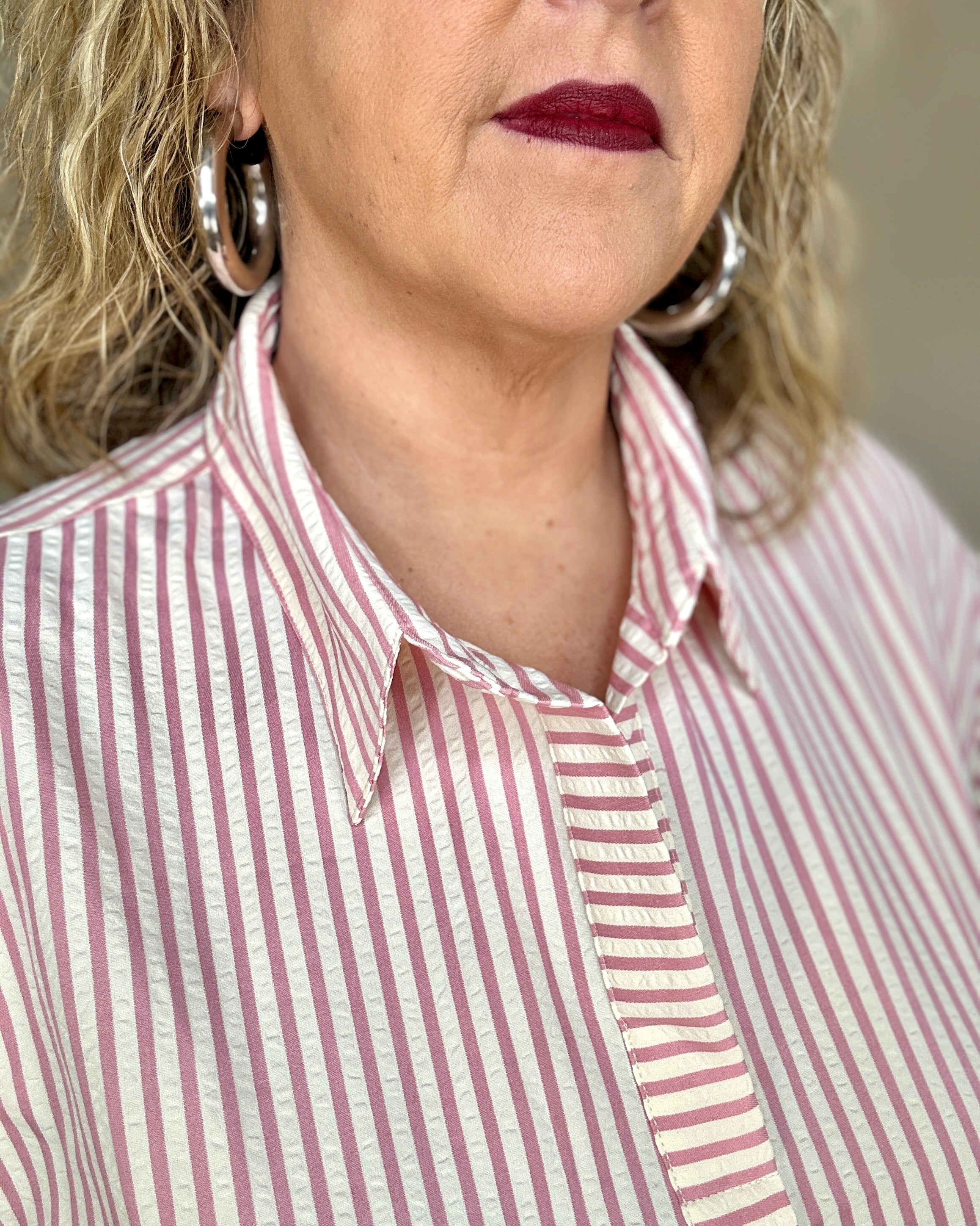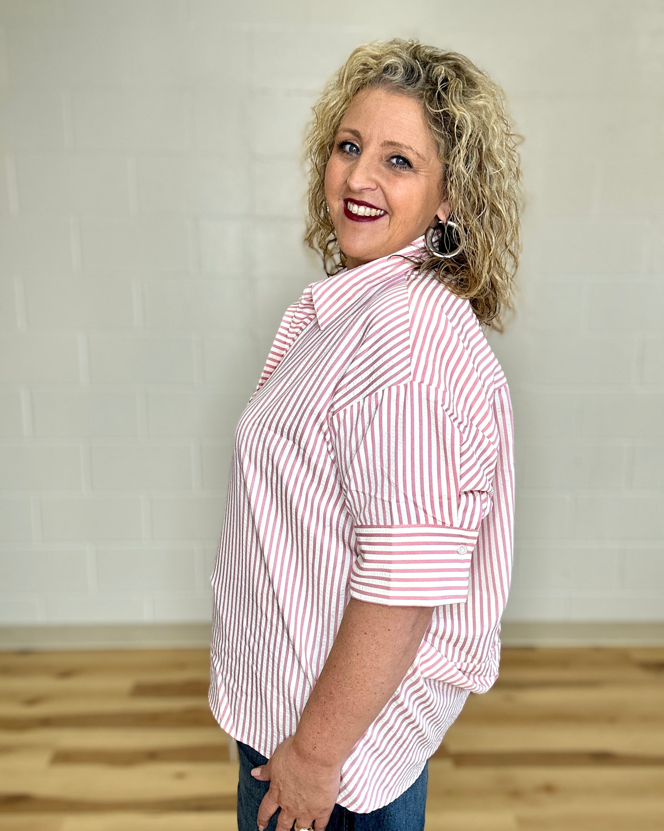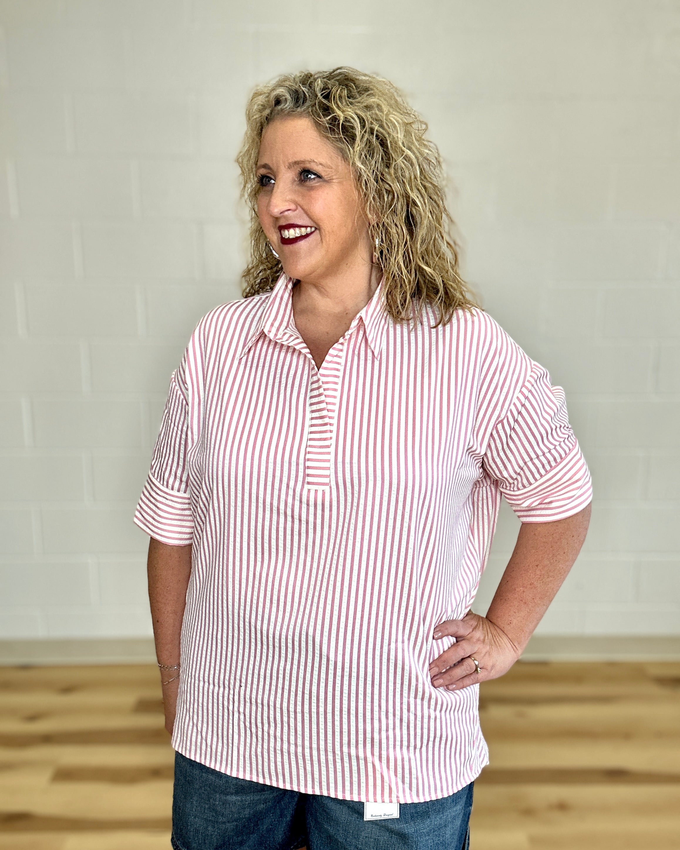 Throw on this oversized striped top and own the room. Crisp collar, singe button on the sleeves, and a relaxed fit that says you're confident enough to break the rules. The classic stripes hit different when you're wearing them with attitude. Perfect for layering over basics or standing solo as your statement piece. Short sleeves keep it breezy while the structured details keep it sharp. Effortless style that refuses to blend in.