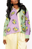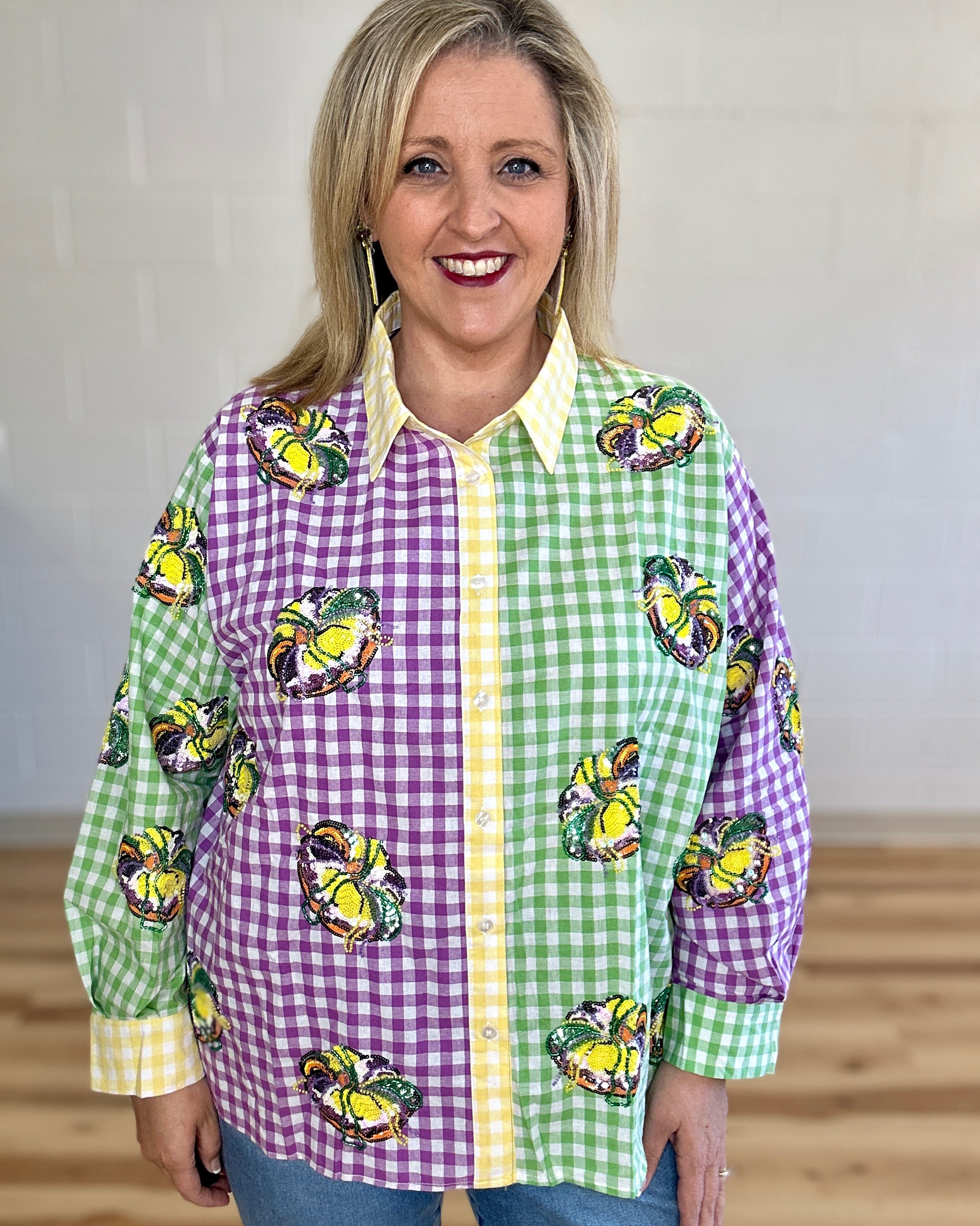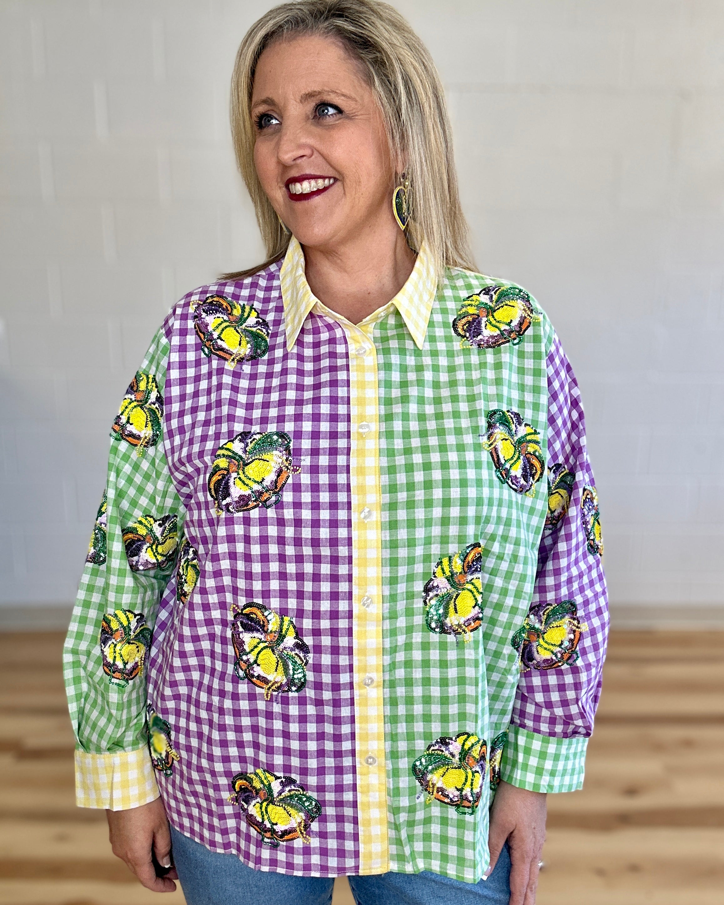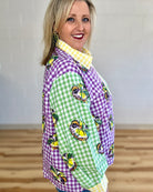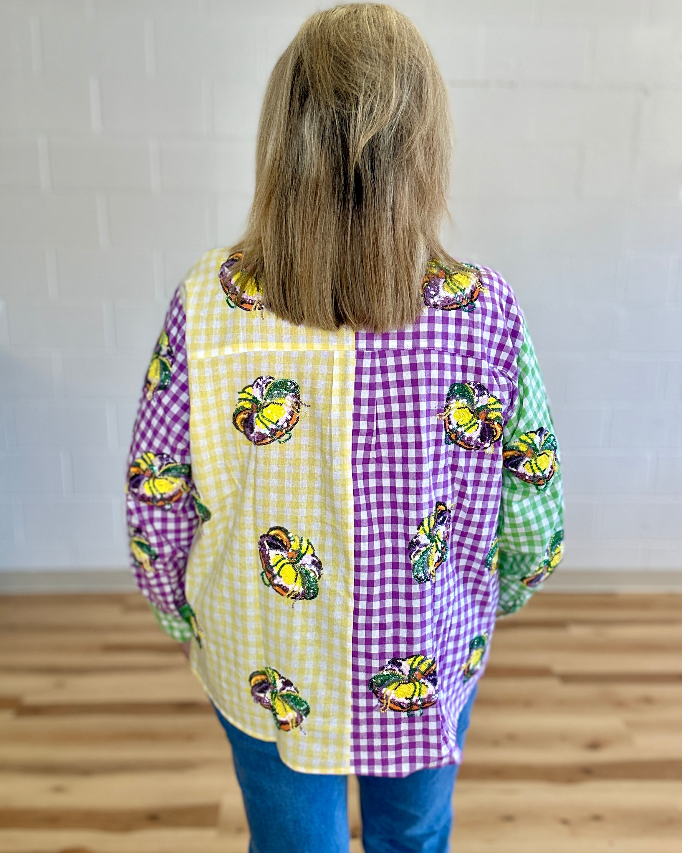 Celebrate Mardi Gras in style with this vibrant colorblock gingham top featuring a show-stopping sequin king cake design! The playful button-up silhouette brings festive flair to your wardrobe, perfect for parties and celebrations. Mix and match with our coordinating shorts to create an unforgettable coordinated look that'll have you turning heads. Whether you're hitting the parade route or dancing the night away, this top delivers sparkle and personality in every stitch. Get ready to shine!