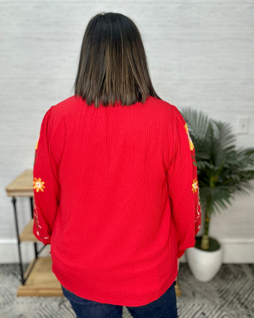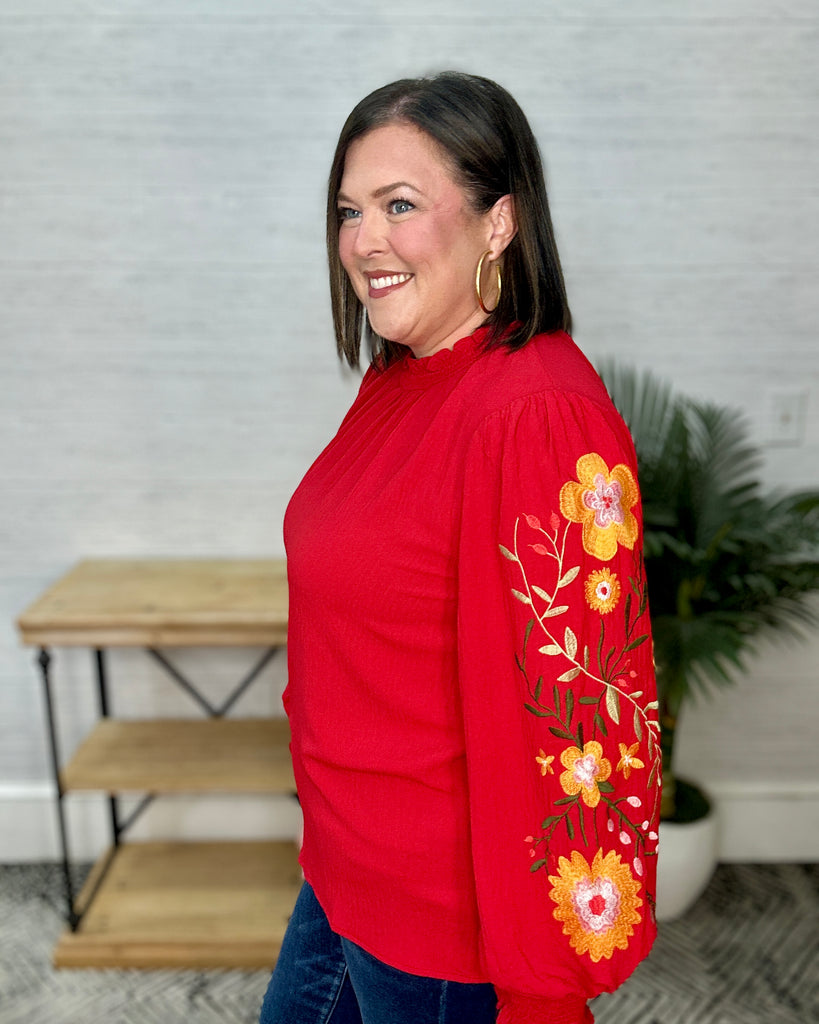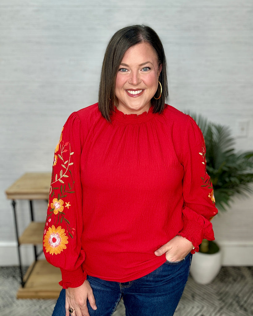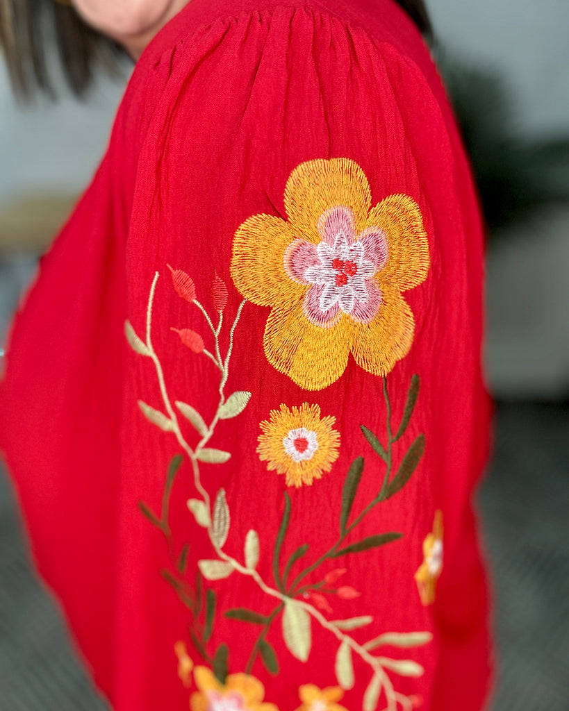 This elegant long sleeve blouse from Oddi showcases textured airflow fabric paired with delicate floral embroidery on the sleeves. Its smocked neckline and cuffs add refined detail, creating a sophisticated look perfect for dressing up or layering with ease.