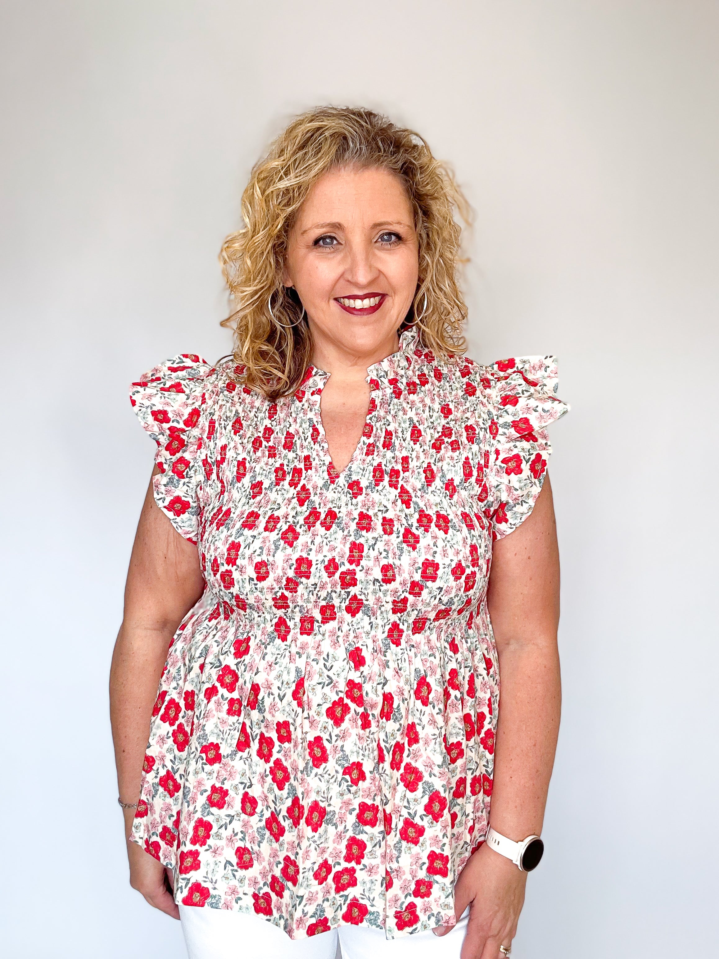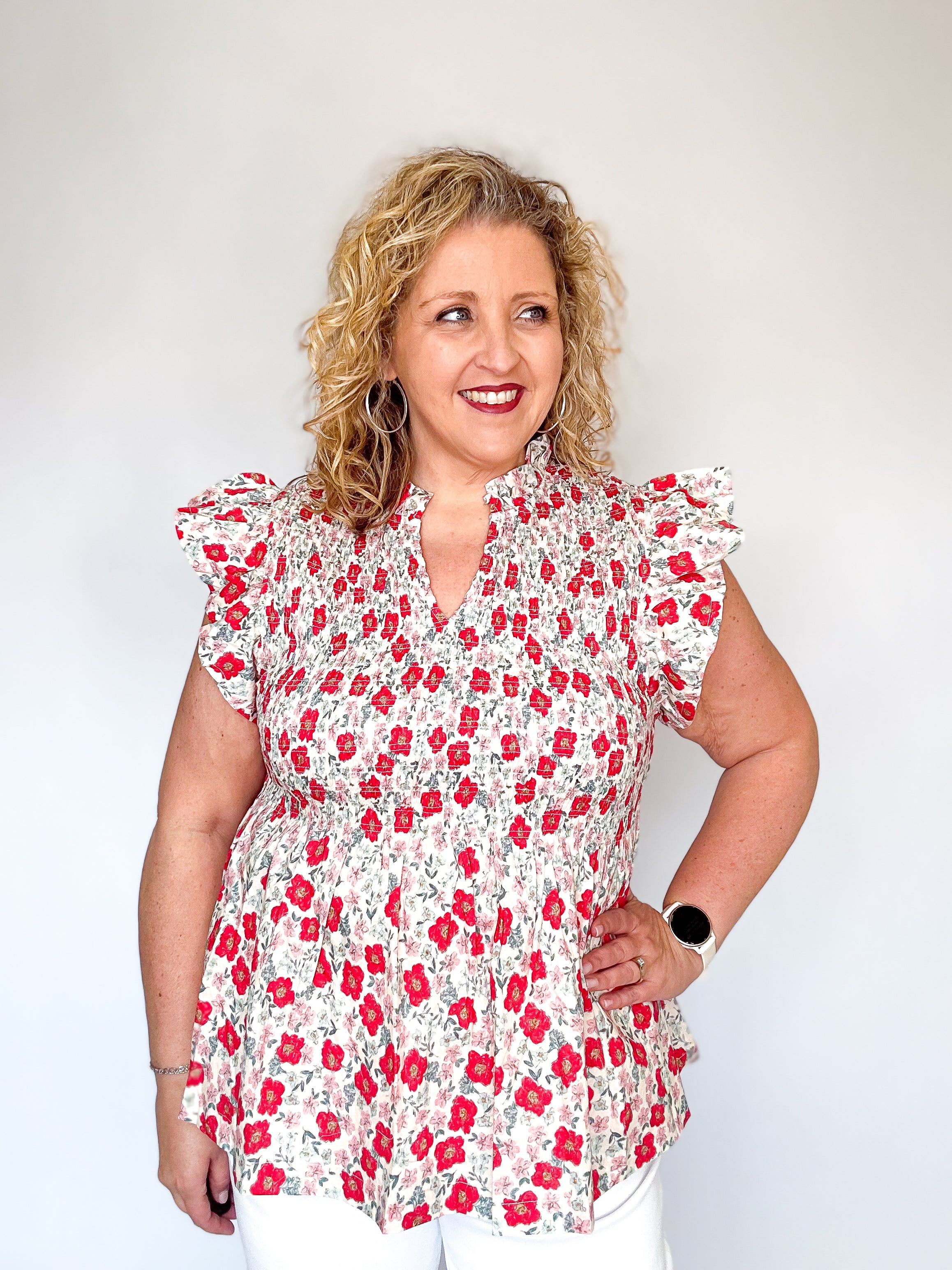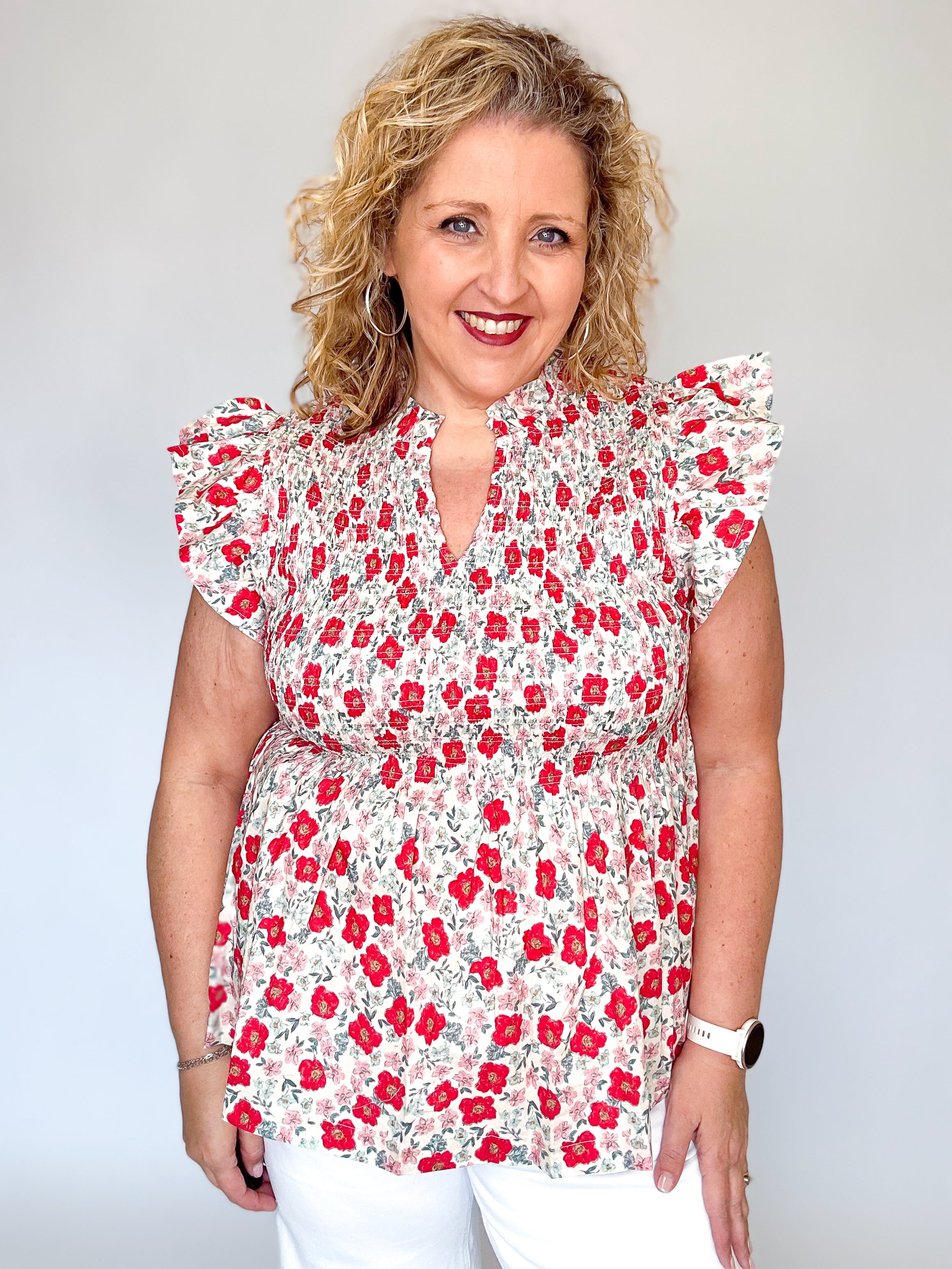 Twirl into spring with this charming floral woven top. Flutter sleeves add movement and whimsy, while the smocked bodice creates a flattering, defined silhouette. A ruffled neckline brings extra personality to the piece. Crafted from lightweight, non-sheer woven fabric and left unlined for breathable comfort, it's perfect for layering or wearing solo on warmer days. A versatile staple that feels effortlessly put-together.