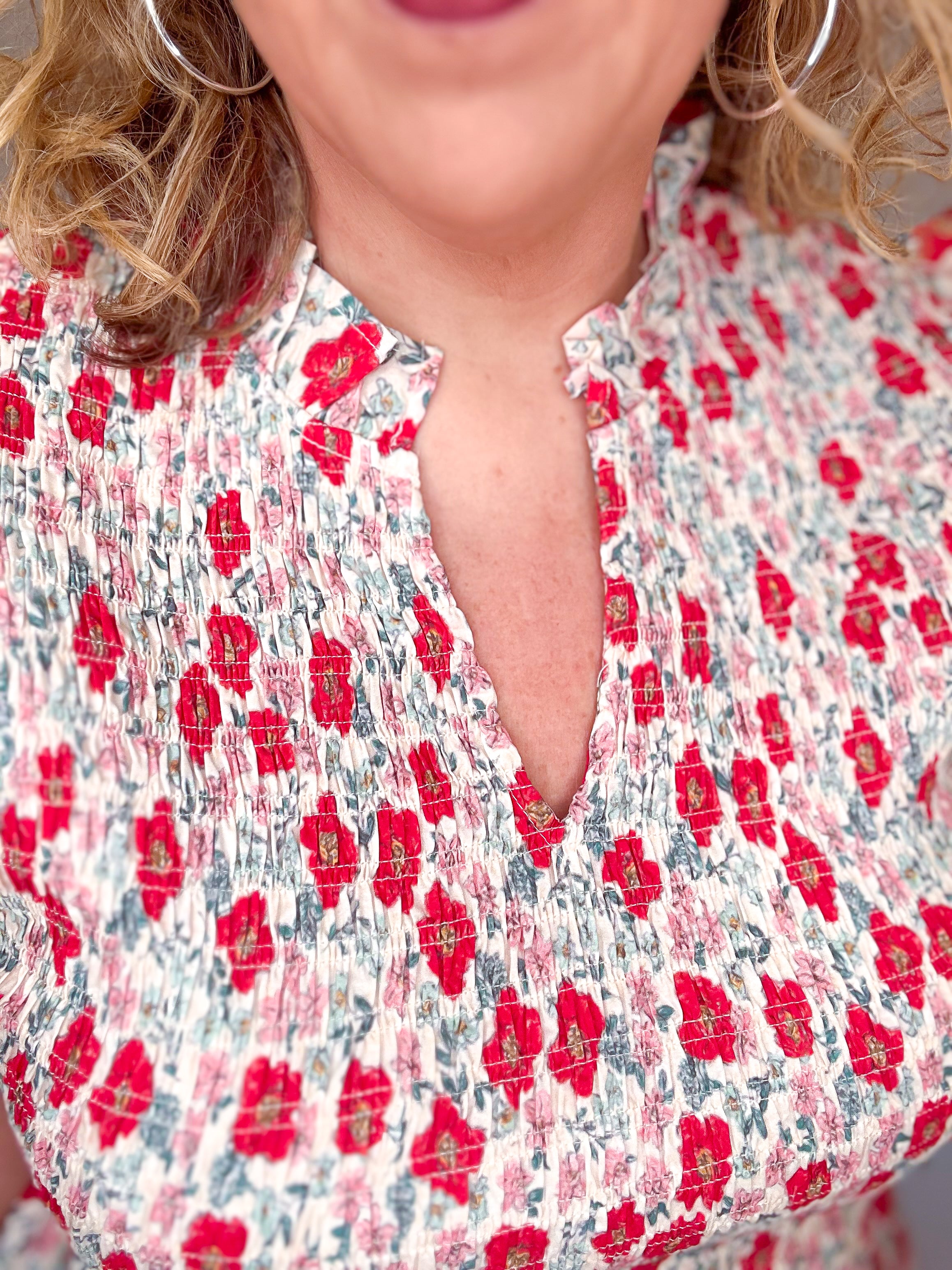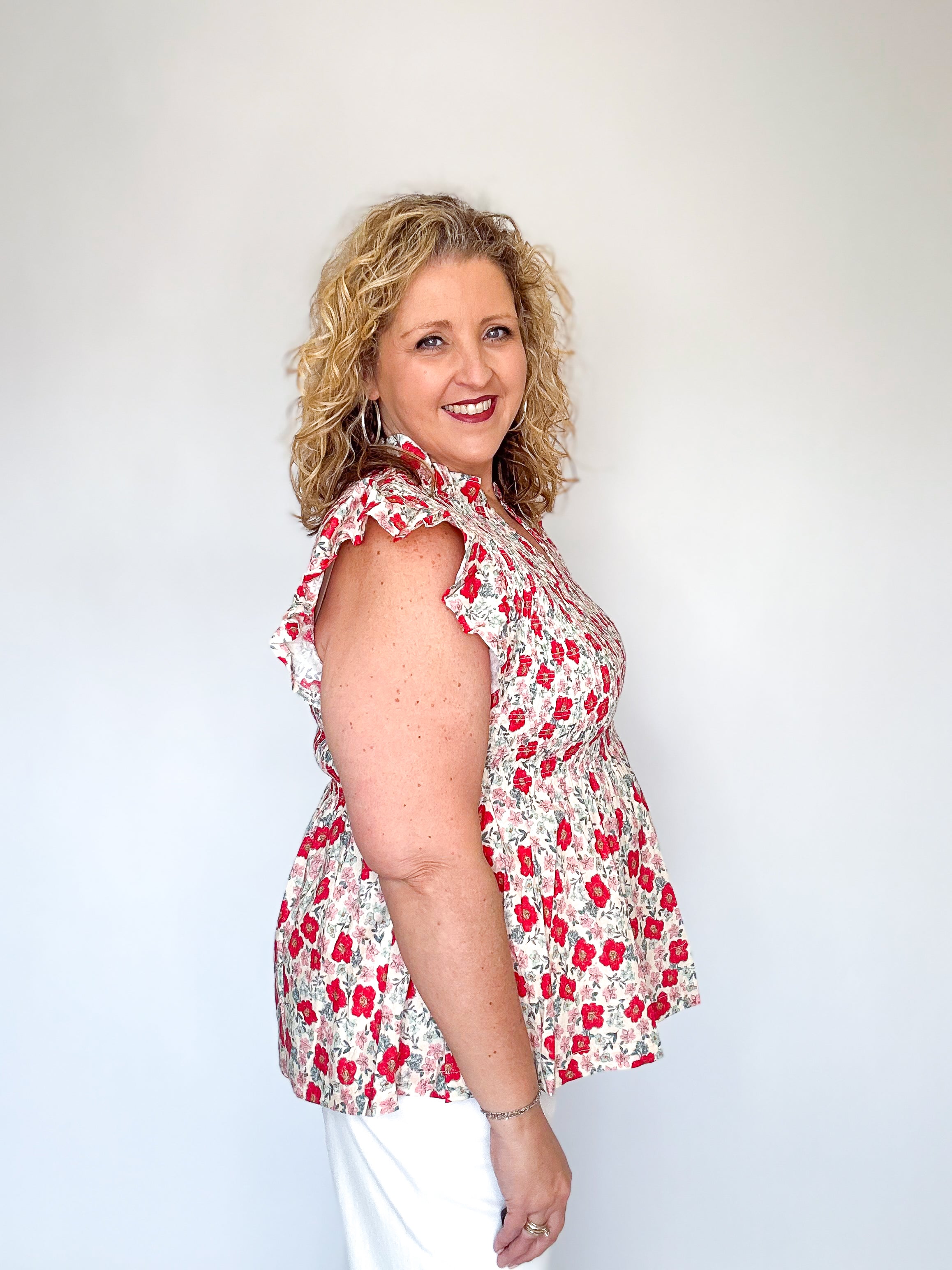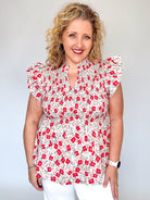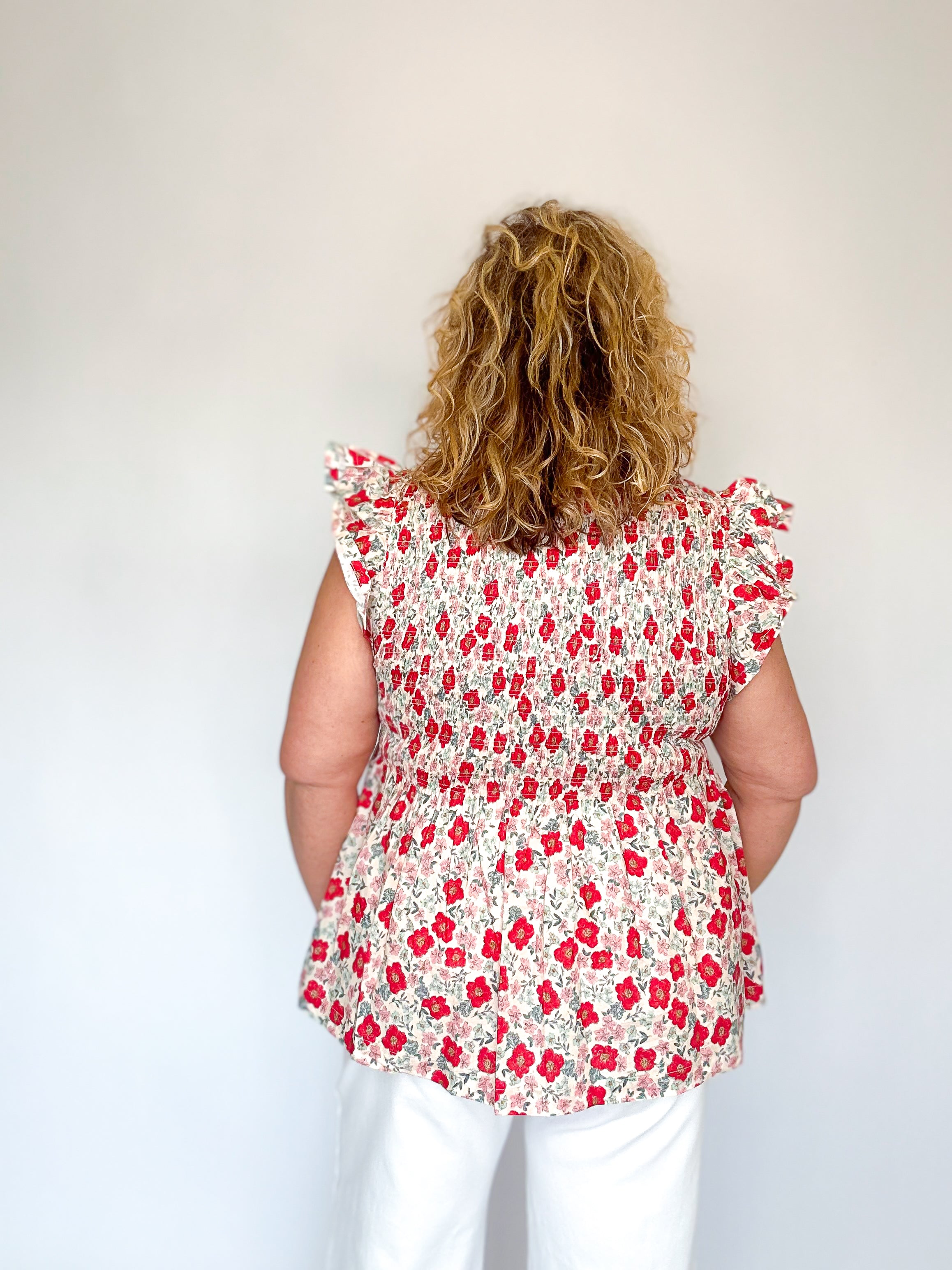Twirl into spring with this charming floral woven top. Flutter sleeves add movement and whimsy, while the smocked bodice creates a flattering, defined silhouette. A ruffled neckline brings extra personality to the piece. Crafted from lightweight, non-sheer woven fabric and left unlined for breathable comfort, it's perfect for layering or wearing solo on warmer days. A versatile staple that feels effortlessly put-together.