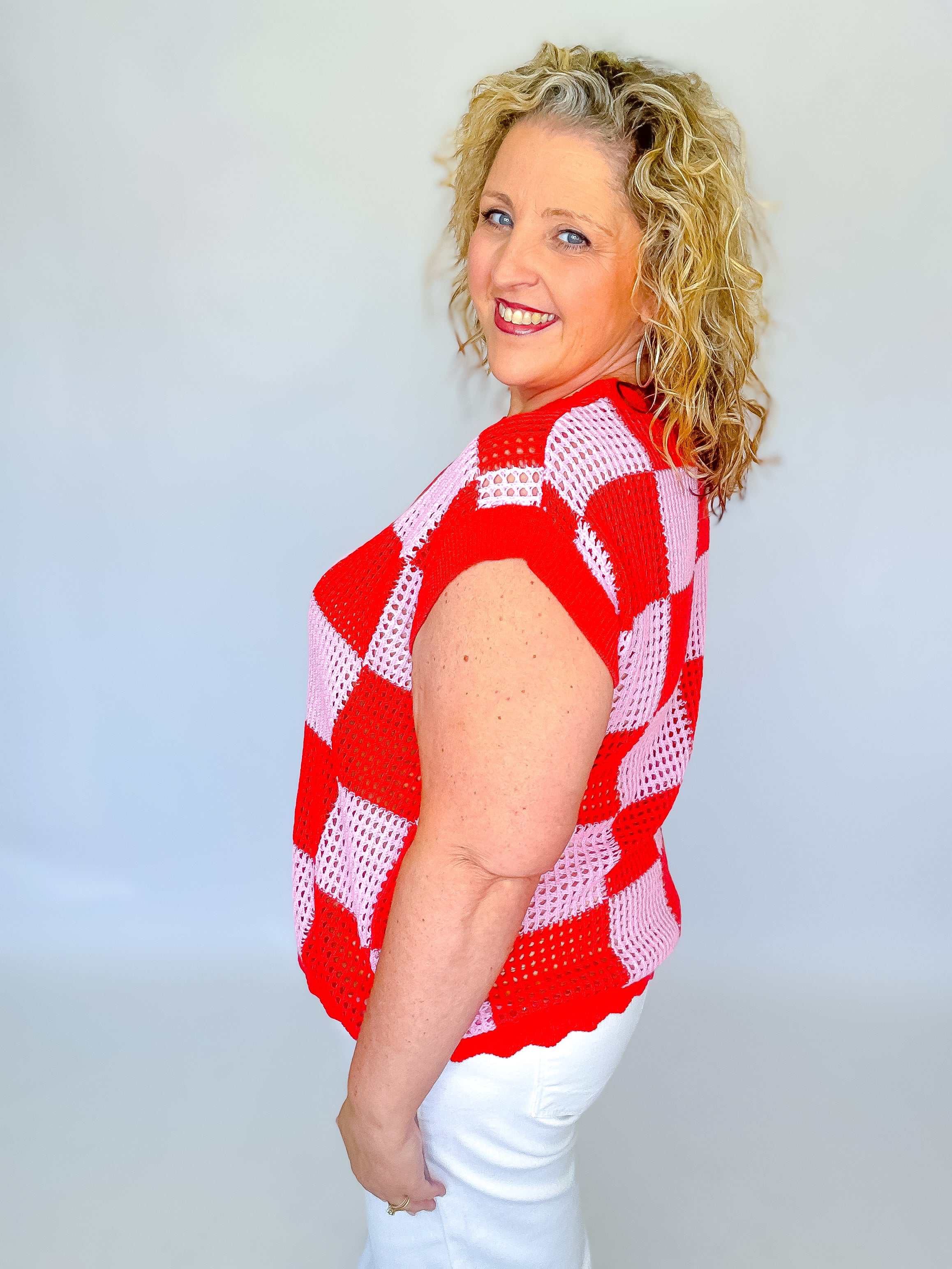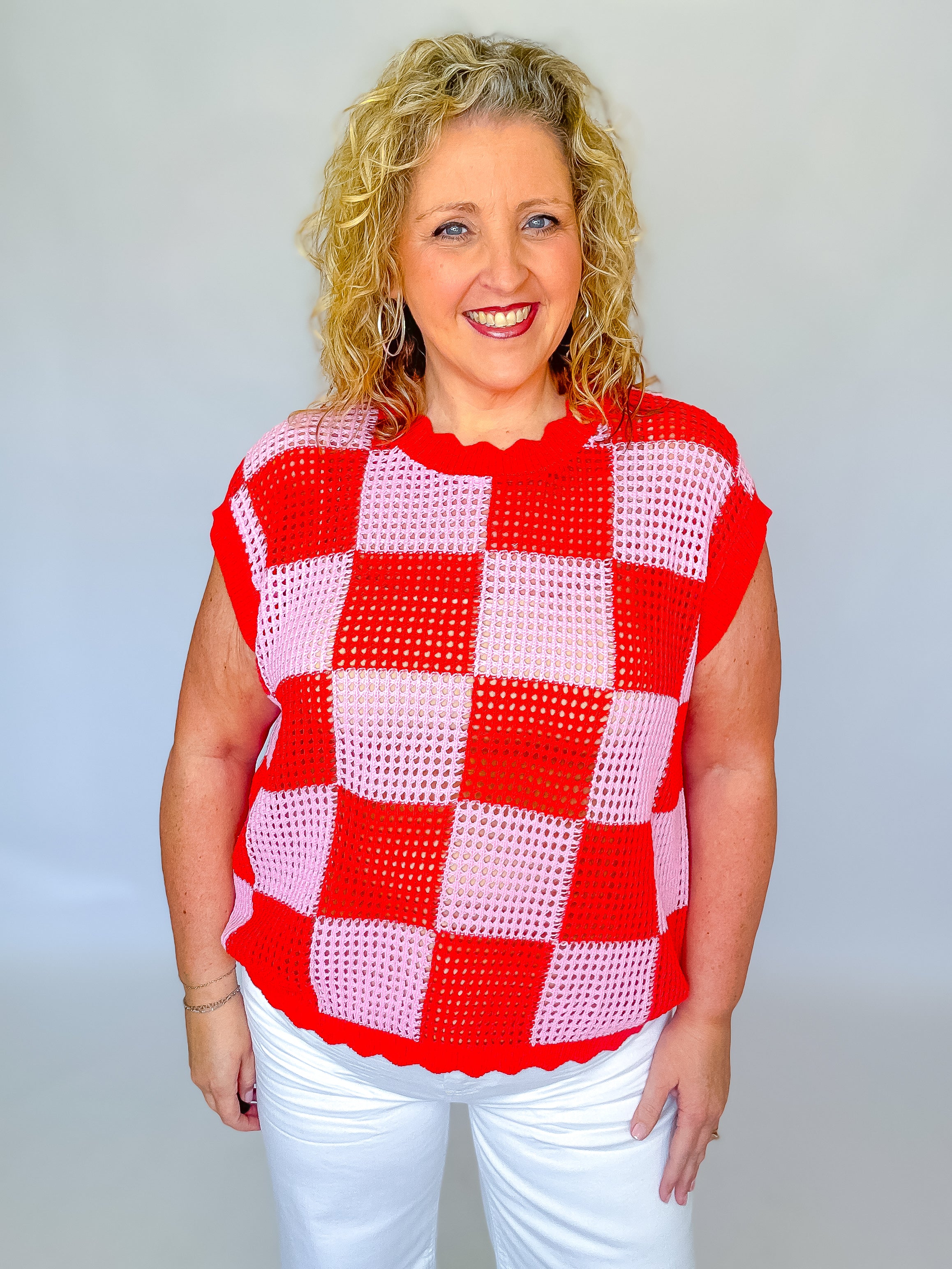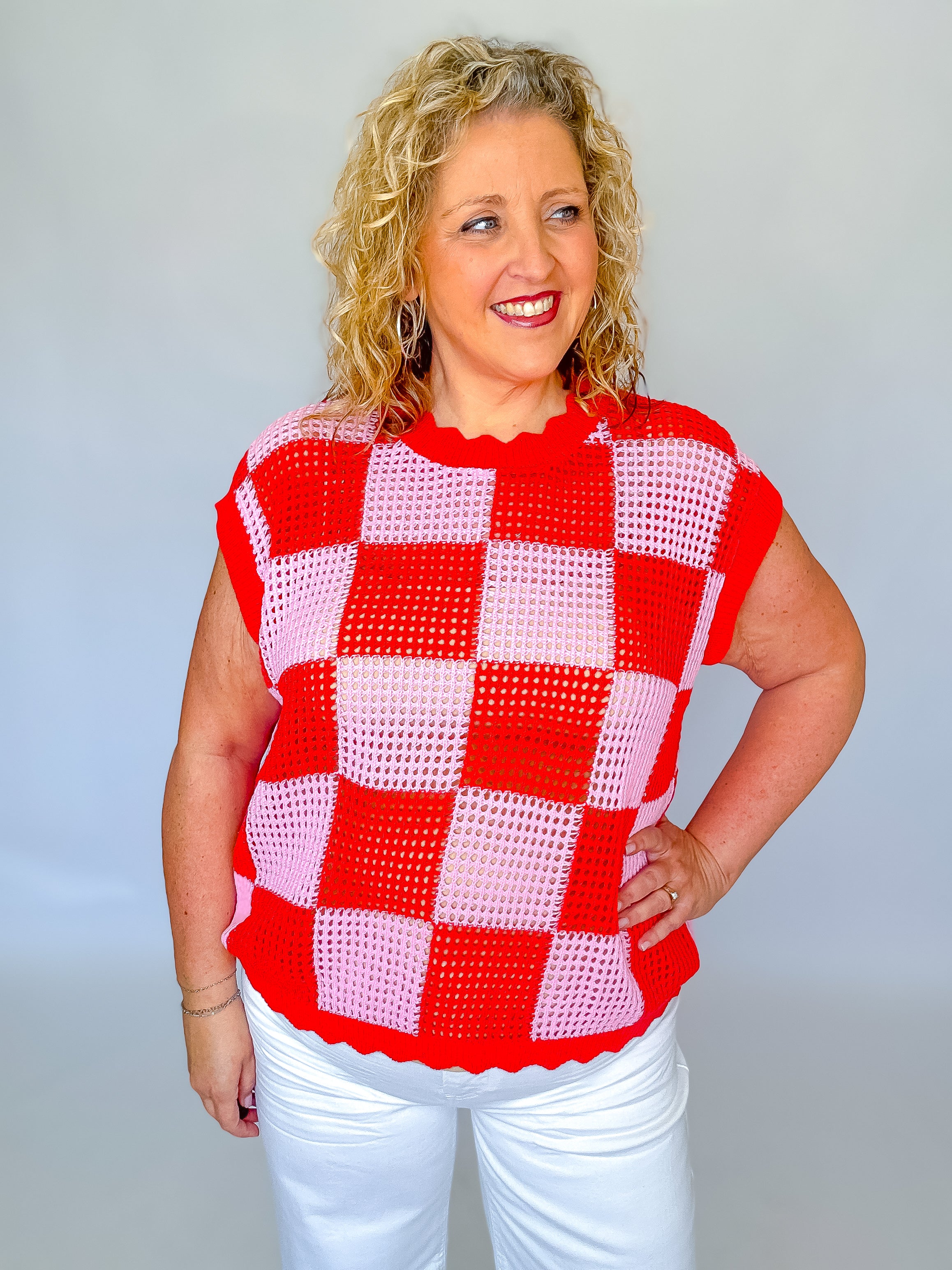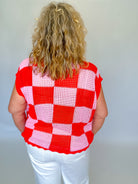 Add a pop of texture and color to your wardrobe with this checker-pattern knit top. Designed in a breathable open-weave knit, it features a bold red and pink color block check for a playful yet polished look. The relaxed, boxy silhouette and ribbed crew neckline keep it comfy and modern—perfect for layering or wearing solo. Style it with denim, wide-leg pants, or a flowy skirt for an easy, fashion-forward outfit that feels as good as it looks.