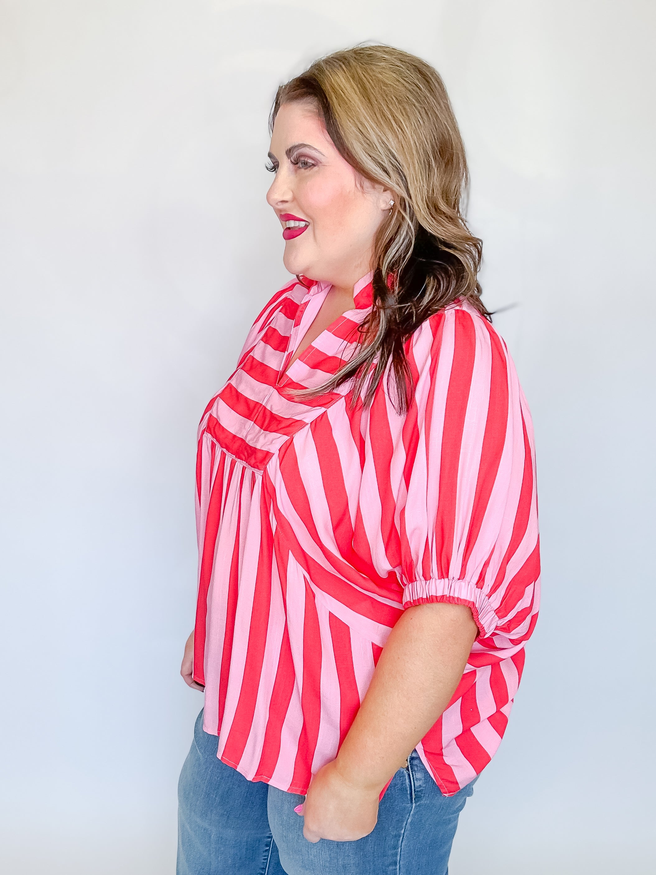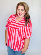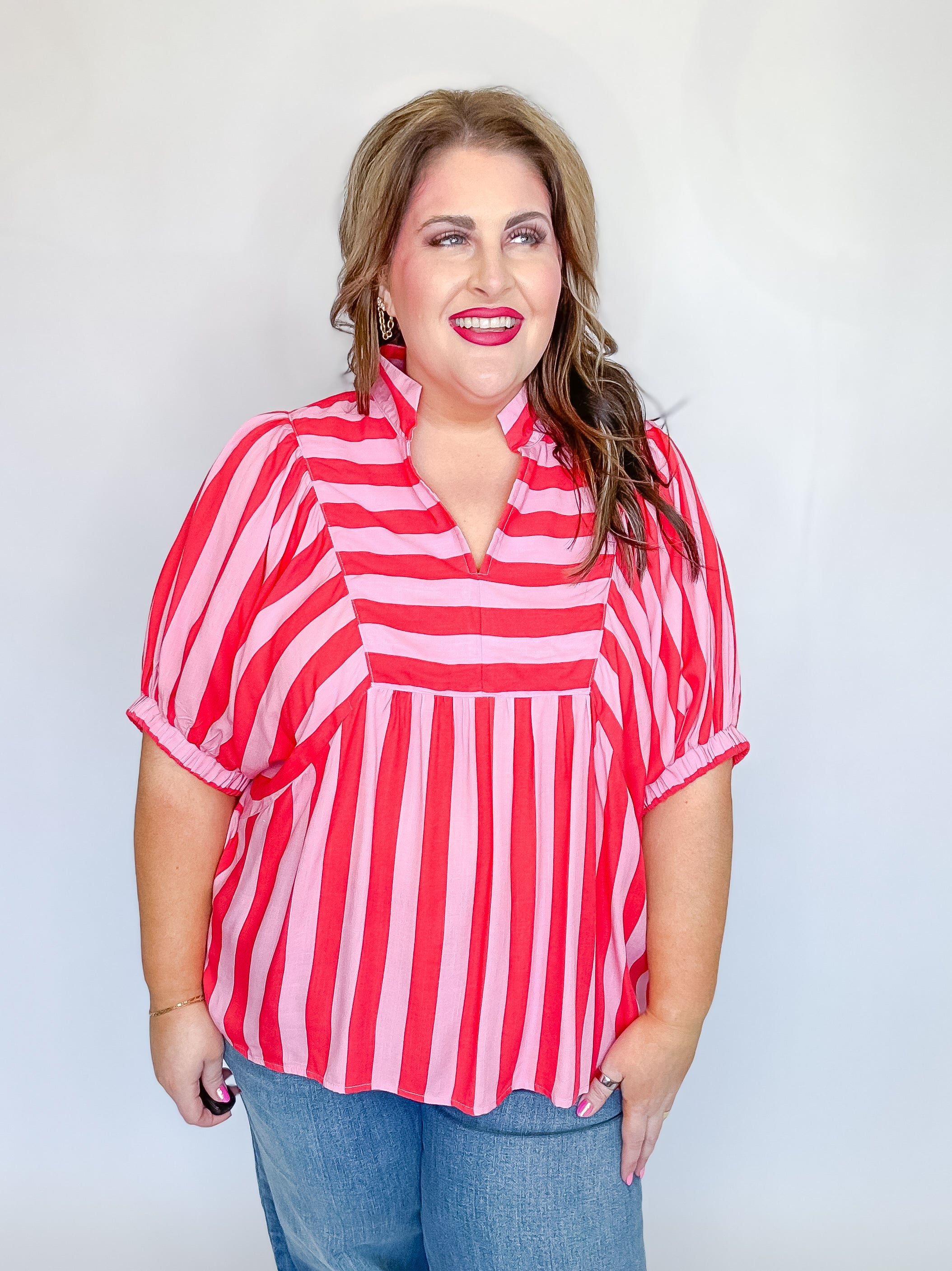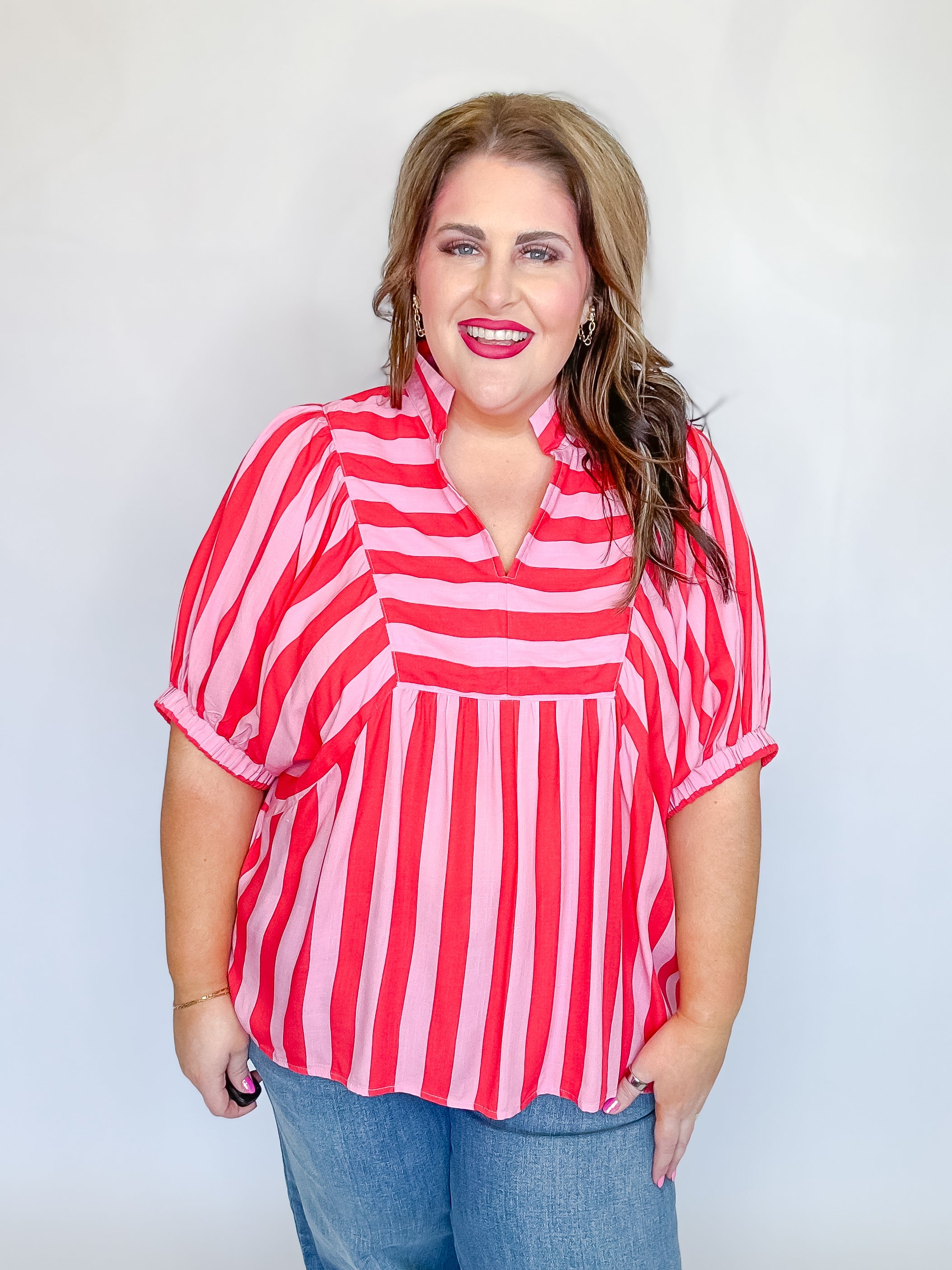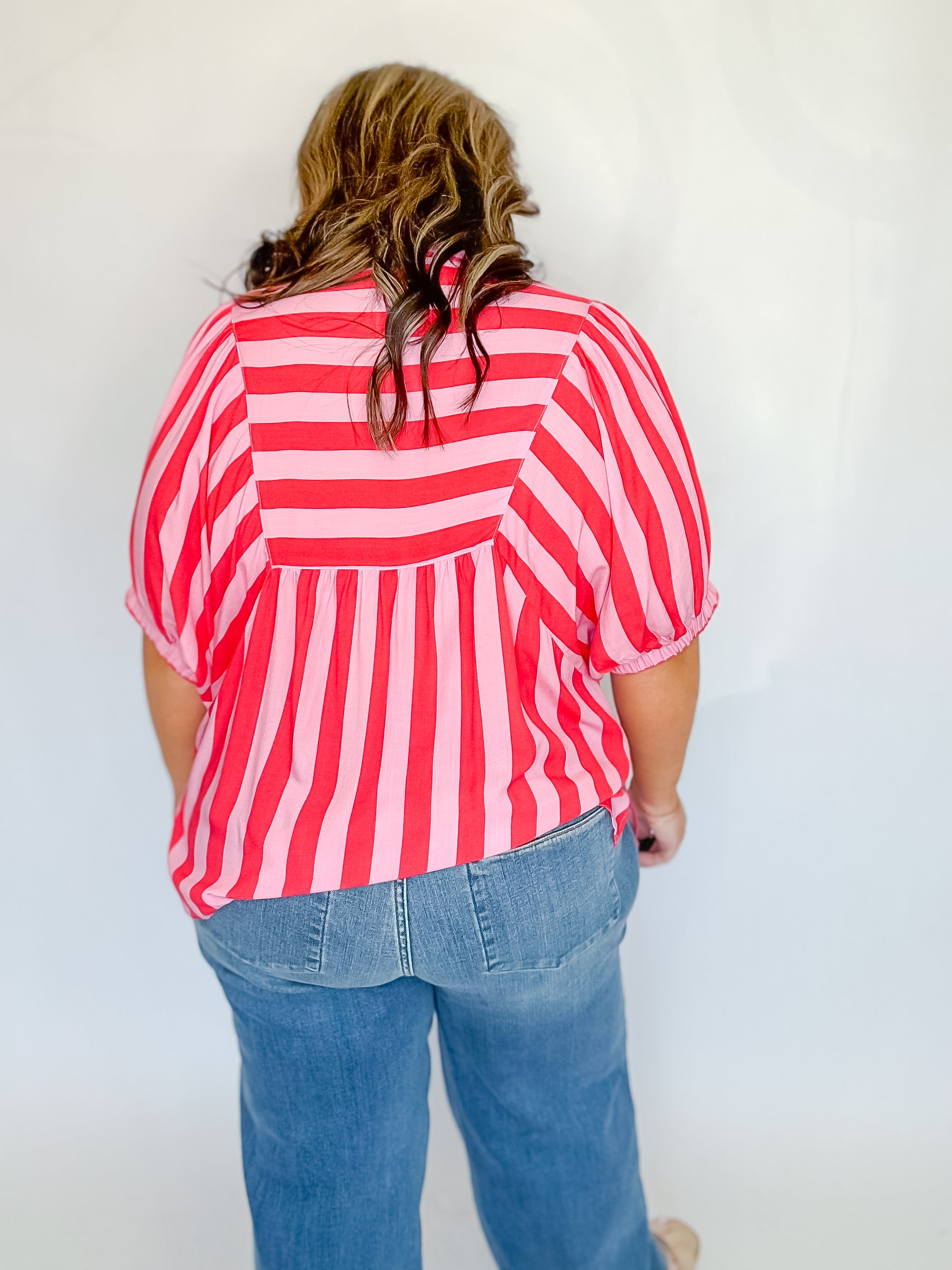 Stripes never go out of style—and this playful puff sleeve top proves it! Rock the retro vibes with a bold striped print that commands attention. The mock collar V-neck adds a touch of sophistication, while short puff sleeves bring fun and flirtation to your everyday look. Elasticated cuffs keep things snug and comfortable, and the lightweight woven fabric (completely unlined and non-sheer) makes it perfect for layering or wearing solo. Whether you're dressing up for brunch or keeping it casual, this top is your new go-to piece for effortless style with personality.
