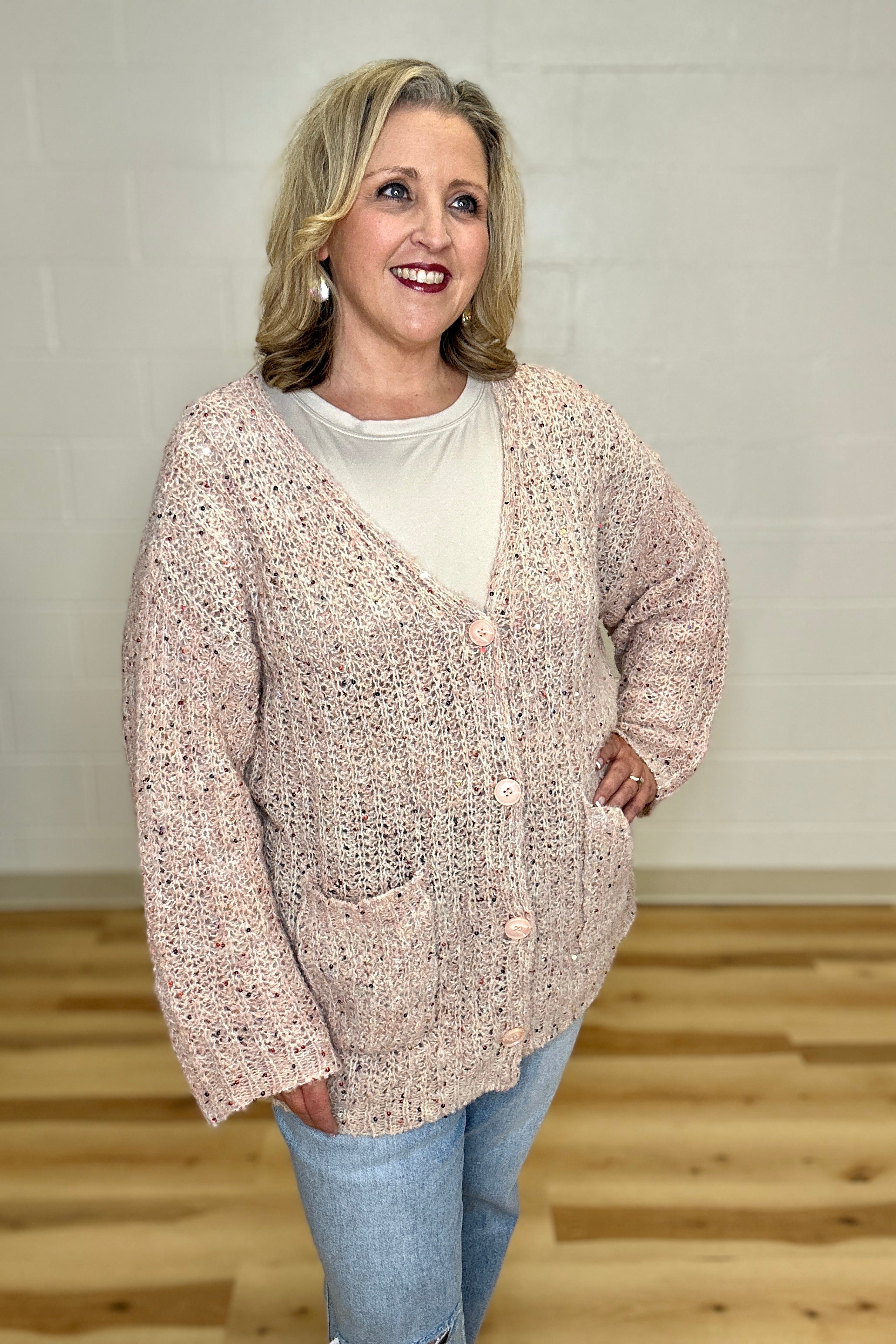 Shimmer meets comfort in this knit cardigan that's basically a hug with sequins. The subtle sparkle catches the light just right—no need to choose between cozy and glam. With its relaxed fit, button-front closure, front pockets and long sleeves, it layers beautifully over everything from casual tees to dresses and denim. Available in versatile shades that work year-round, this Davi&Dani piece is your go-to for adding effortless charm and a little shine to any outfit. Perfect for those transitional seasons when you want to feel both comfortable and fabulous.
