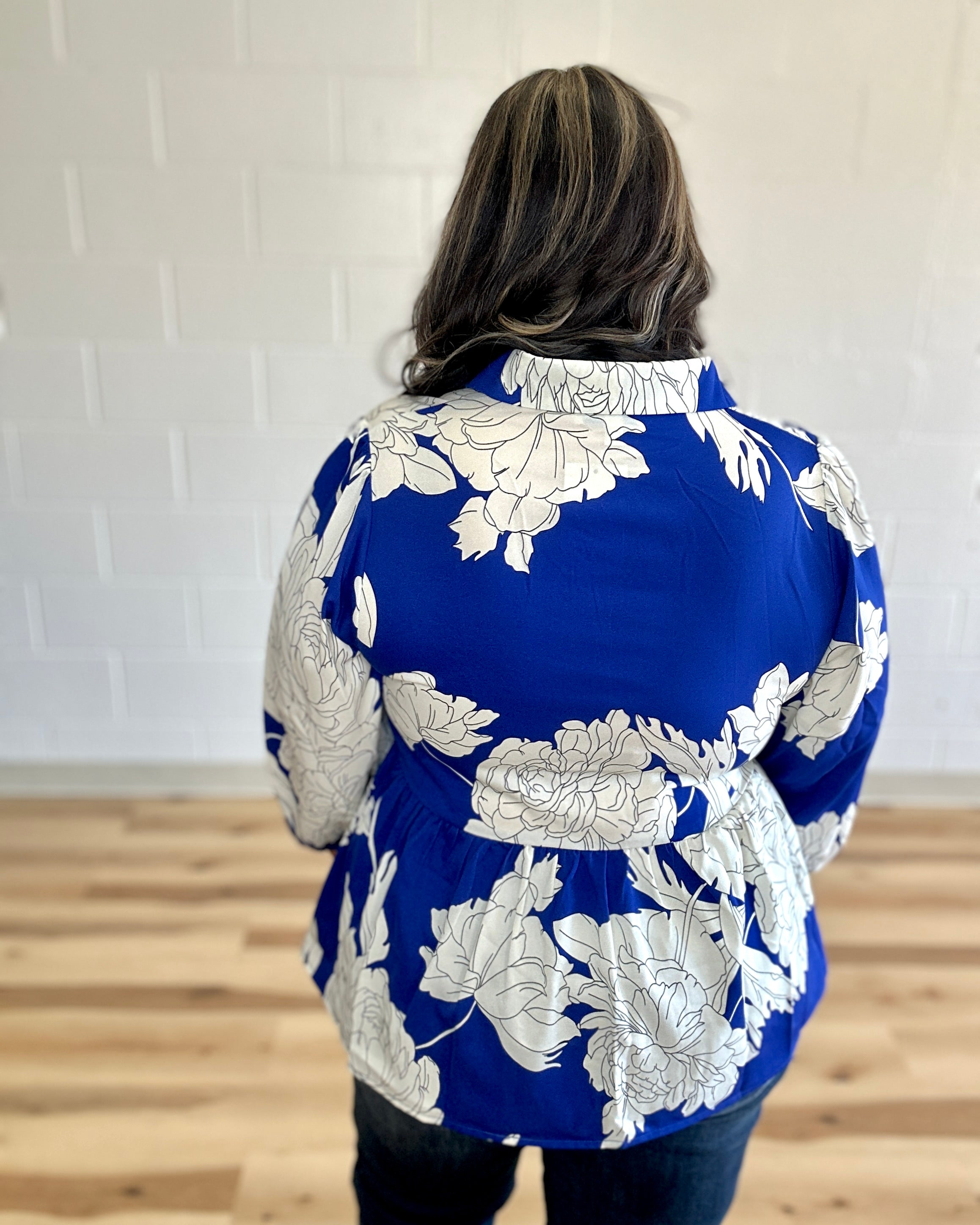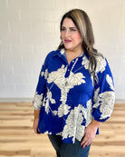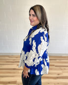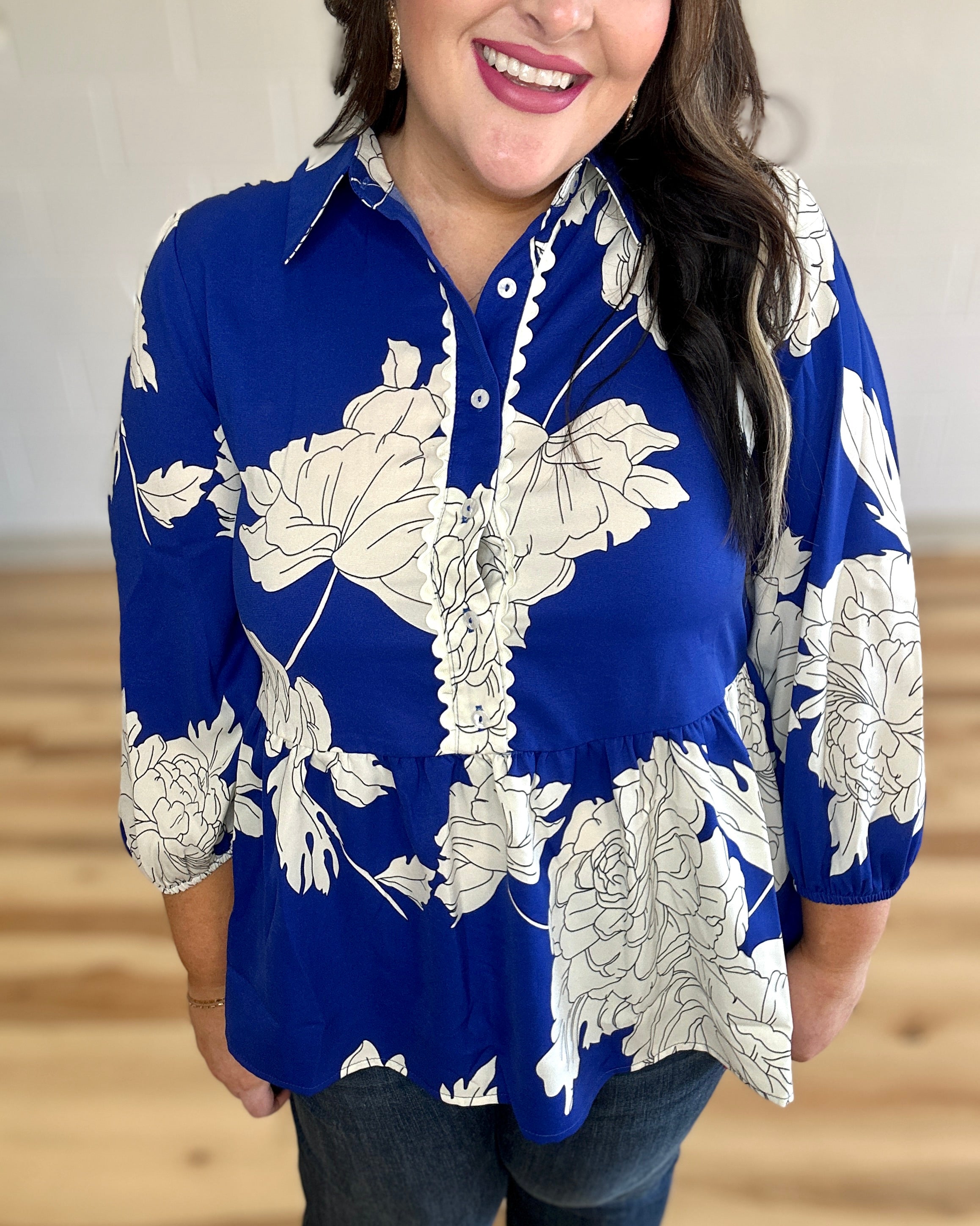 Elevate your wardrobe with this refined She+Sky button-down top, featuring a striking woven floral print in rich royal blue. The three-quarter sleeves offer versatile styling for any season, while delicate scalloped trim along the edges adds an unexpected touch of elegance. The classic collared design and button-front closure make it effortlessly polished for both professional settings and weekend gatherings. A timeless piece that transitions seamlessly from day to evening.