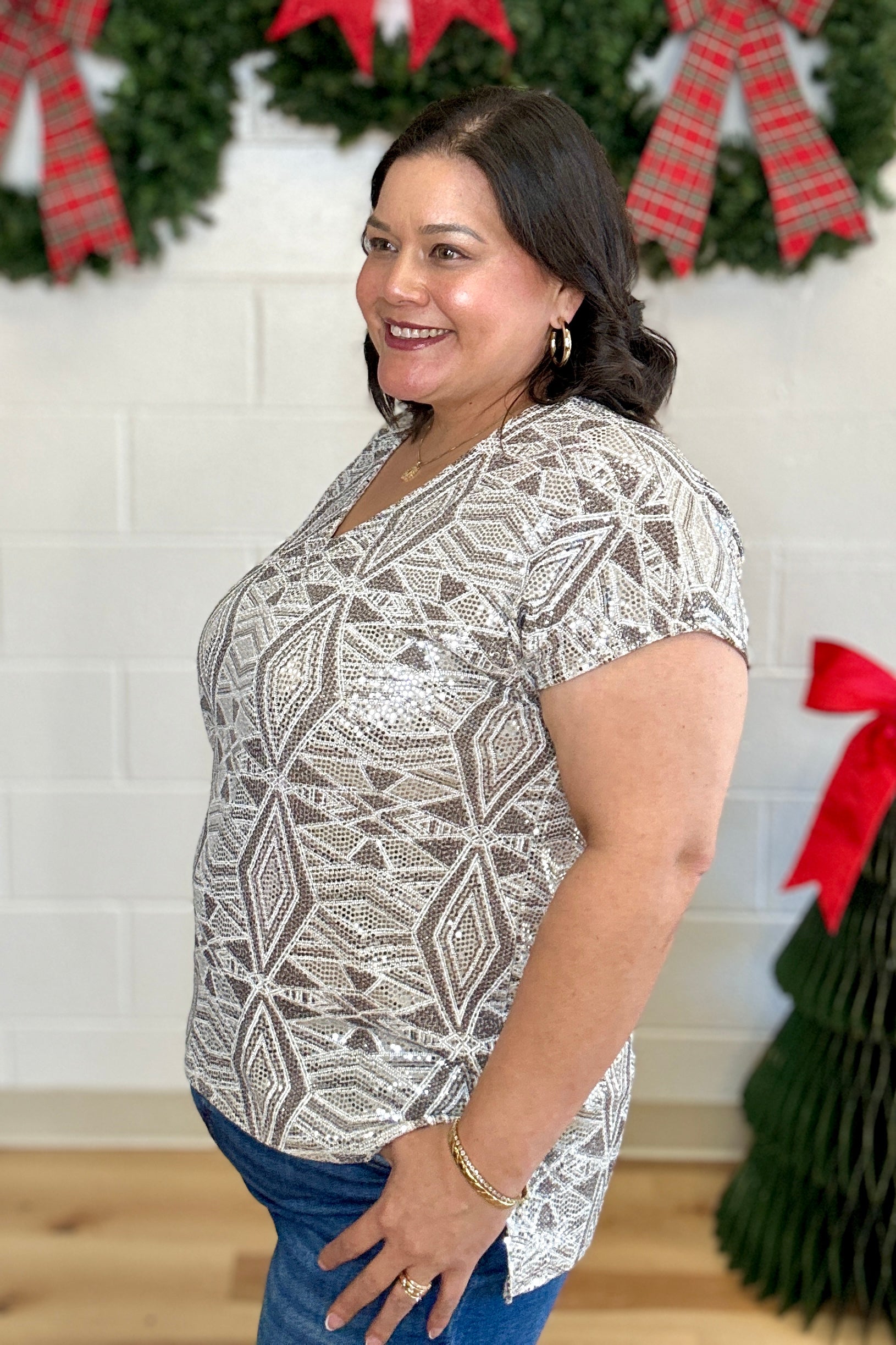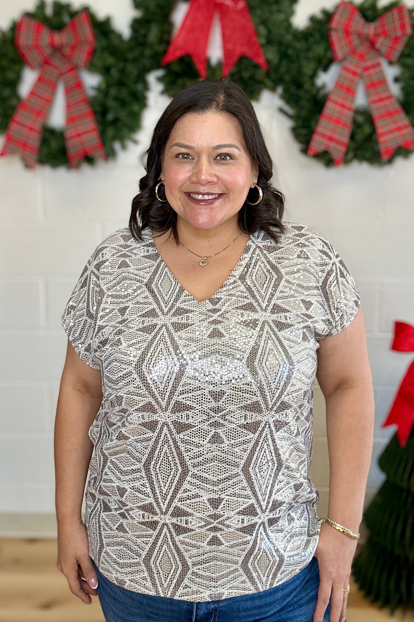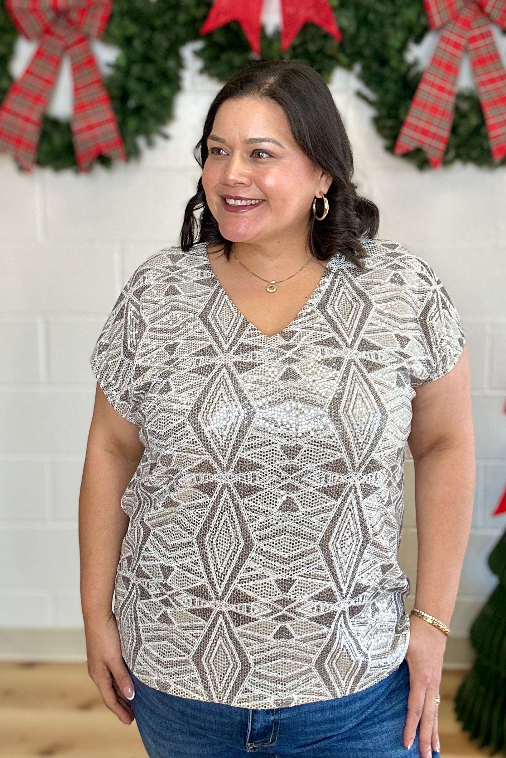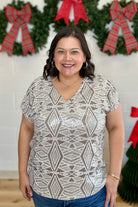 Elevate your wardrobe with this dazzling knit top from Sew In Love, featuring an allover geometric sequin pattern that shines brilliantly with every movement. The flattering V-neckline and relaxed silhouette ensure a comfortable fit that effortlessly enhances your style. Ideal for special occasions or adding a touch of glamour to your everyday look, this top promises to make you stand out with sparkling confidence.