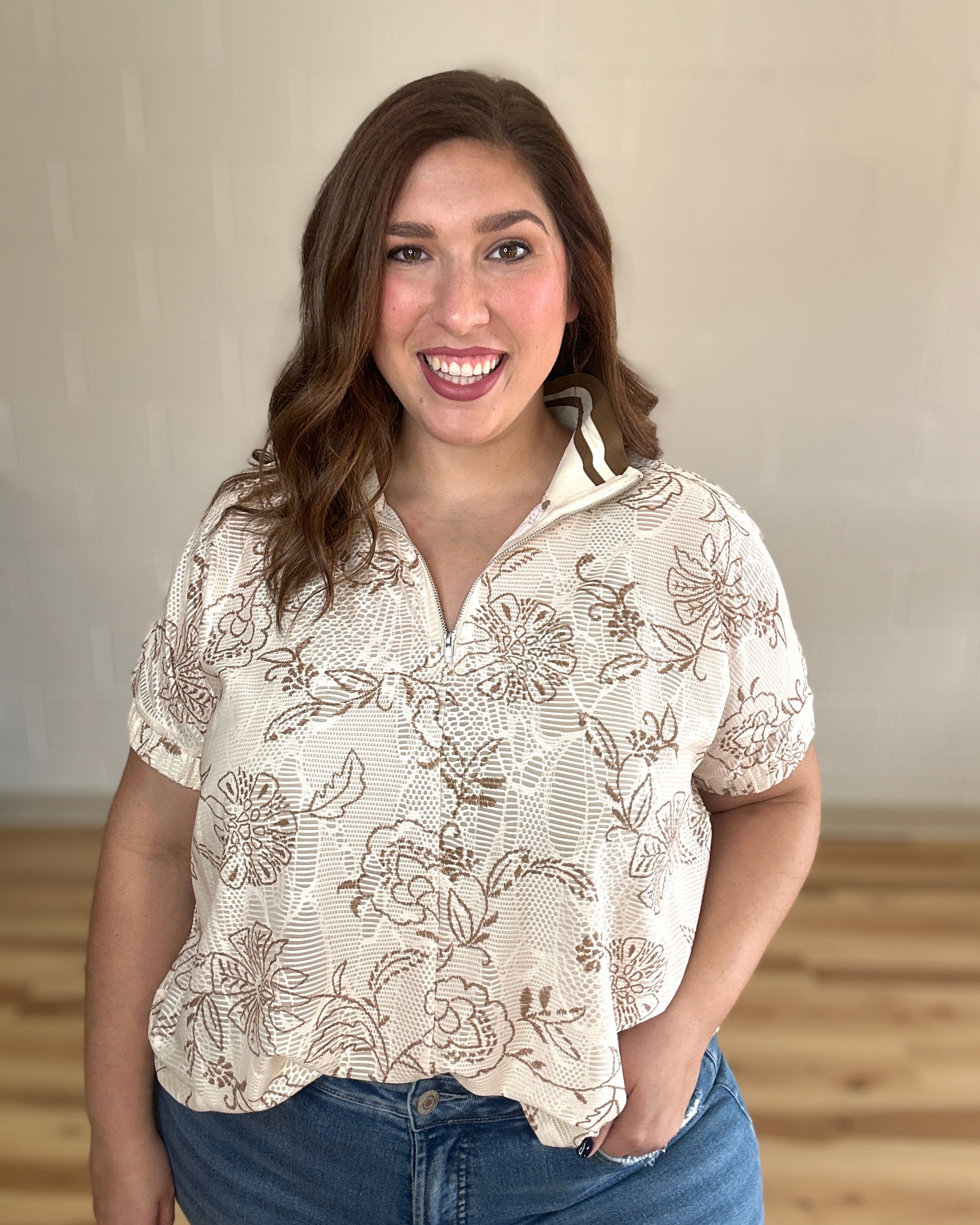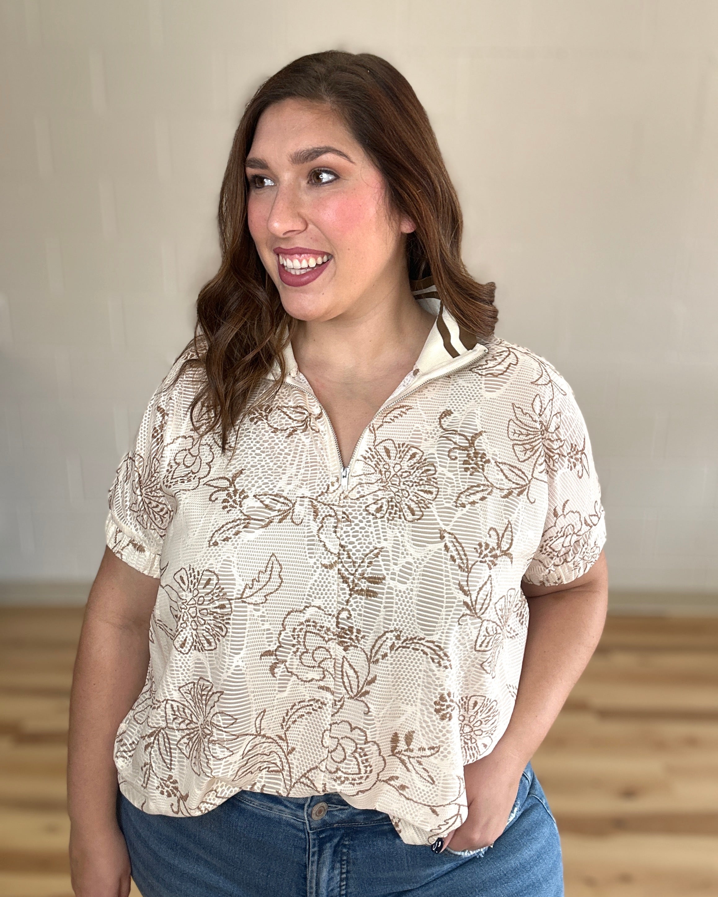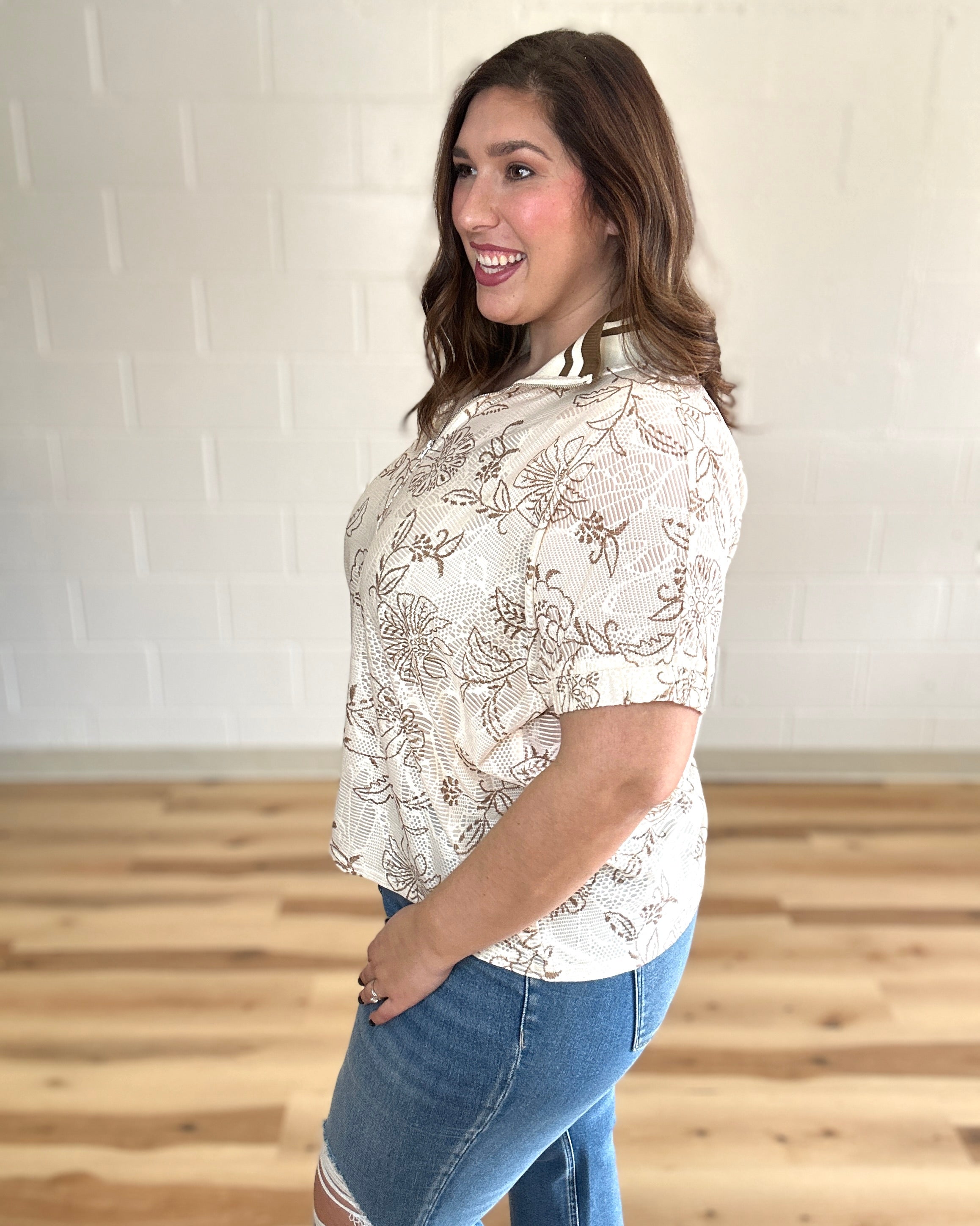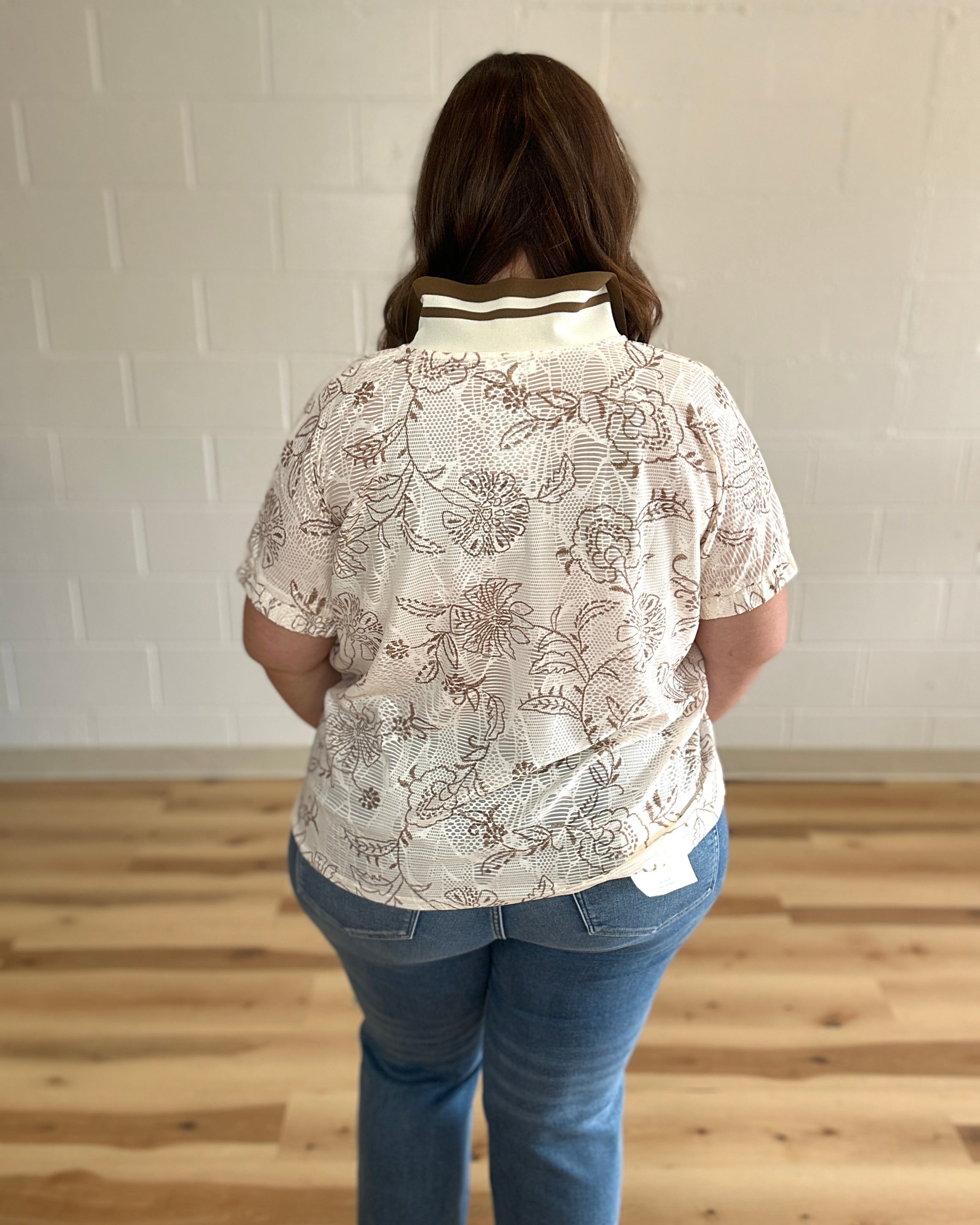 Elevate your casual wardrobe with this charming printed lace polo top. The delicate lace fabric creates an elegant, textured look perfect for layering or wearing solo, while the short sleeves keep things breathable and comfortable. A striking contrast striped collar adds visual interest and a polished touch, and the half-zip placket offers easy styling versatility—wear it fully zipped for a refined appearance or partially open for a relaxed vibe. Whether you're dressing up for brunch or keeping it effortlessly chic for everyday wear, this piece brings sophistication to any outfit.