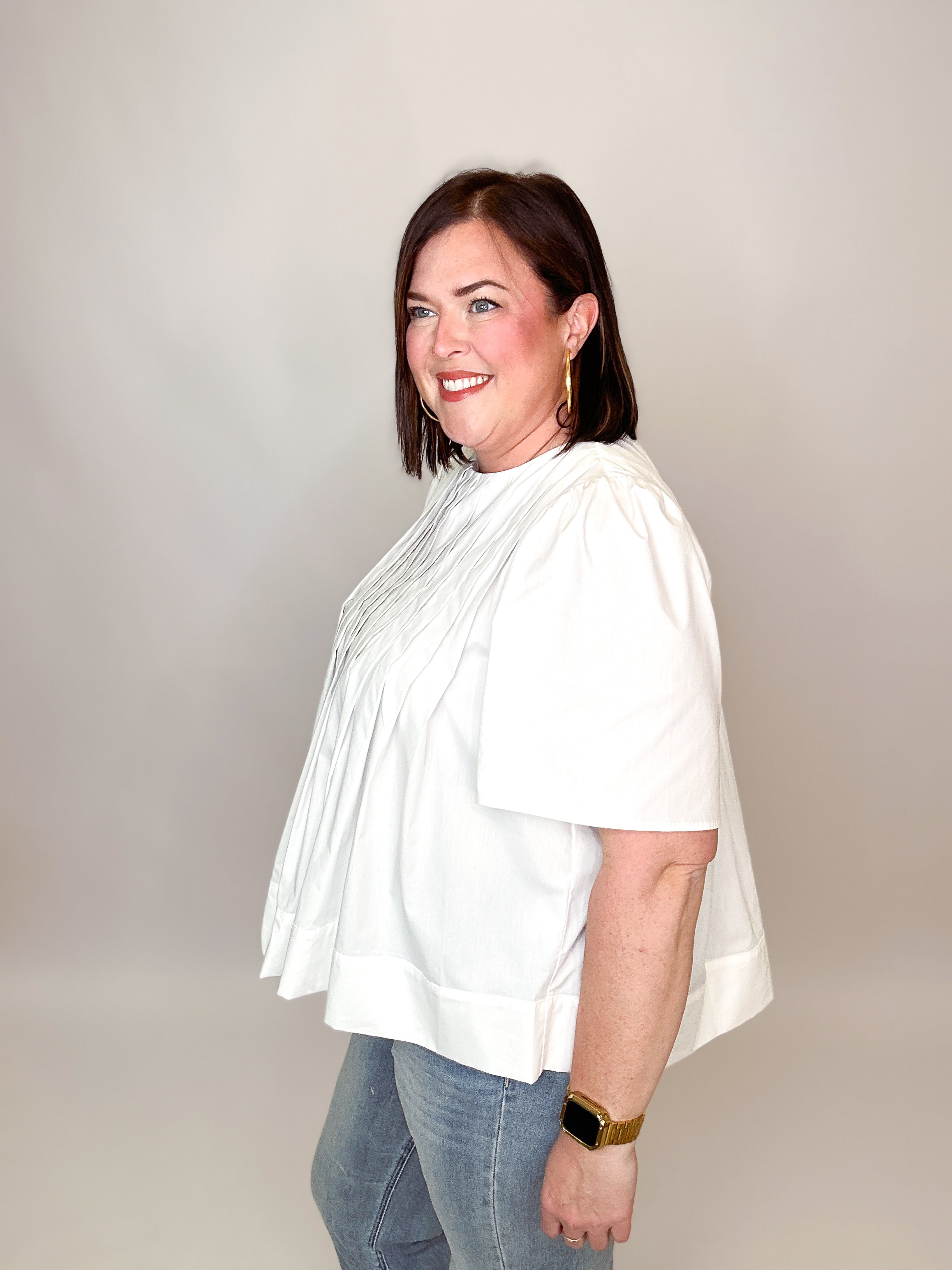This refined poplin top from Oddi brings understated elegance to your rotation. Crisp white fabric and a structured pleated front create polished dimension, while generous wide sleeves at the elbow deliver contemporary flair. The rounded neckline flatters every frame and transitions effortlessly from boardroom to brunch. Layer it over tailored trousers, pair with your favorite denim, or style with a skirt—this versatile essential adapts to your lifestyle with timeless sophistication.