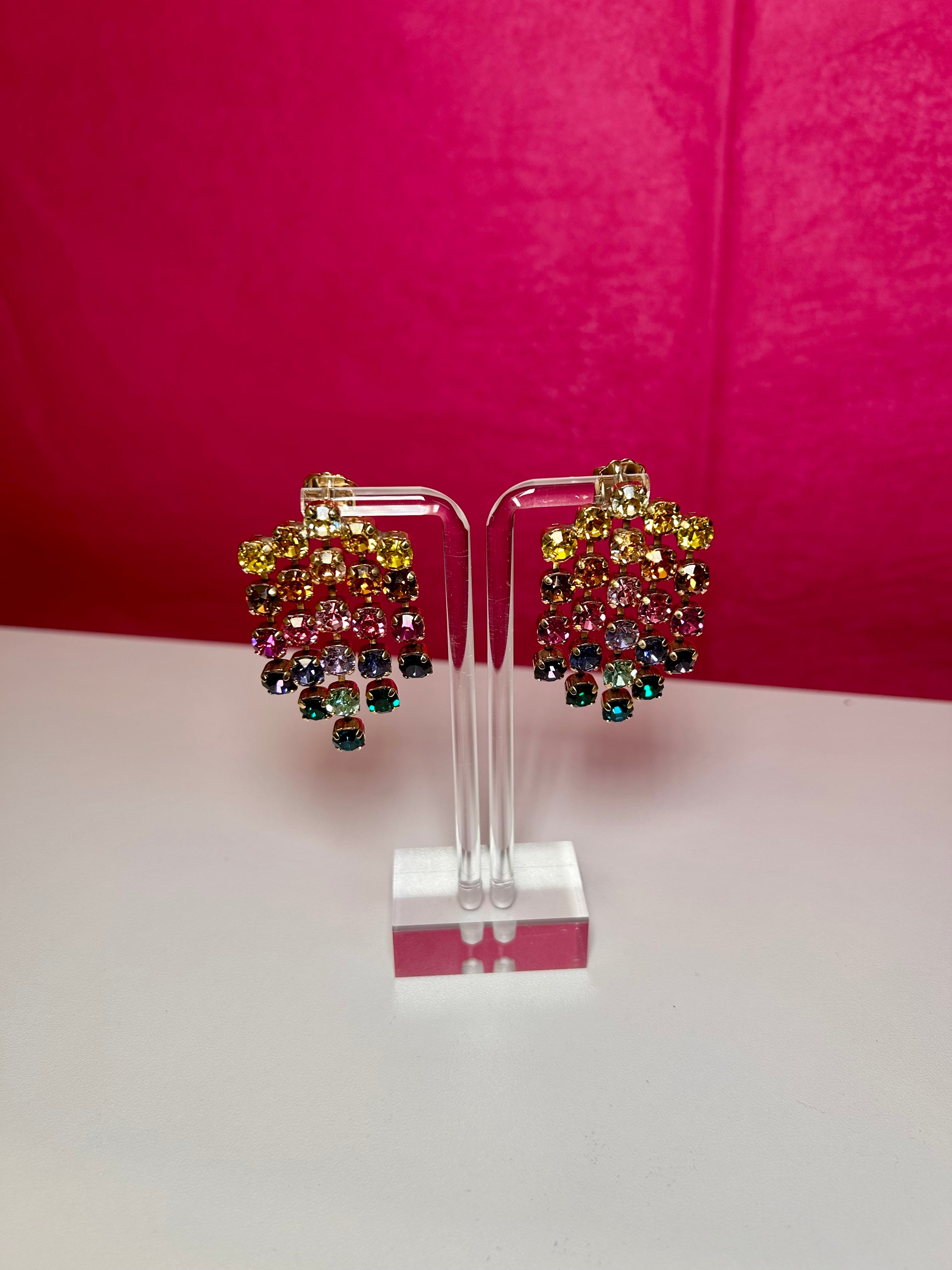 The Cady Earrings in Rainbow take luxury to a whole new level! Crafted from a light gold plating finish brass base metal, they are 2" in length and feature surgical steel posts. The showstoppers are the high quality crystals - totally dazzling, Get ready to sparkle!!
