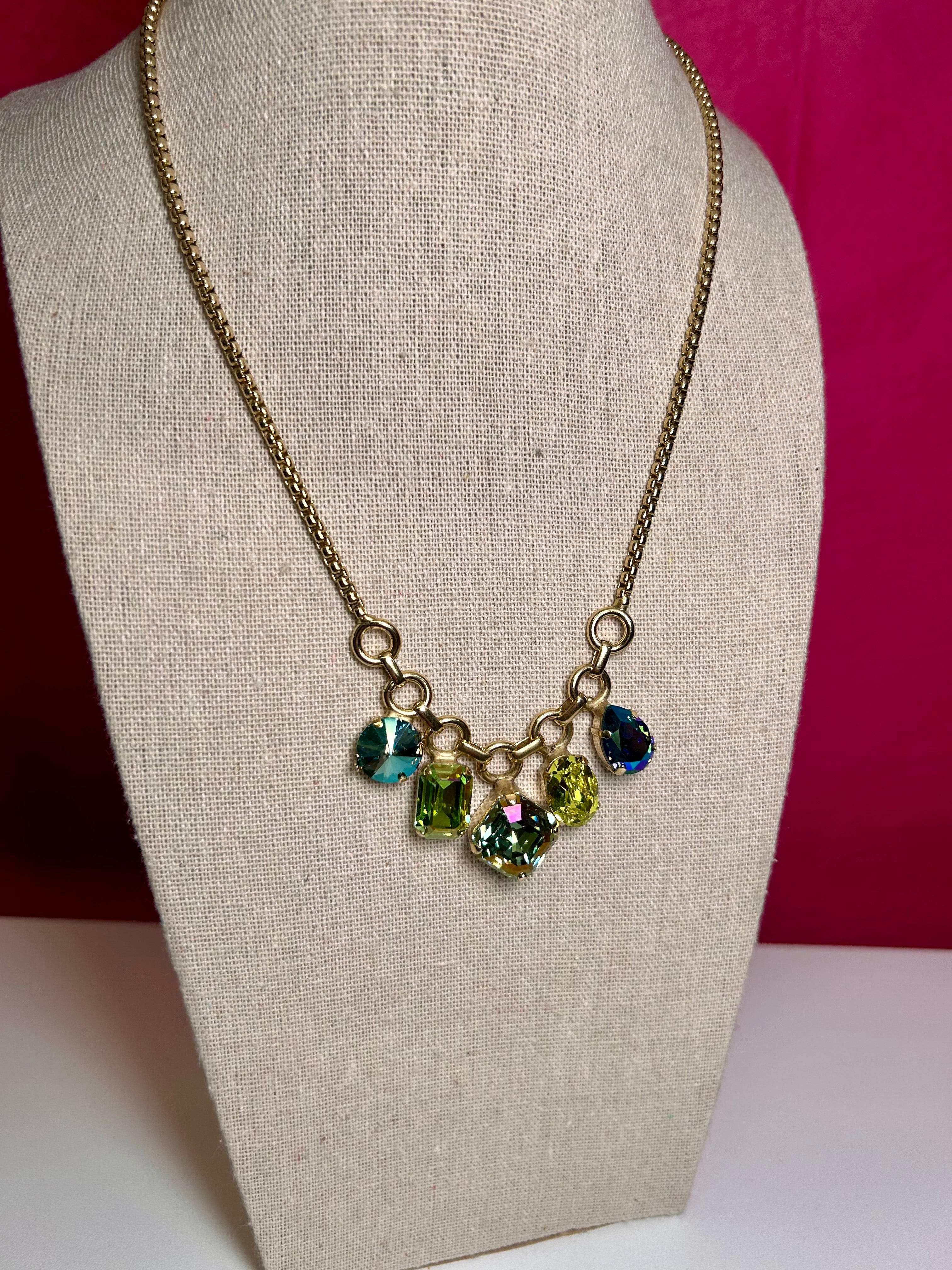 Add some sparkle to your look with the Lorene Necklace in Hawaiian Punch . Its antique gold plated brass base metal and high quality crystals give off a vintage vibe. Plus, the 16" length with a 3" extension allows for customizable wear.