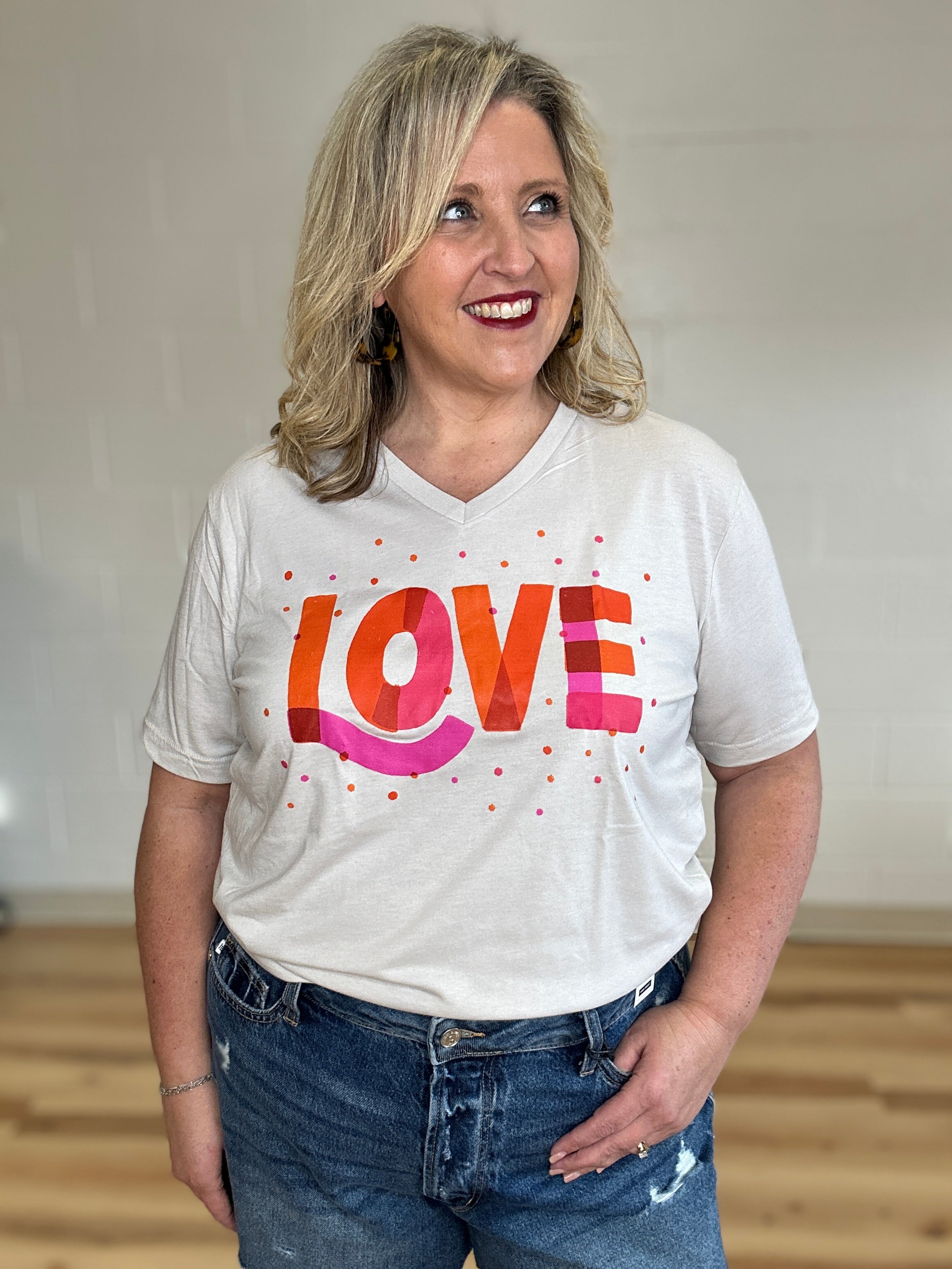 Spread the love in this soft cream t-shirt featuring a bold "LOVE" graphic in vibrant shades of orange and pink. Playful dot accents add a fun, confetti-style touch, making this tee an instant mood-booster. Designed with a flattering V-neckline and a relaxed fit, it's comfortable, lightweight, and perfect for everyday wear. Easy to style with denim, shorts, or layered under something, this tee is ideal for casual days, seasonal celebrations, or gifting to someone special.