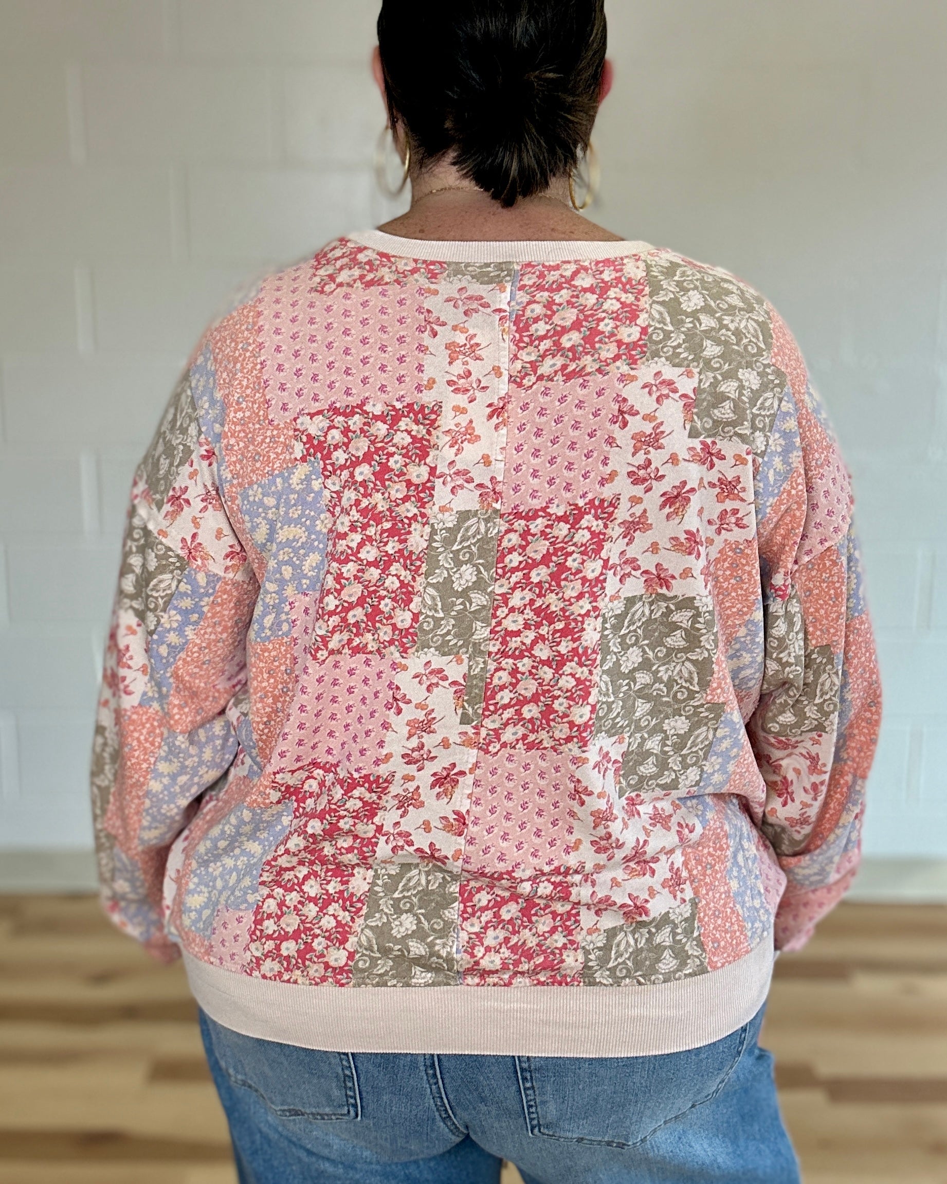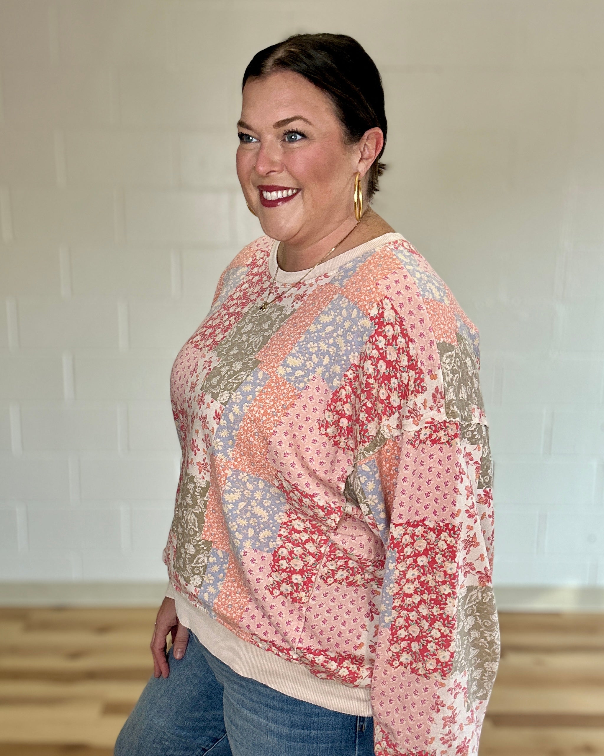 Embrace effortless style with this floral printed washed terry pullover that refuses to play it safe. The mineral-washed fabric delivers a lived-in, vintage vibe while the bold patchwork design makes a statement. Dropped shoulders and a rounded neckline create an unexpectedly cool silhouette, while banded ribbed cuffs and hem keep things grounded. Perfect as a standalone piece or paired with the matching lounge set for a coordinated look that's equal parts comfort and attitude.