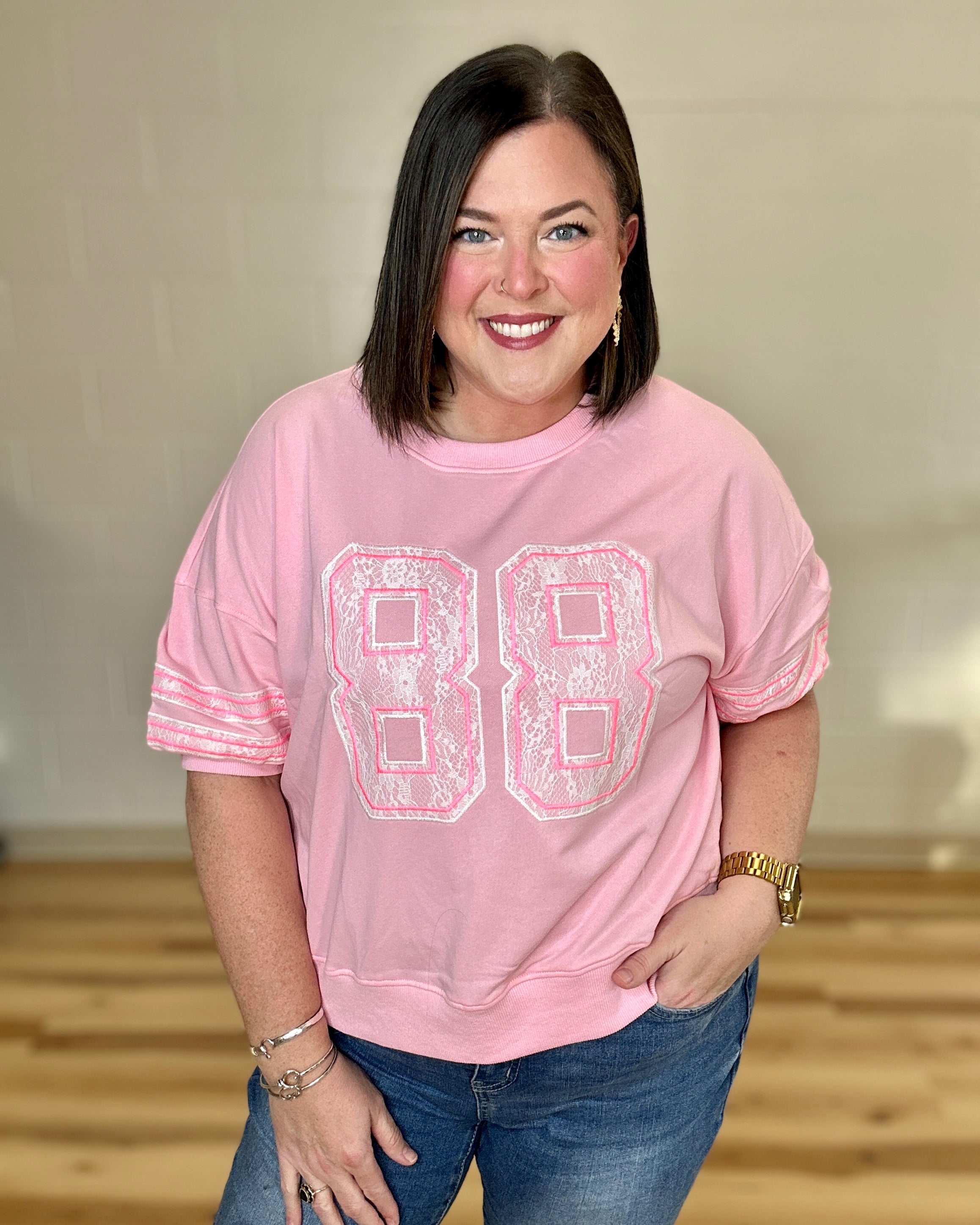 Throw on this cropped pullover for instant retro vibes. The contrast striped sleeves add playful dimension, while the bold "88" appliqué graphic makes a statement. Perfect for layering or wearing solo, it's the kind of piece that feels both cozy and cool. Grab yours and level up your casual rotation.