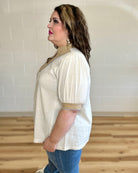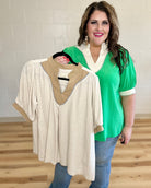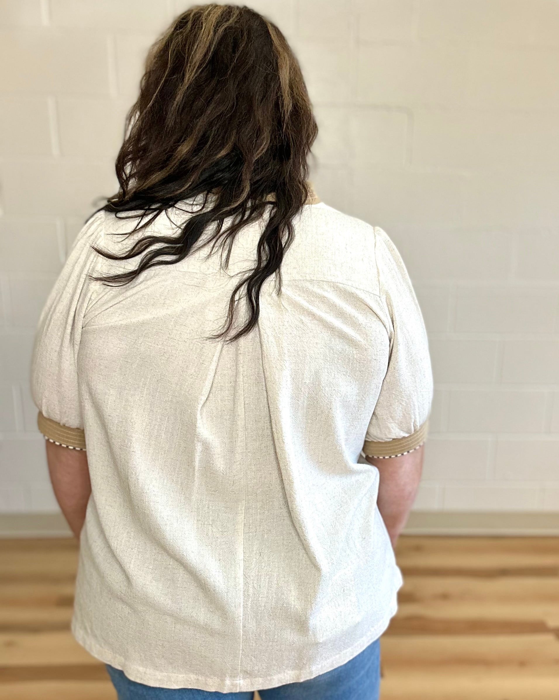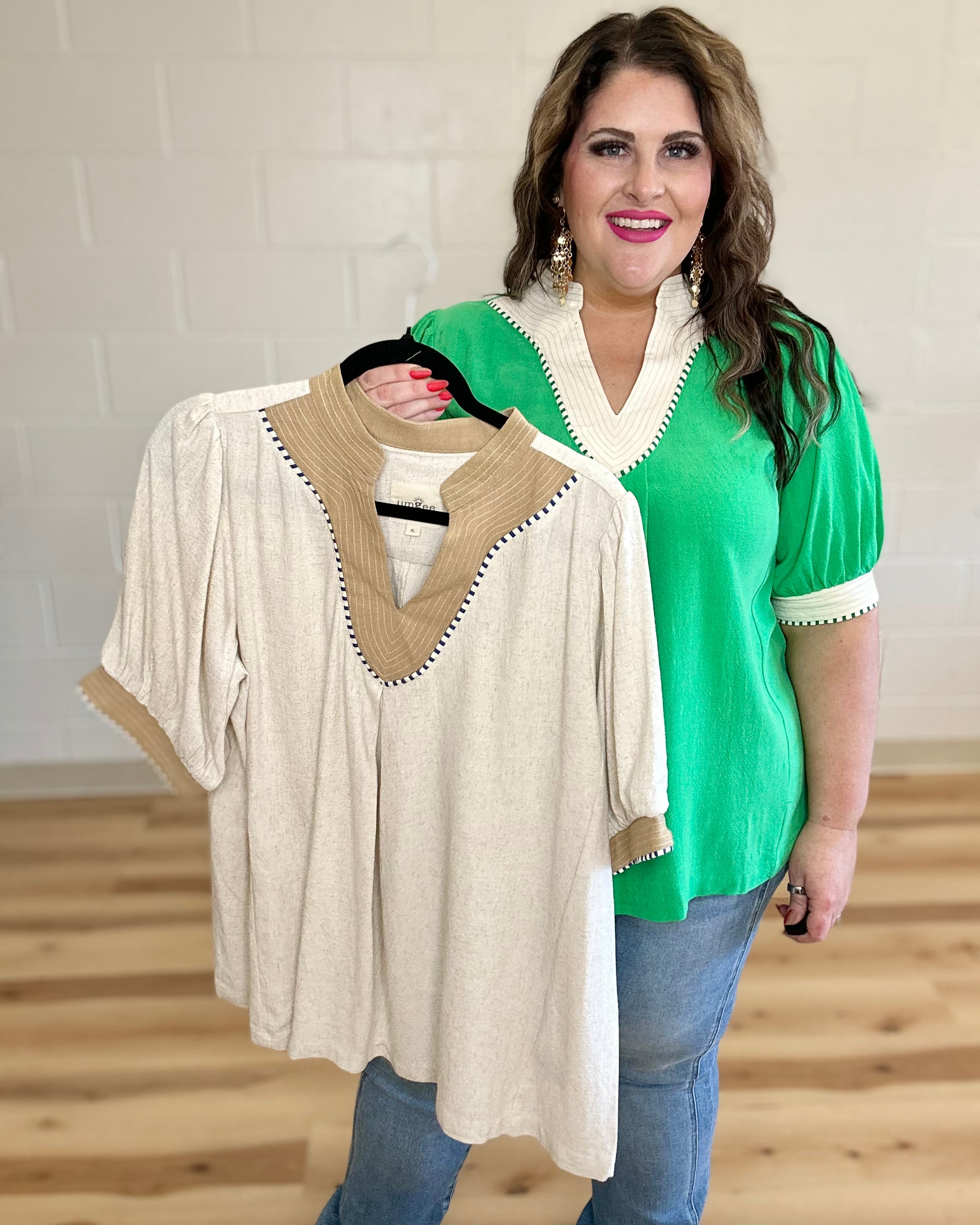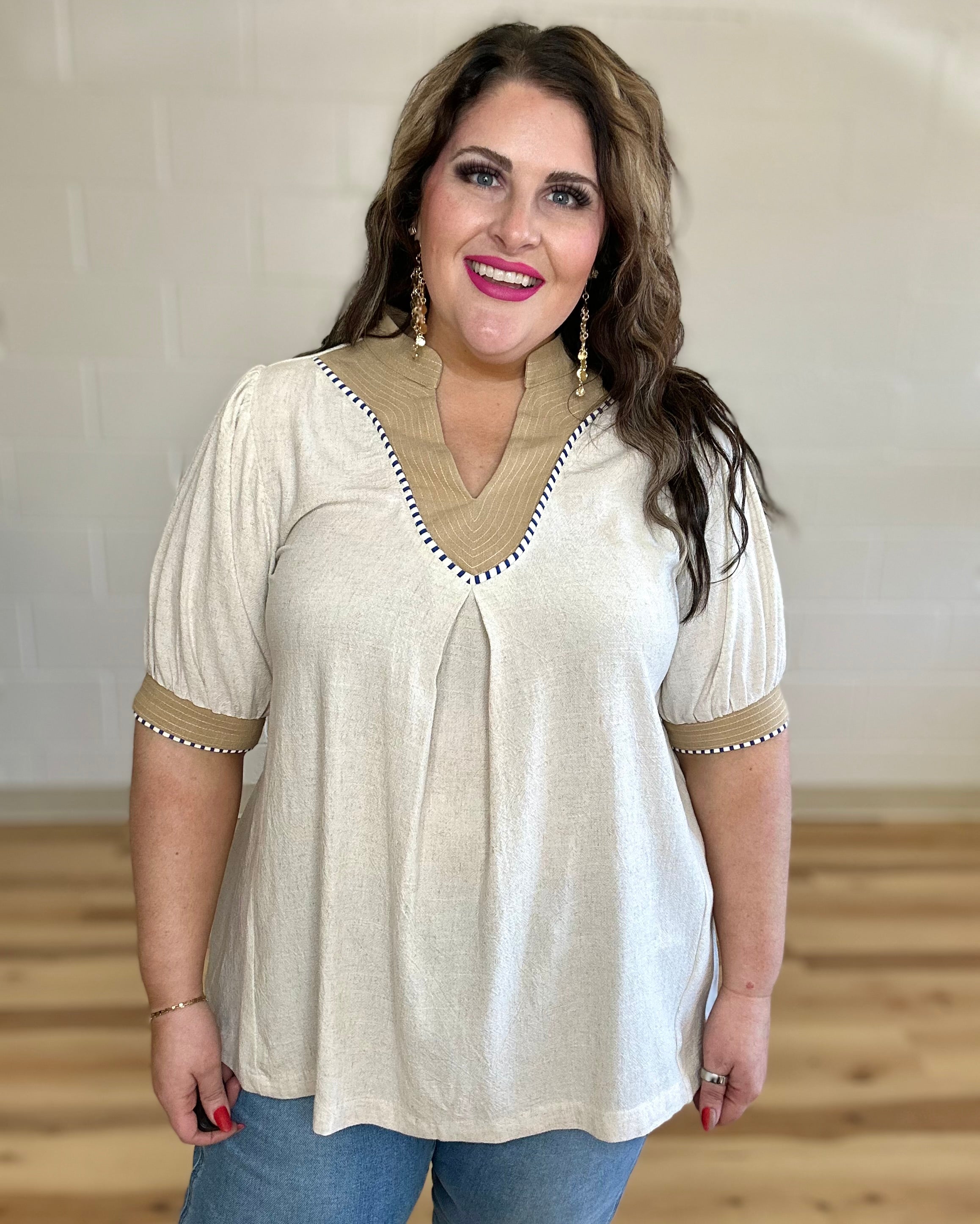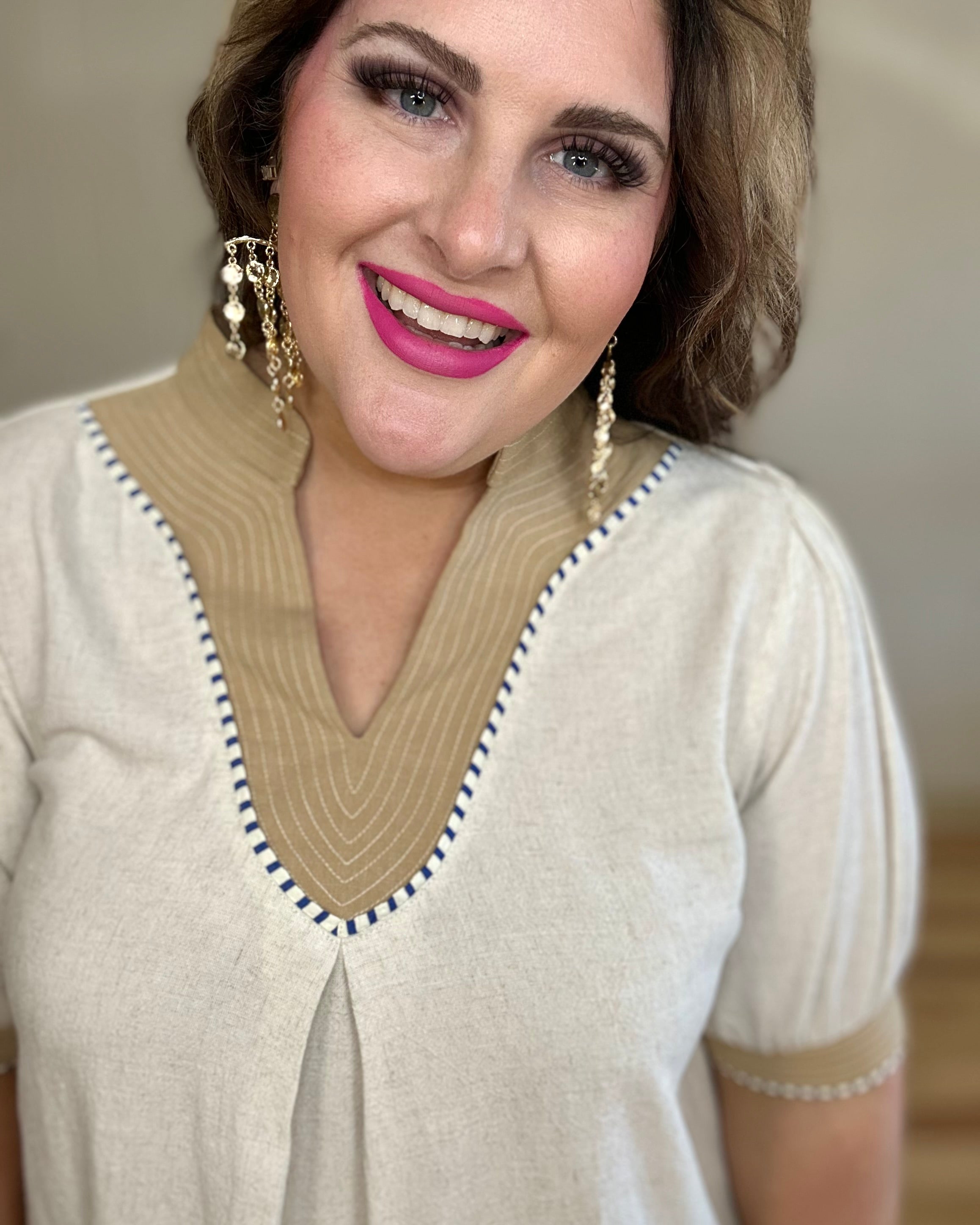 This Umgee piece blends comfort with style, offering a lightweight linen-blend fabric ideal for warm-weather wear. The elegant deep V neckline pairs beautifully with pintuck pleating and three-quarter sleeves, while the striped contrast trim brings a modern edge. Unlined for breathability, it's a versatile addition to any wardrobe.
