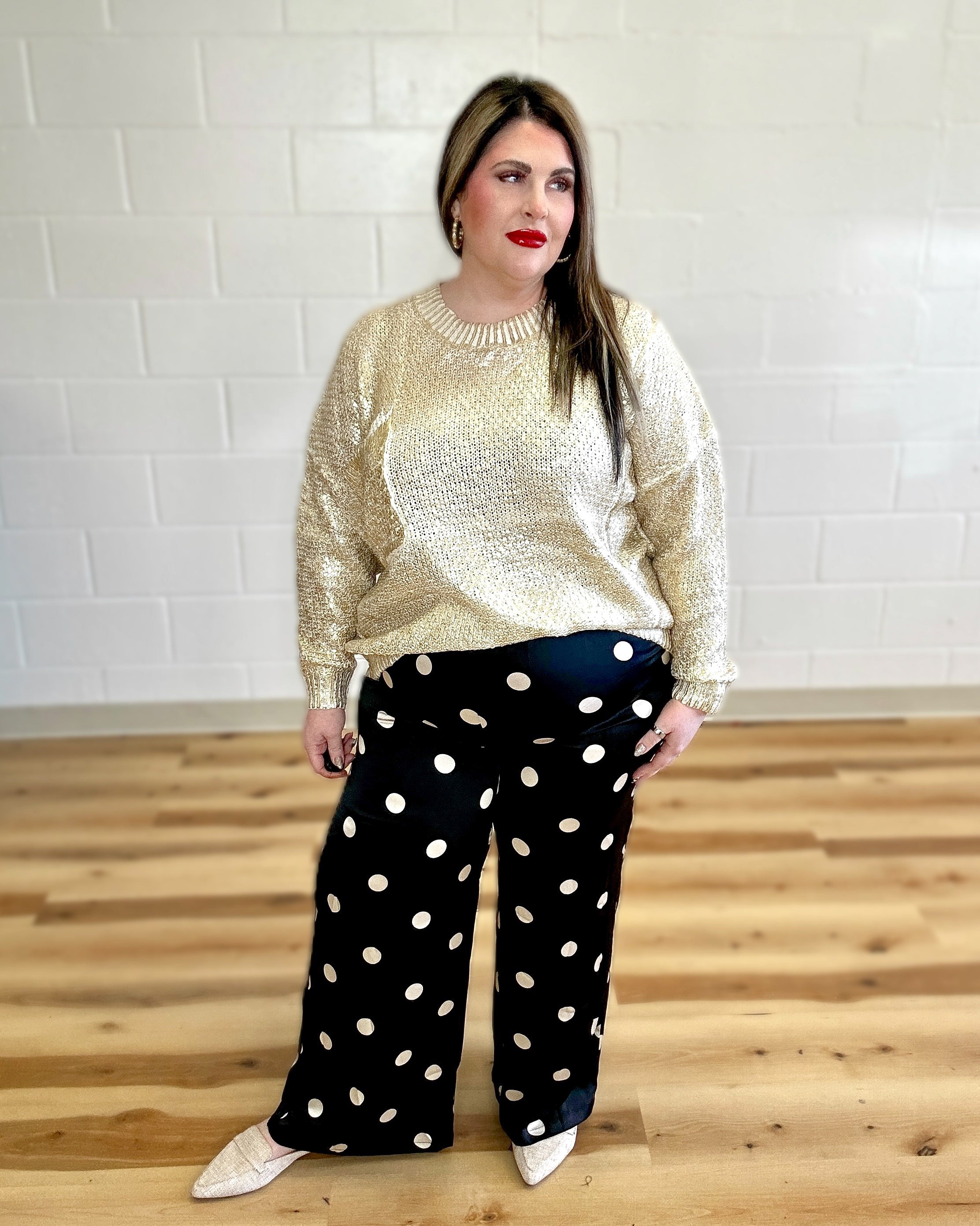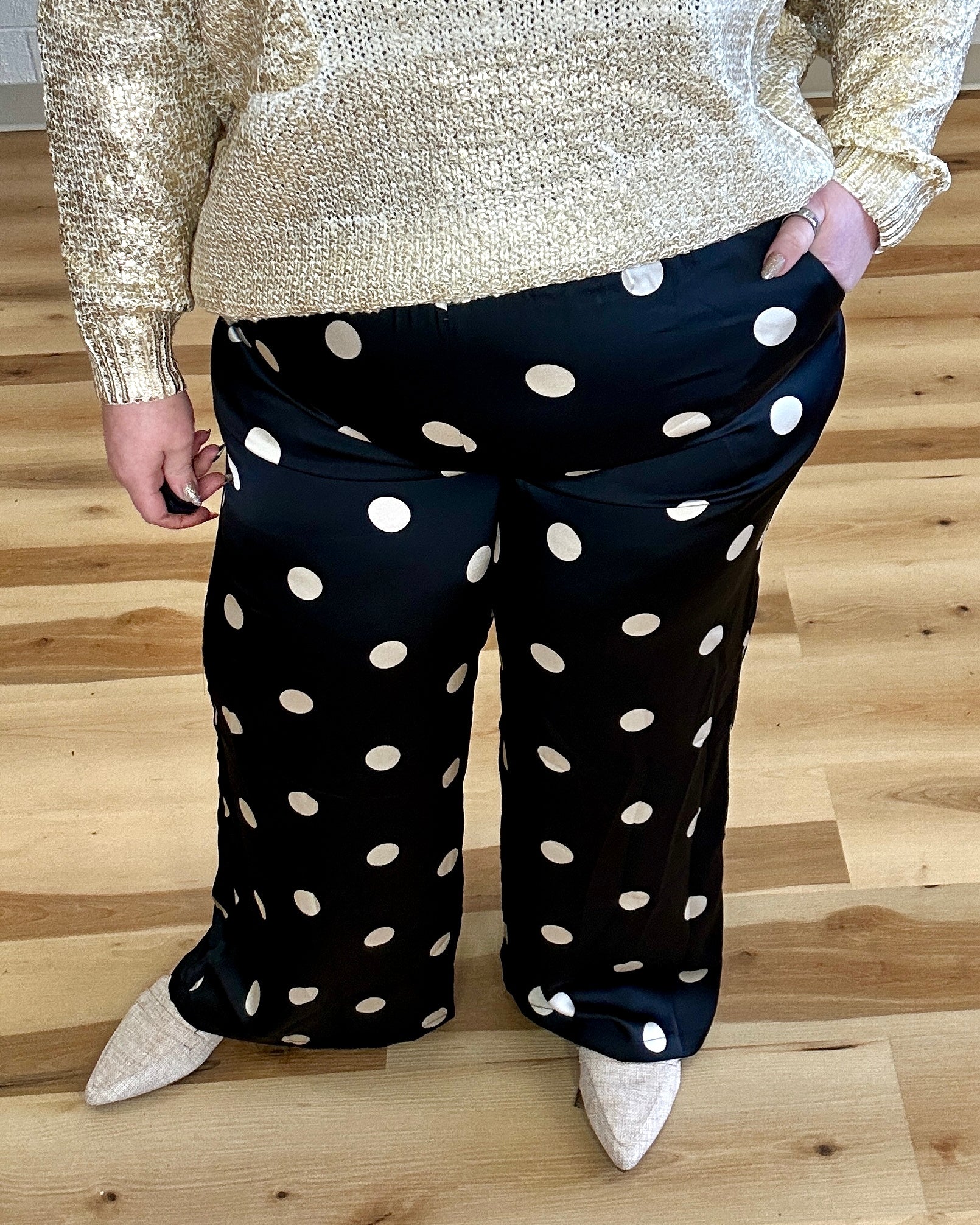 Elevate your wardrobe with these plus-size satin wide-leg pants from Davi&Dani. Featuring a relaxed, beautifully draped silhouette and flattering elastic waistband, they deliver refined sophistication with an effortless feel. The polka dot pattern adds playful charm to this versatile piece that transitions seamlessly from day to evening. Perfect for those seeking comfort without compromising on style.